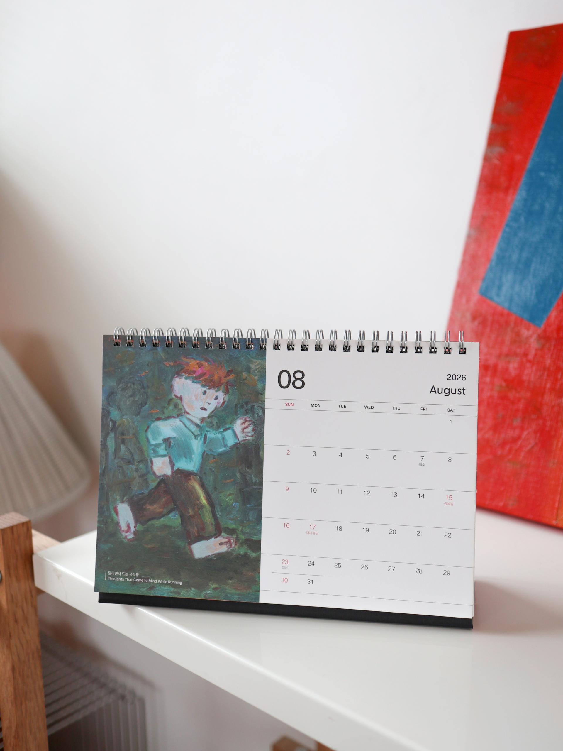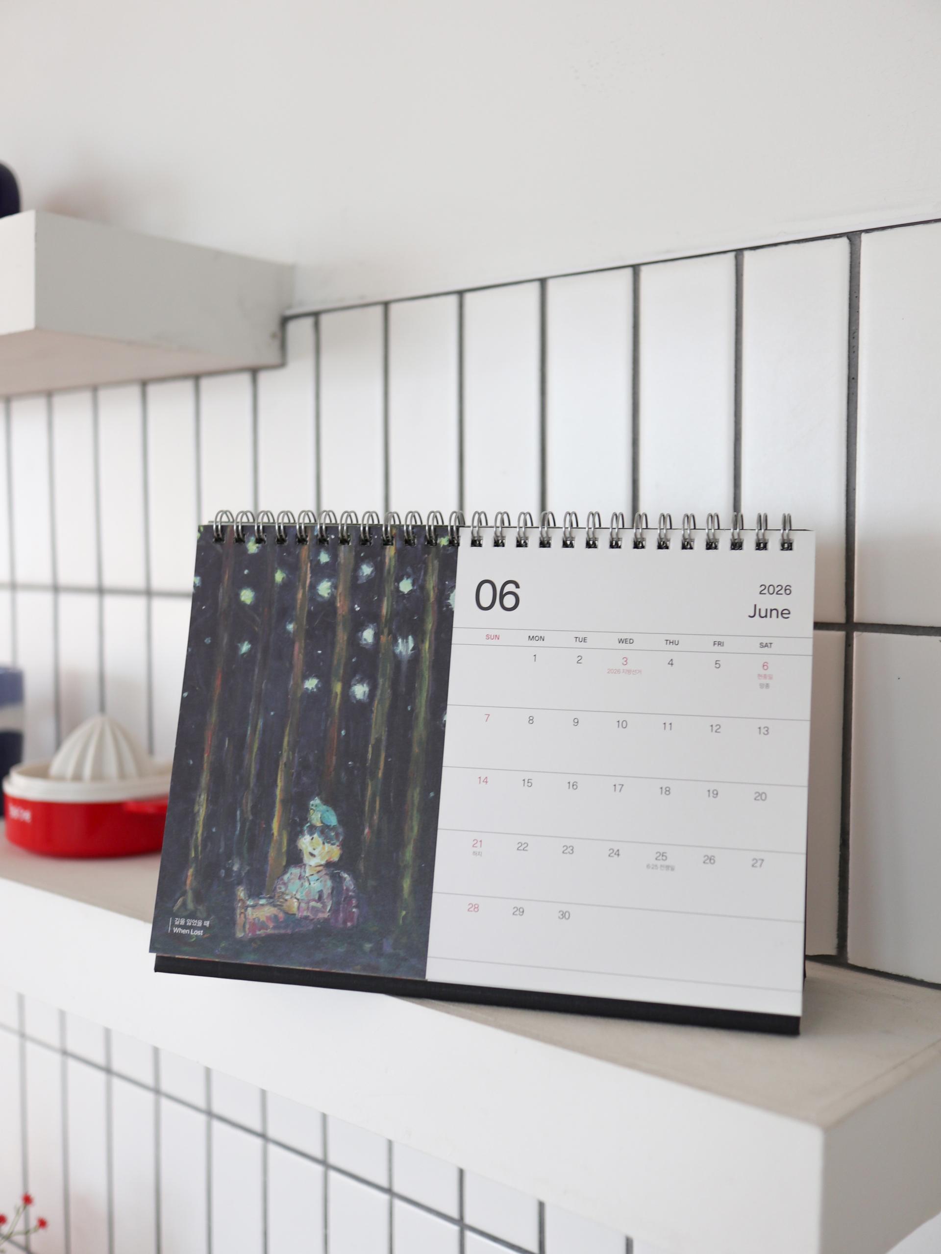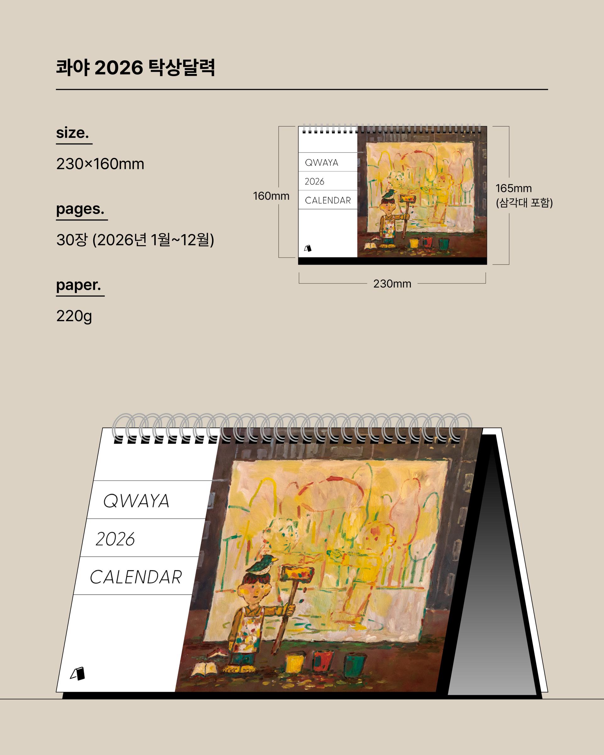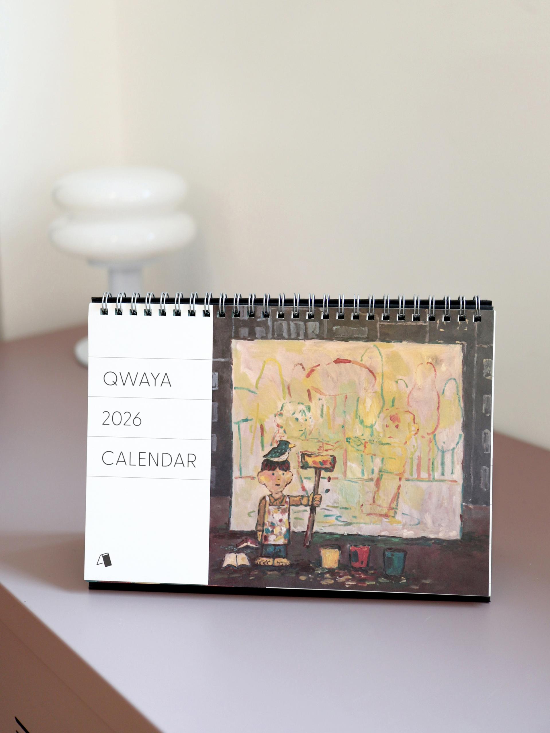 콰야 작가의 신작을 모아 2026년 탁상달력으로 만들었습니다. 가로 230mm × 세로 160mm 크기로, 작품을 감상하며 일정을 기록하기에 충분한 크기입니다. 두께감 있는 모조지 220g을 사용해 연필, 수성펜, 볼펜 모두 자연스럽게 필기할 수 있습니다. 각 달에는 작품명이 하단에 표기되어 있으며, 달력 외에도 추가 작품 페이지를 수록해 더욱 풍성하게 구성했습니다. 한 해 동안, 책상 위에서 콰야 작가의 작품과 함께 시간을 보내보세요.