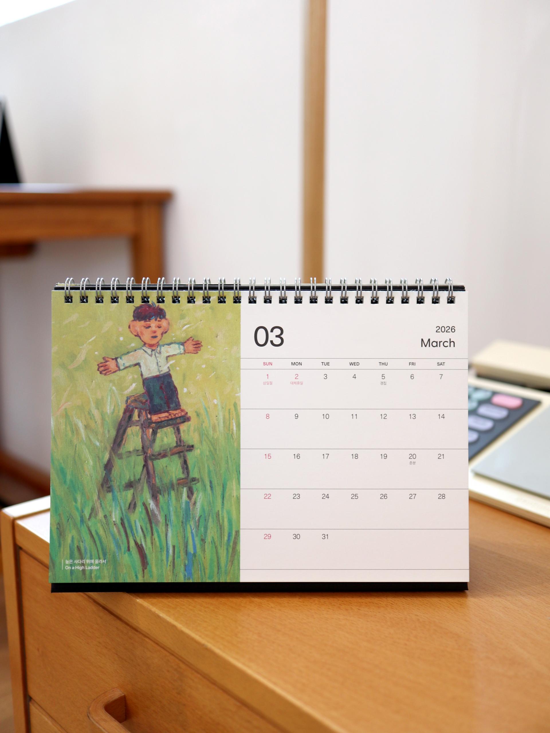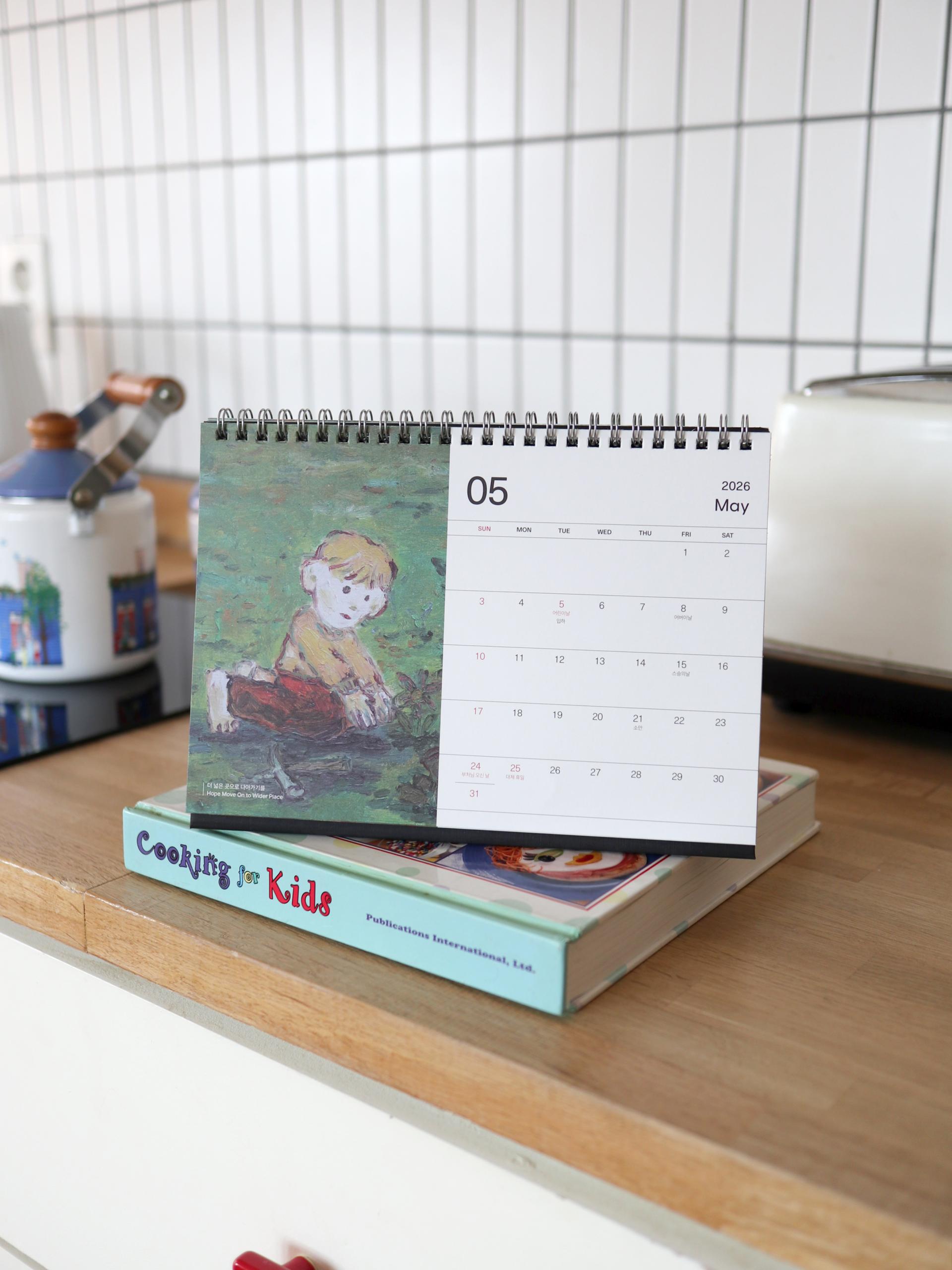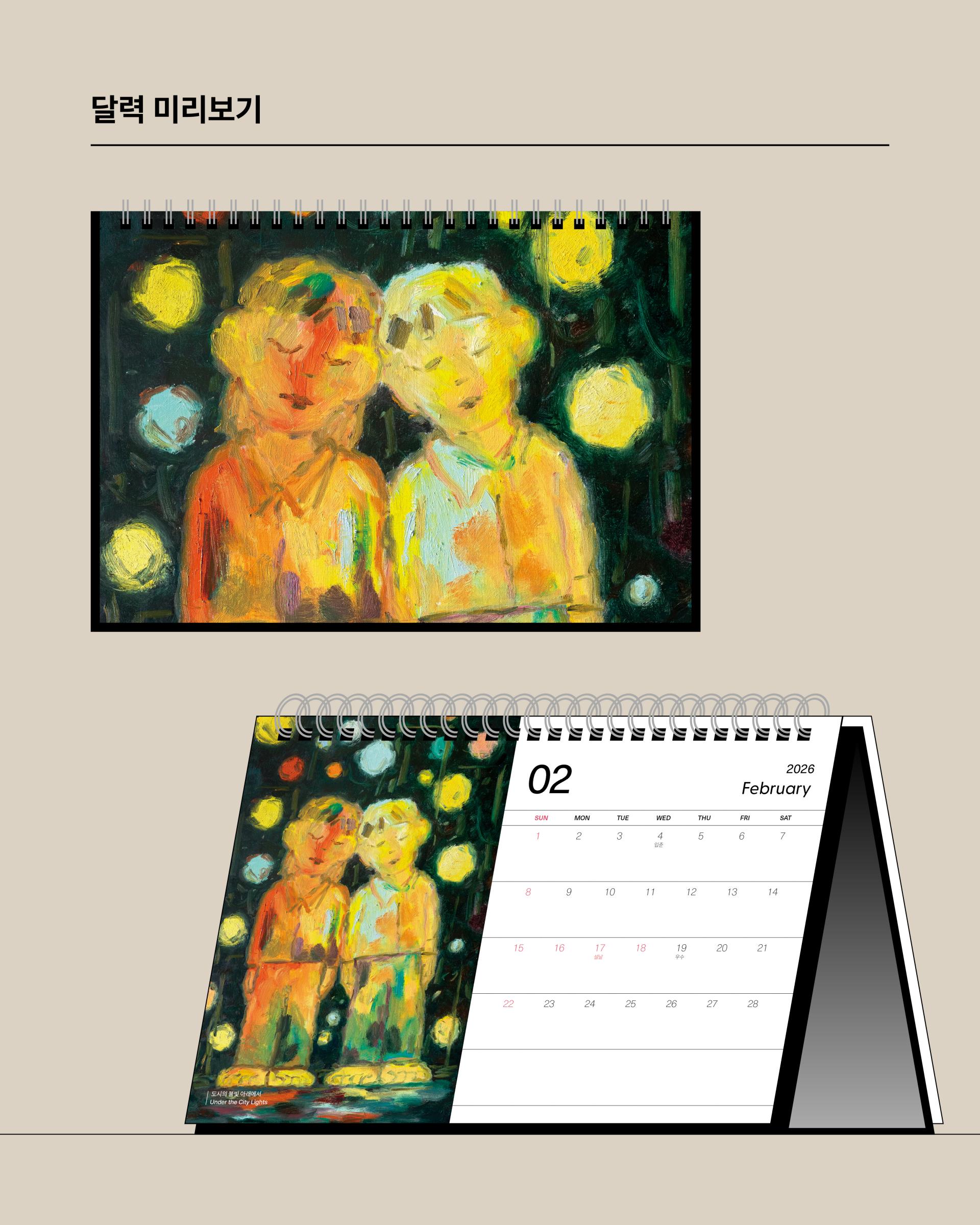 콰야 작가의 신작을 모아 2026년 탁상달력으로 만들었습니다. 가로 230mm × 세로 160mm 크기로, 작품을 감상하며 일정을 기록하기에 충분한 크기입니다. 두께감 있는 모조지 220g을 사용해 연필, 수성펜, 볼펜 모두 자연스럽게 필기할 수 있습니다. 각 달에는 작품명이 하단에 표기되어 있으며, 달력 외에도 추가 작품 페이지를 수록해 더욱 풍성하게 구성했습니다. 한 해 동안, 책상 위에서 콰야 작가의 작품과 함께 시간을 보내보세요.