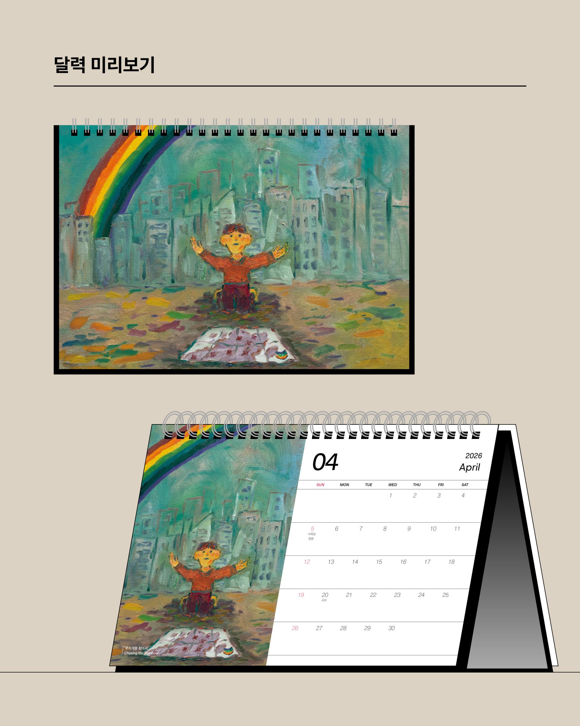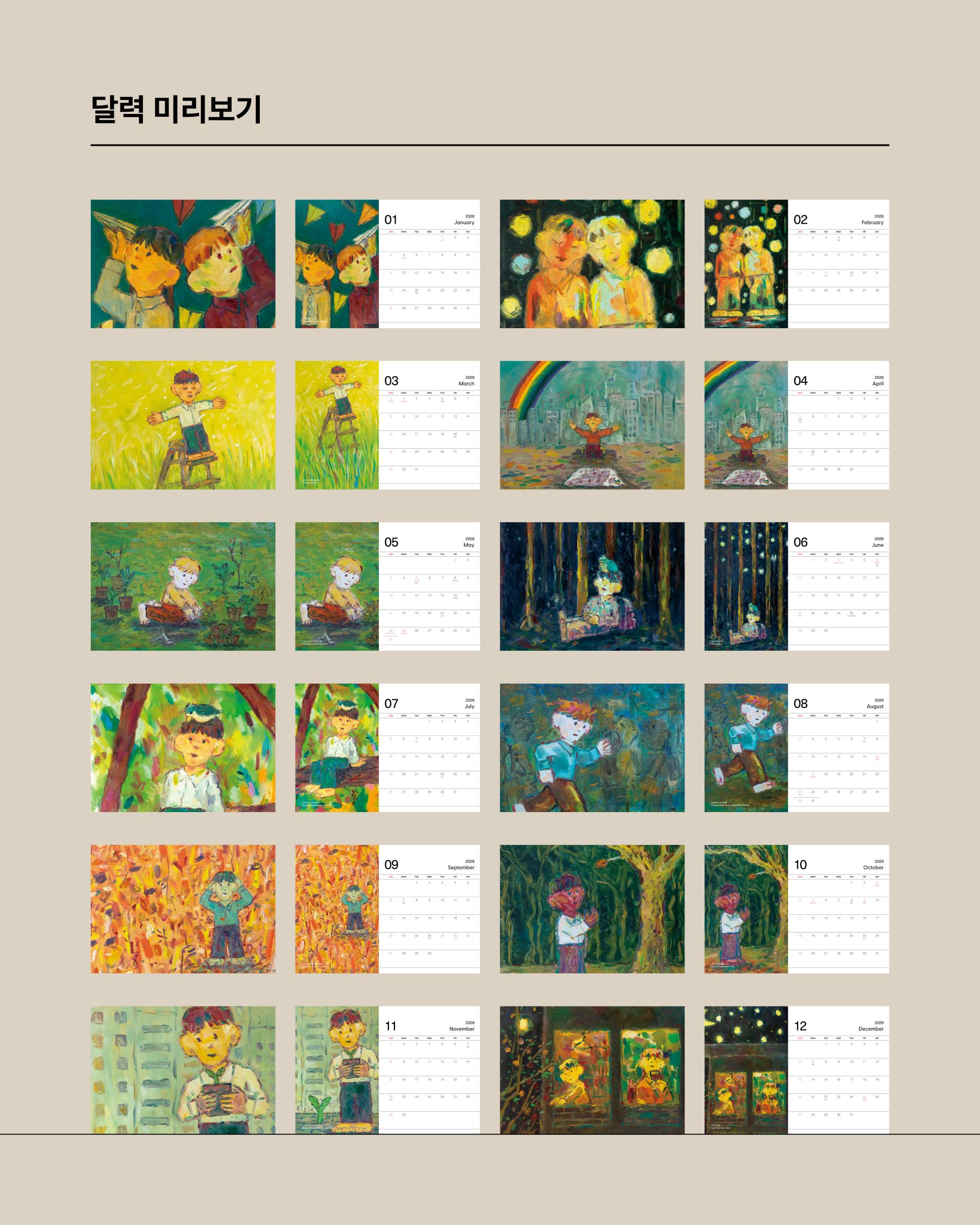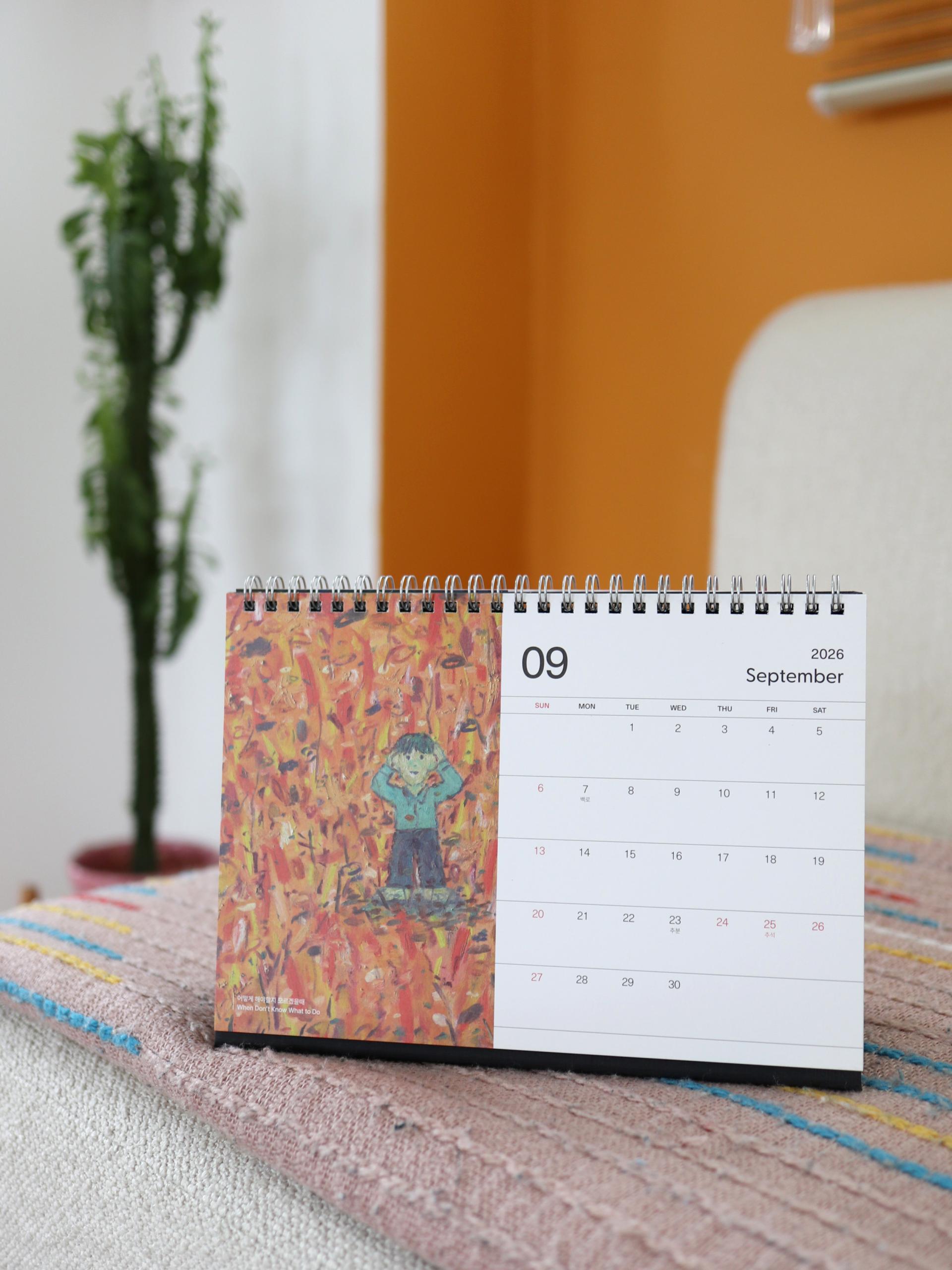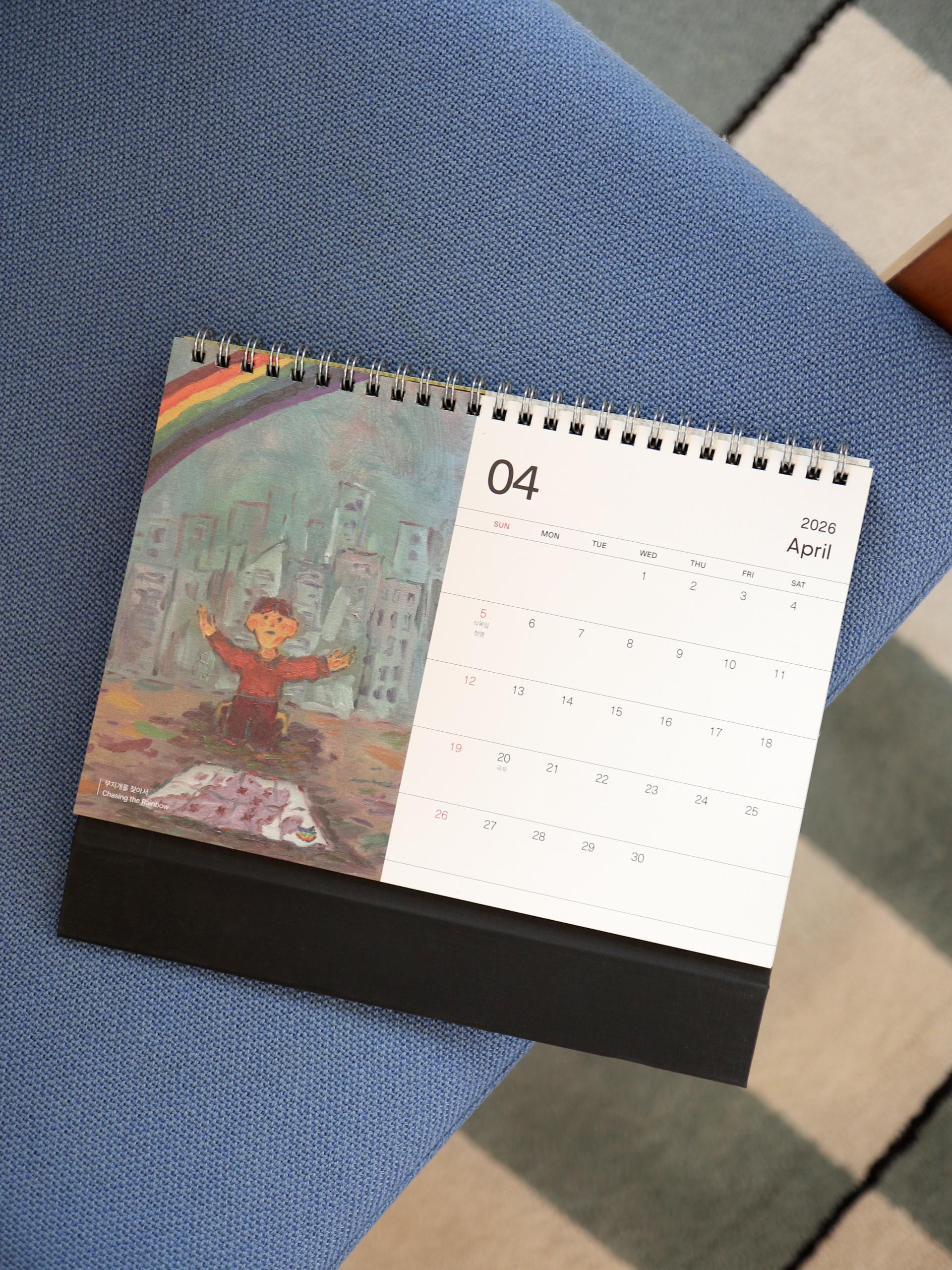 콰야 작가의 신작을 모아 2026년 탁상달력으로 만들었습니다. 가로 230mm × 세로 160mm 크기로, 작품을 감상하며 일정을 기록하기에 충분한 크기입니다. 두께감 있는 모조지 220g을 사용해 연필, 수성펜, 볼펜 모두 자연스럽게 필기할 수 있습니다. 각 달에는 작품명이 하단에 표기되어 있으며, 달력 외에도 추가 작품 페이지를 수록해 더욱 풍성하게 구성했습니다. 한 해 동안, 책상 위에서 콰야 작가의 작품과 함께 시간을 보내보세요.