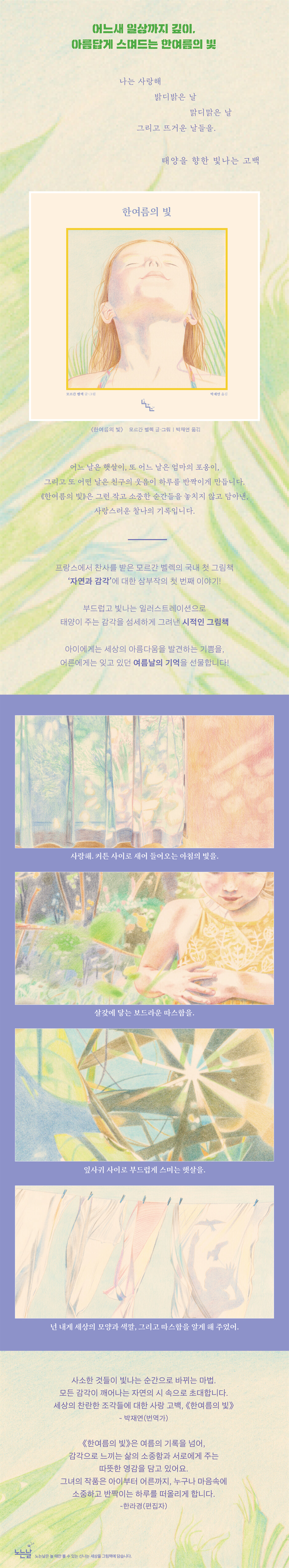 어느 날은 햇살이, 또 어느 날은 엄마의 포옹이, 그리고 또 어떤 날은 친구의 웃음이 하루를 반짝이게 만듭니다. 《한여름의 빛》은 그런 작고 소중한 순간들을 놓치지 않고 담아낸, 사랑스러운 찰나의 기록입니다. 커튼 사이로 스며드는 부드러운 아침 햇살, 창가에 비치는 은은한 빛, 반짝이는 물결과 나뭇잎 사이로 스며드는 햇살, 머릿결을 스치는 빛의 조각들까지. 작가는 "나는 사랑해"라는 고백으로 시작해, 이 모든 빛의 순간들을 따뜻하게 노래합니다.
