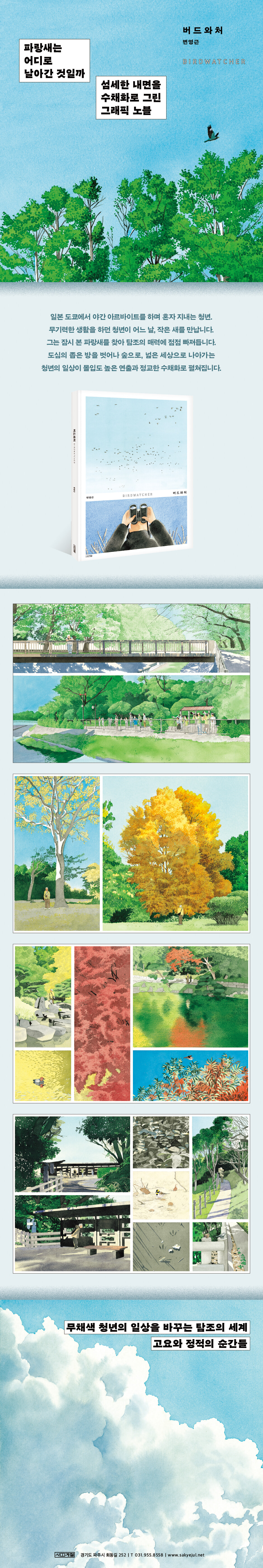 변영근 작가의 그래픽 노블 『버드와처』(Birdwatcher)는 제목 그대로 탐조인을 그리면서 새를 보는 것에 대해 이야기한다. 탐조는 새를 조용히 기다리고, 세심히 관찰하고, 발견하는 기쁨을 나누는 것. 탐조 활동은 쌍안경을 사고 도감에서 새 이름을 찾고 새 관련 공부를 하는 것에 그치지 않는다. 청년은 새를 바라보면서 어느새 자신을 있는 그대로 바라보게 된다. 파랑새를 찾는 여정을 통해 ‘나’를 발견한다. 인트로 장면에서 무리와 다른 색깔로 하늘을 날던 흰 새는 하얀 머리와 옷차림의 청년으로 자연스레 이어지고 청년은 탐조에 깊이 빠져들수록 옷의 색깔이 파랑새와 비슷해진다. 새의 이야기는 청년의 이야기로 포개지며 전개된다. 밤과 낮, 안과 밖, 어두움과 빛의 대비를 통해 인물의 심리 변화가 부드럽게 드러난다.