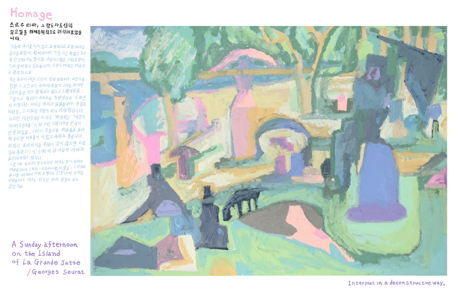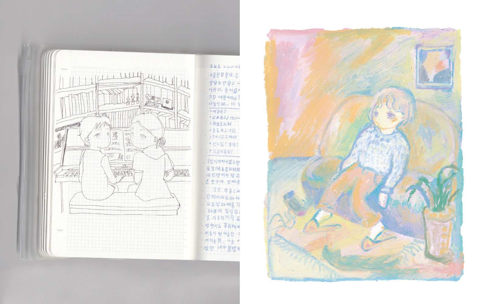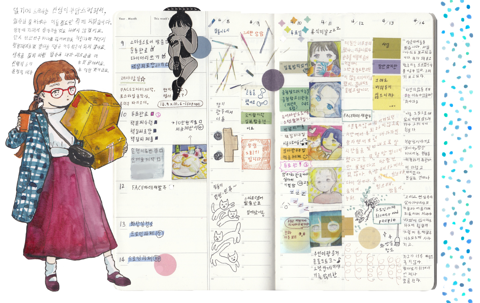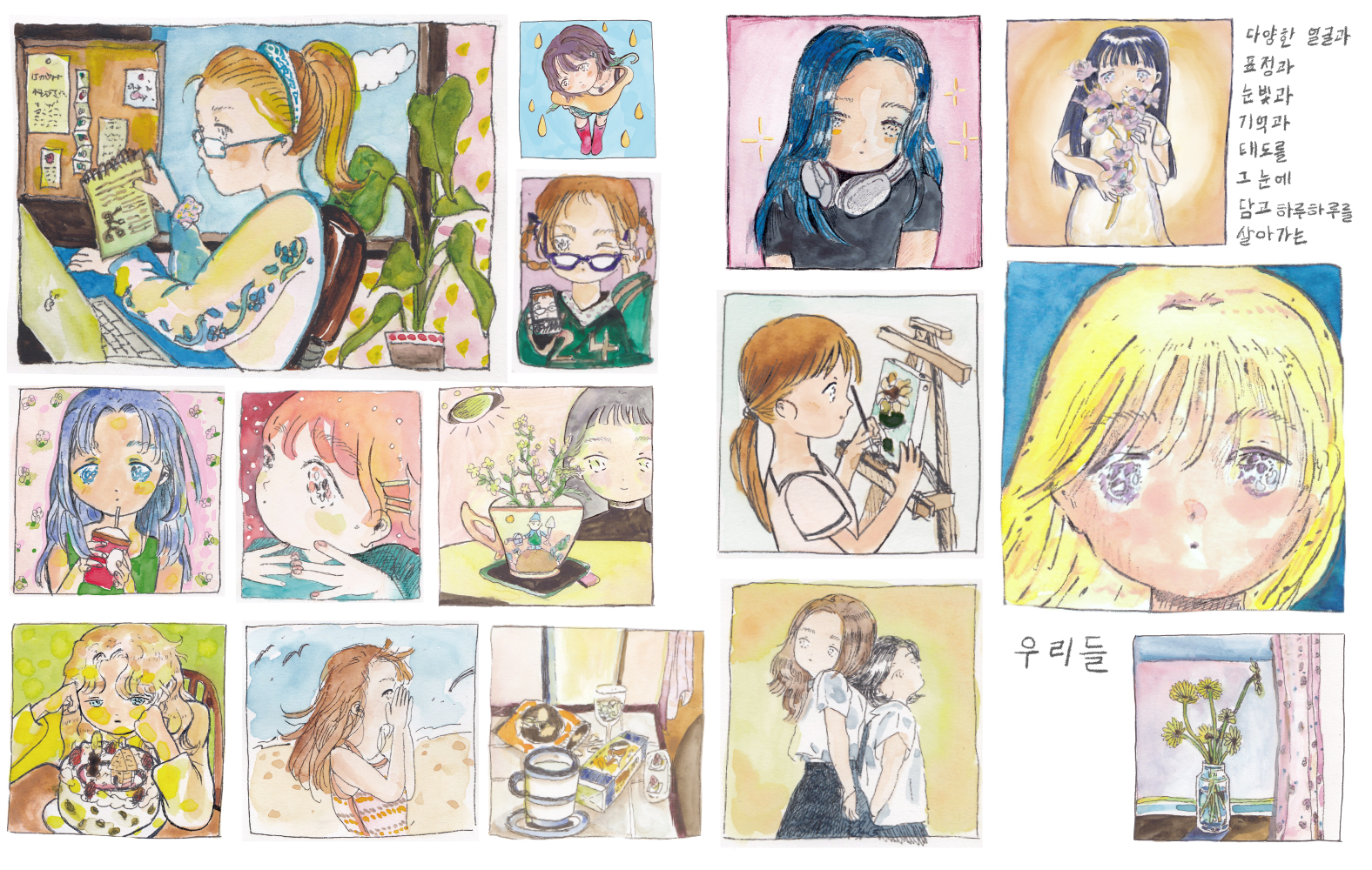 작품집은 대부분 비슷한 형식을 띈다. 두꺼운 하드커버, 실제본, 작가 약력, 작가 소개, 작업 사진, 작가의 글, 스케치… 장르화된 책은 깔끔하고 분류하기 편하지만, 예술가를한가지 소개방식으로 설명하는 것이 옳은 방식인가 라는 질문 또한 마음 속에 맴돌았다. 물론 특이한방식의 작품집도 존재한다. 하지만 너무 특이해 현대예술 작품이 되는 작품집 말고, 대중에게 다가갈수 있되 약간 변주를 섞도록 했다. 간단히 말하자면 “작품집 형식에 대한 시도” 이다. 그리하여 작품집에 ‘손글씨, 회화, 일러스트’ 세 장르를 혼합하였다. ‘무엇이 작품이고 무엇이 작품이지 않을까?’ 그것이 이 책이 남기는 작은 의문점이자 매력이다.
