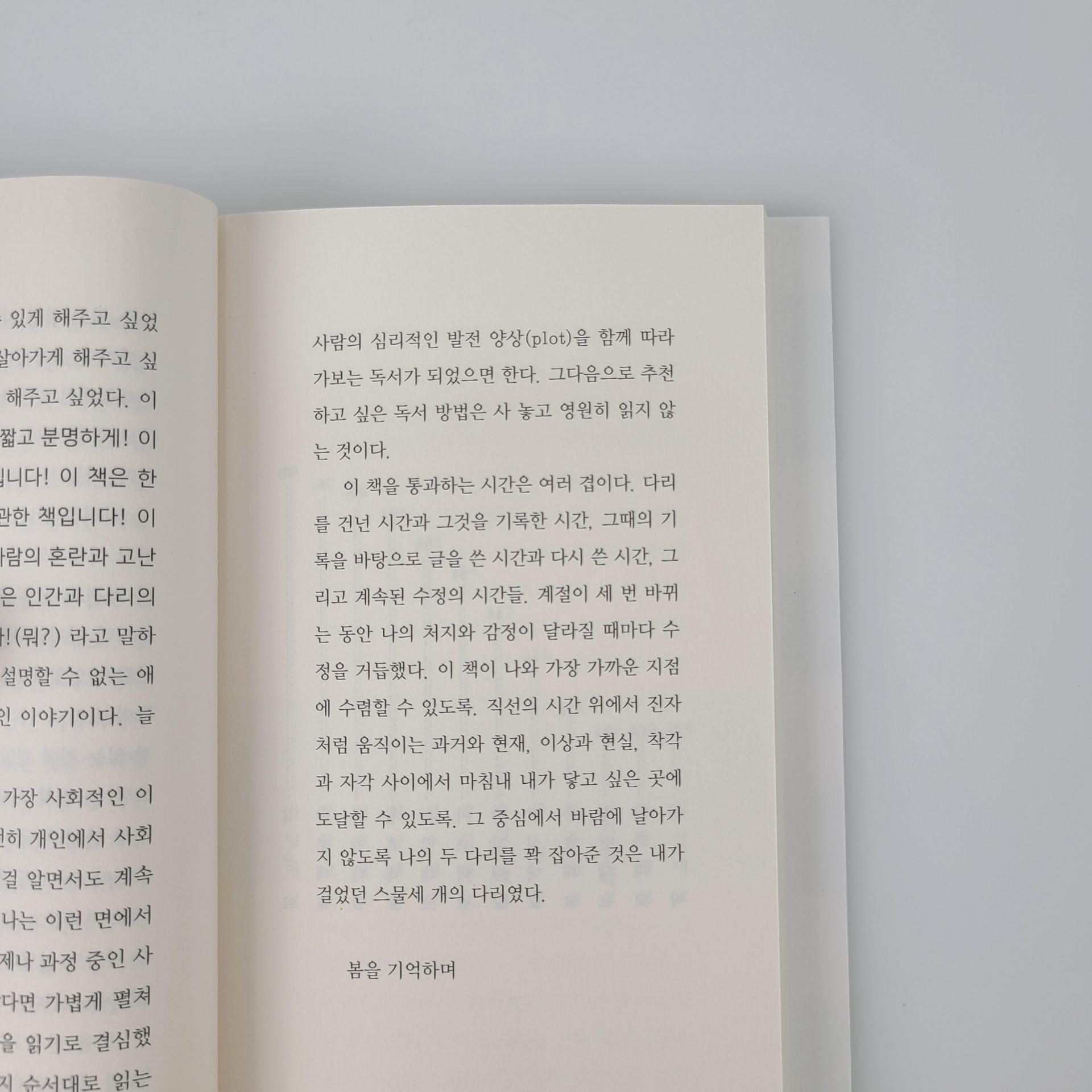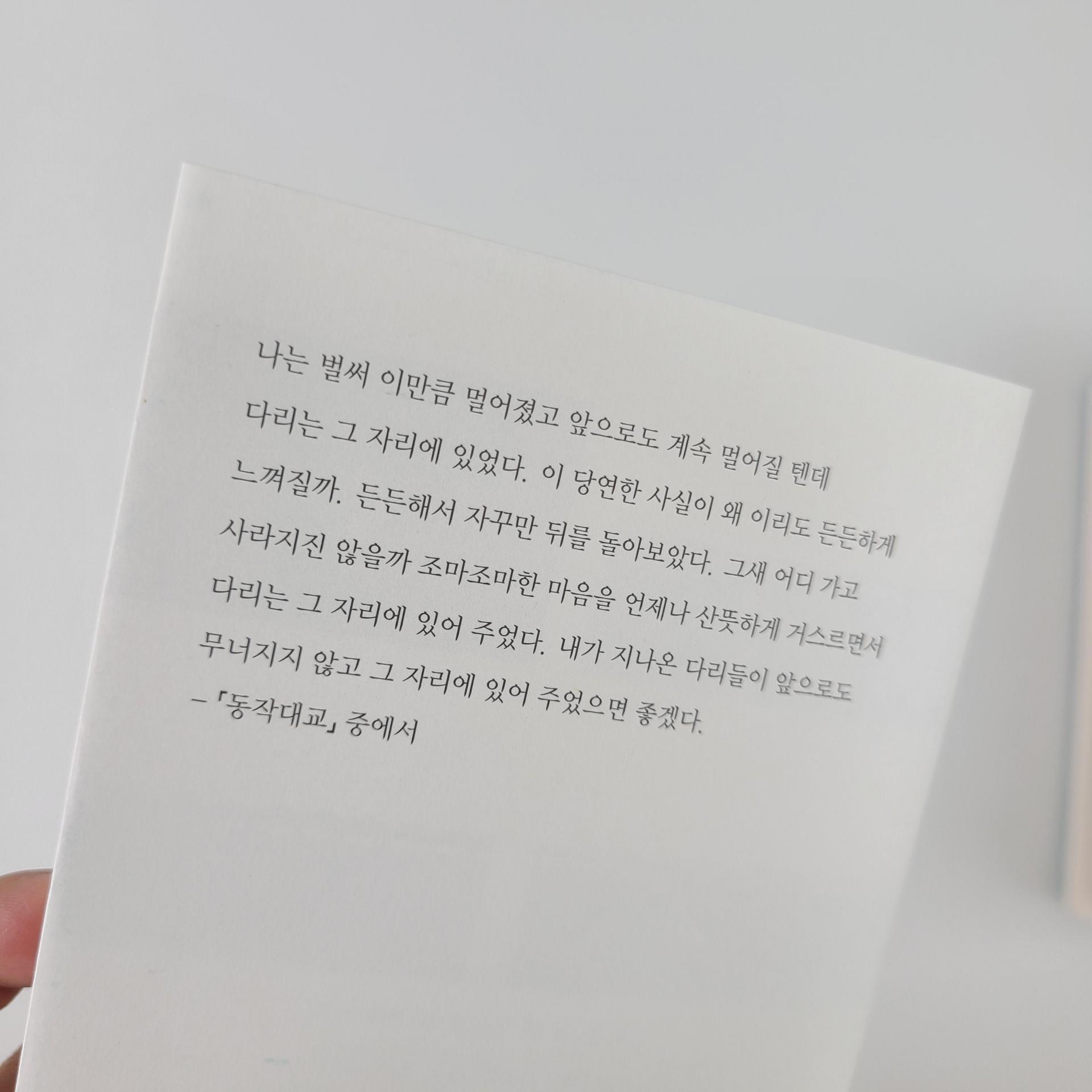 수십 번 연습한 이 말을 못해서 결국 혼자 다 걷고 만 어느 다리 산책자의 이야기. 혼자 걸은 덕에 사람이 아닌 다리와 정을 쌓게 된 한 사람의 혼란과 고난 극복기.