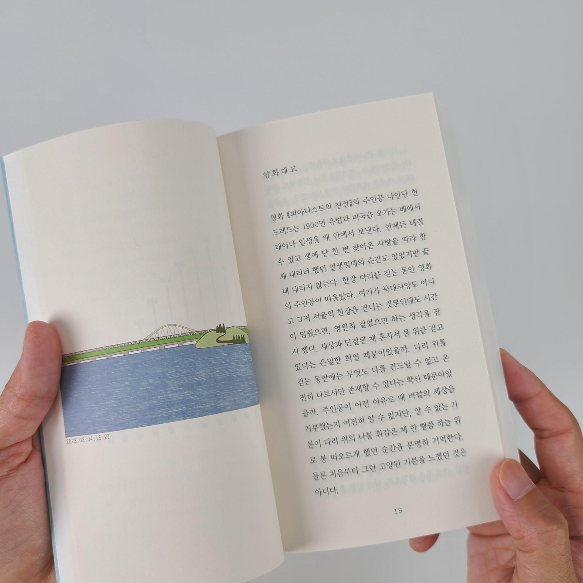 한 번 걸었던 다리는 모양을 기억하기 위해 그림을 그려두었다. 그날의 날씨와 기분을 강물의 색으로 표현해서 똑같은 한강이지만 똑같은 빛깔은 어디에도 없다. 내지에는 다리를 건넌 순서대로, 겉싸개 안쪽에는 서쪽에서 동쪽까지 한강 다리가 놓인 순서대로 그림을 모았다.