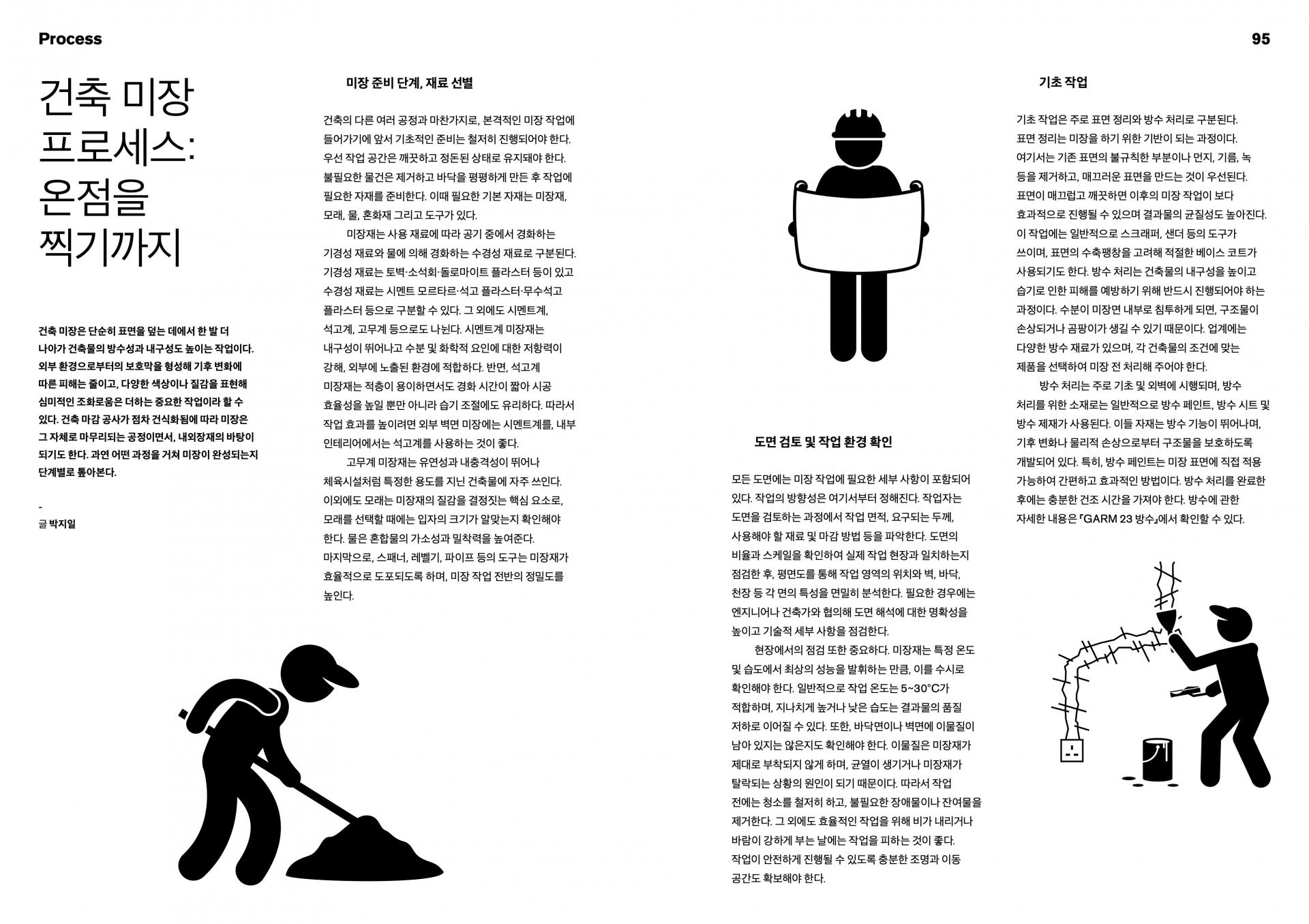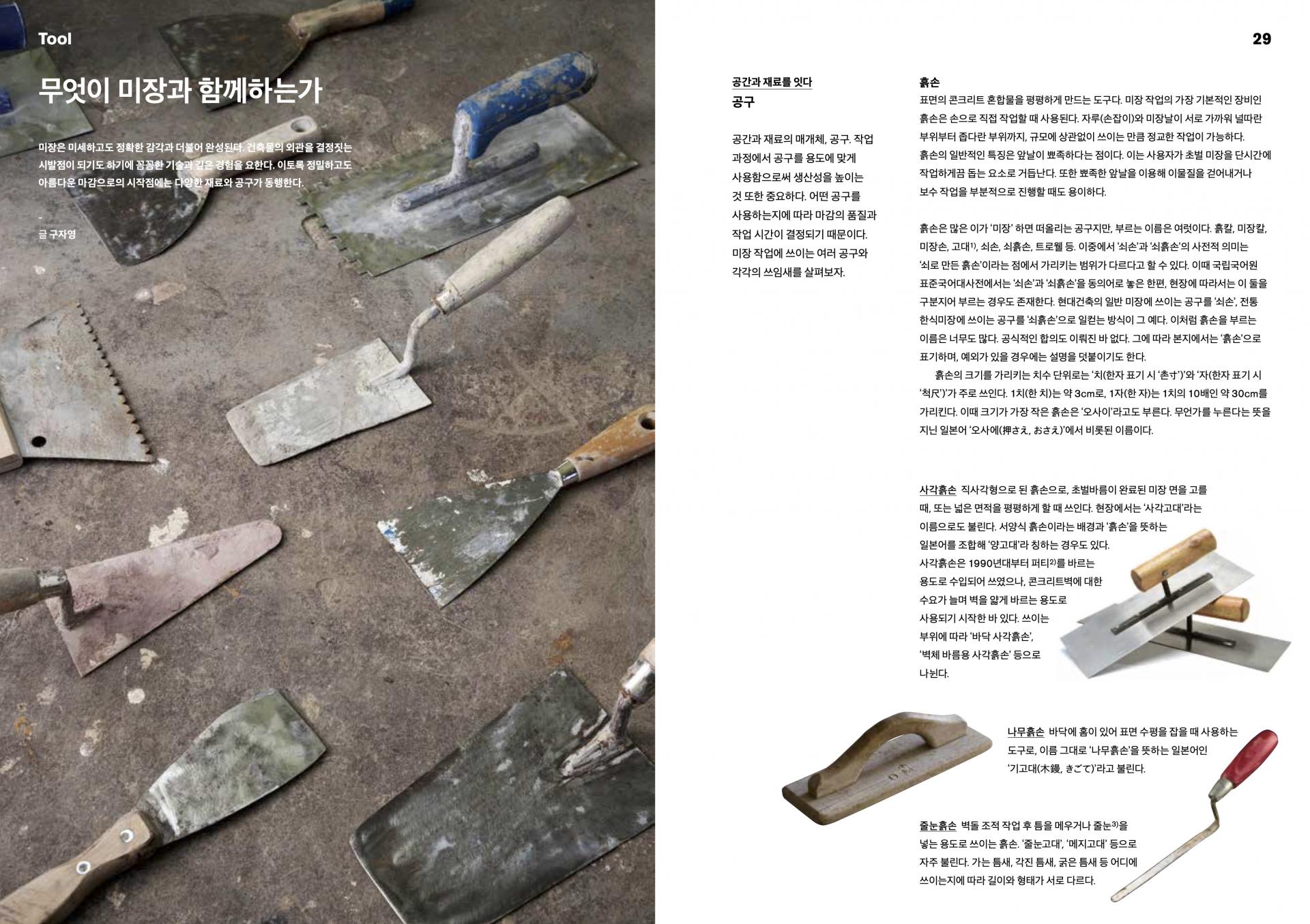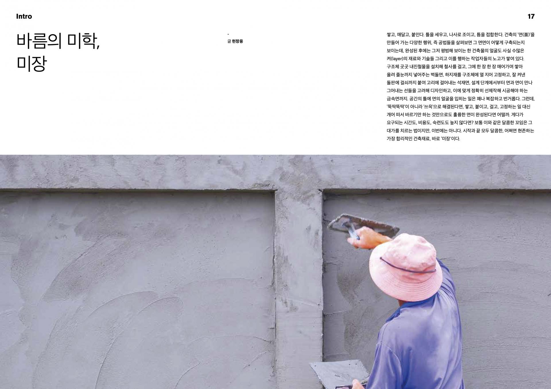 “건축에 있어 미장은 보이고자 하는 욕구의 수단으로, 마지막을 장식하는 방법으로 발달해 왔다. 건축물의 기본이 되는 ‘튼튼한 뼈대와 고운 표면’이라는 문구처럼 미장은 공간을 만들고자 하는 본질이자 본능의 표현이다. 이번 호에서는 미장의 과거부터 현재, 현대 미장의 기능, 시간과 비용을 절감하는 효율까지 톺아본다.” ㅡ 윤재선(발행인, 건축가)