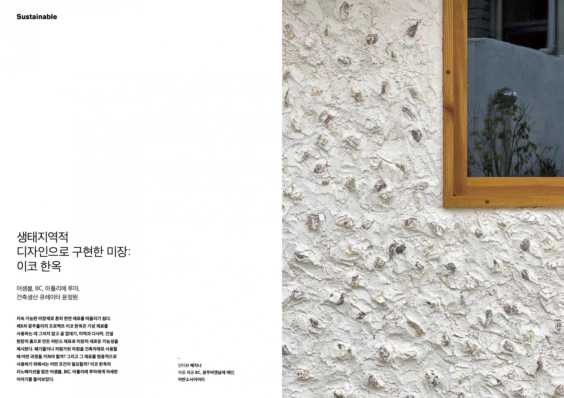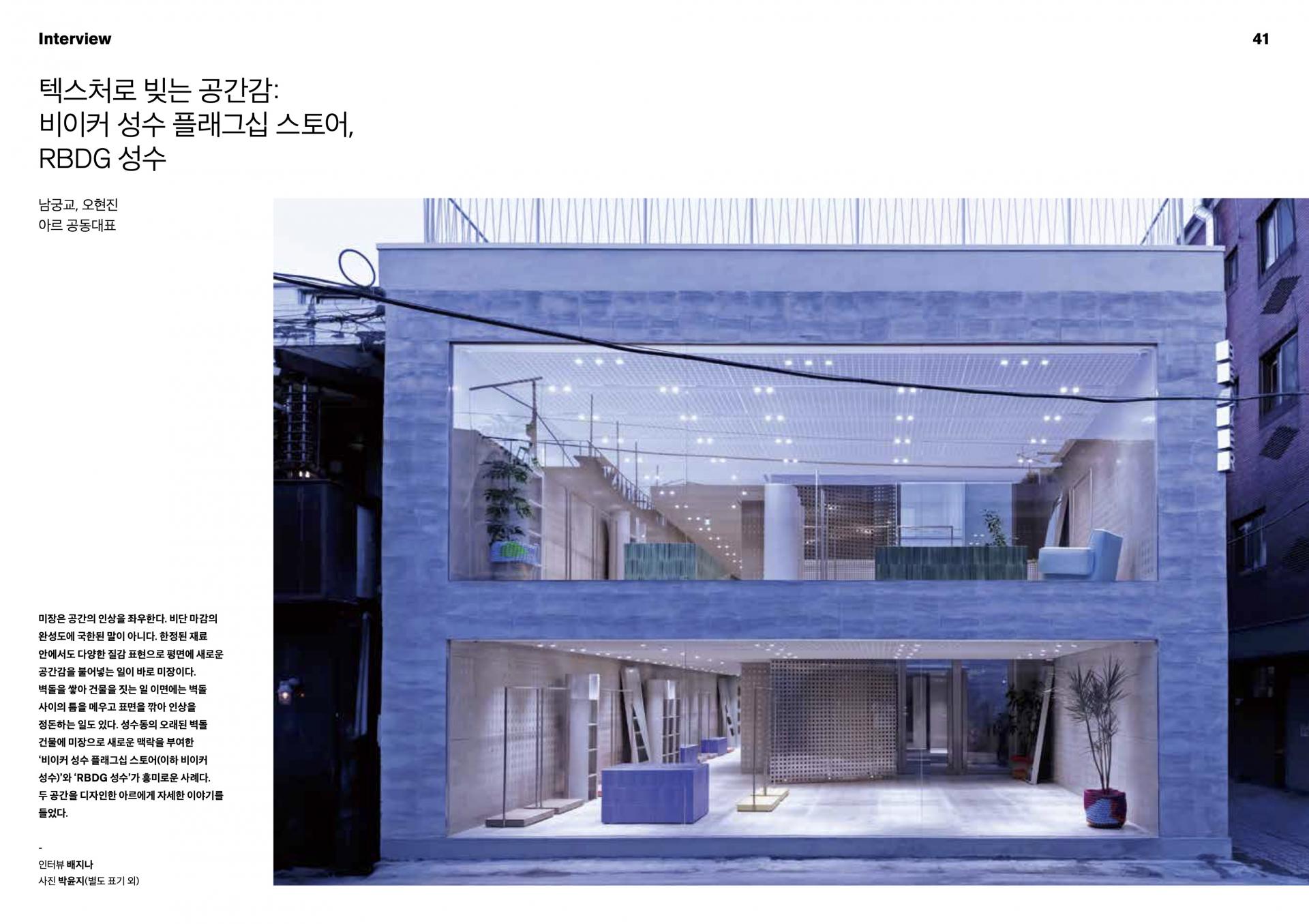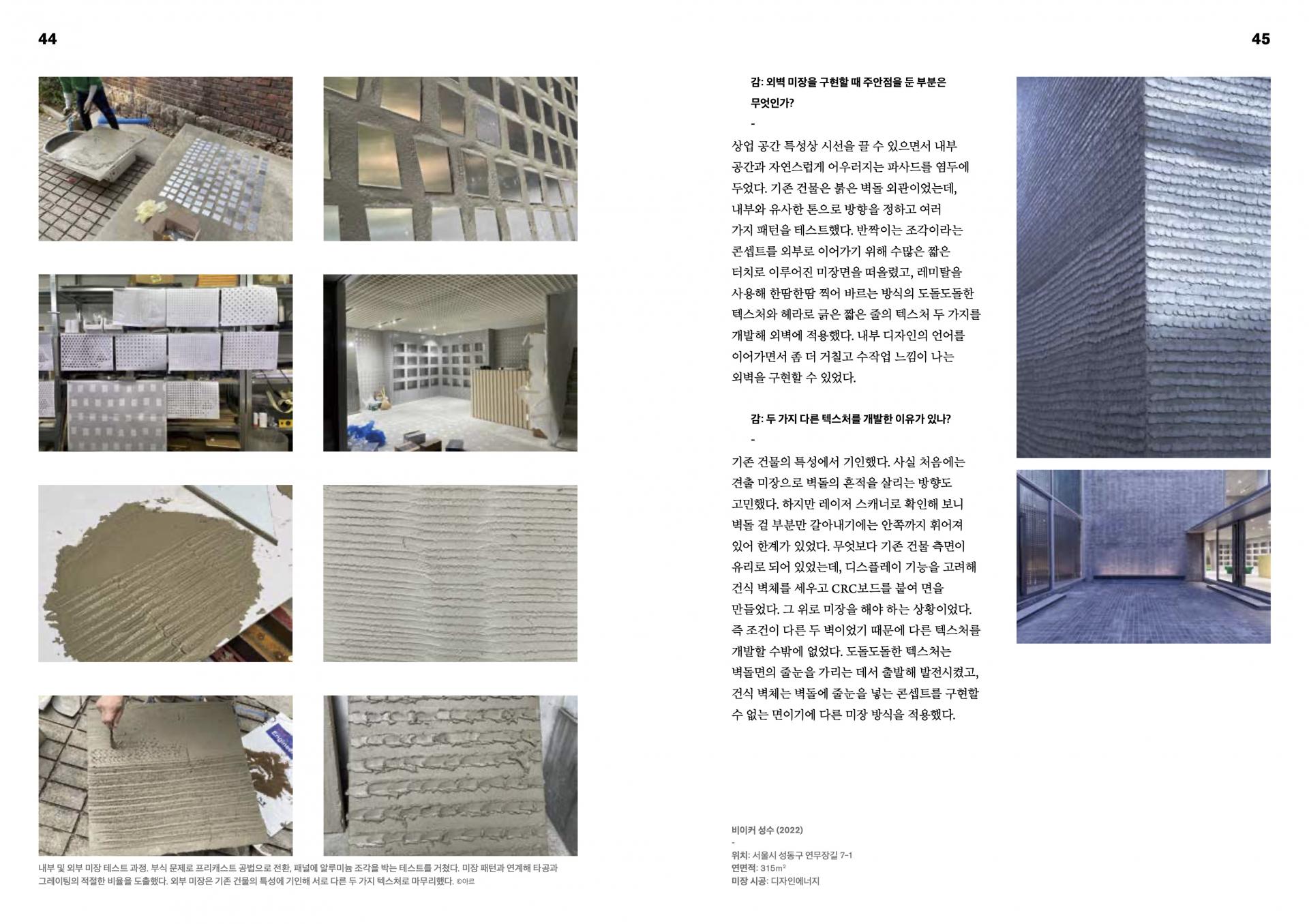 “건축에 있어 미장은 보이고자 하는 욕구의 수단으로, 마지막을 장식하는 방법으로 발달해 왔다. 건축물의 기본이 되는 ‘튼튼한 뼈대와 고운 표면’이라는 문구처럼 미장은 공간을 만들고자 하는 본질이자 본능의 표현이다. 이번 호에서는 미장의 과거부터 현재, 현대 미장의 기능, 시간과 비용을 절감하는 효율까지 톺아본다.” ㅡ 윤재선(발행인, 건축가)