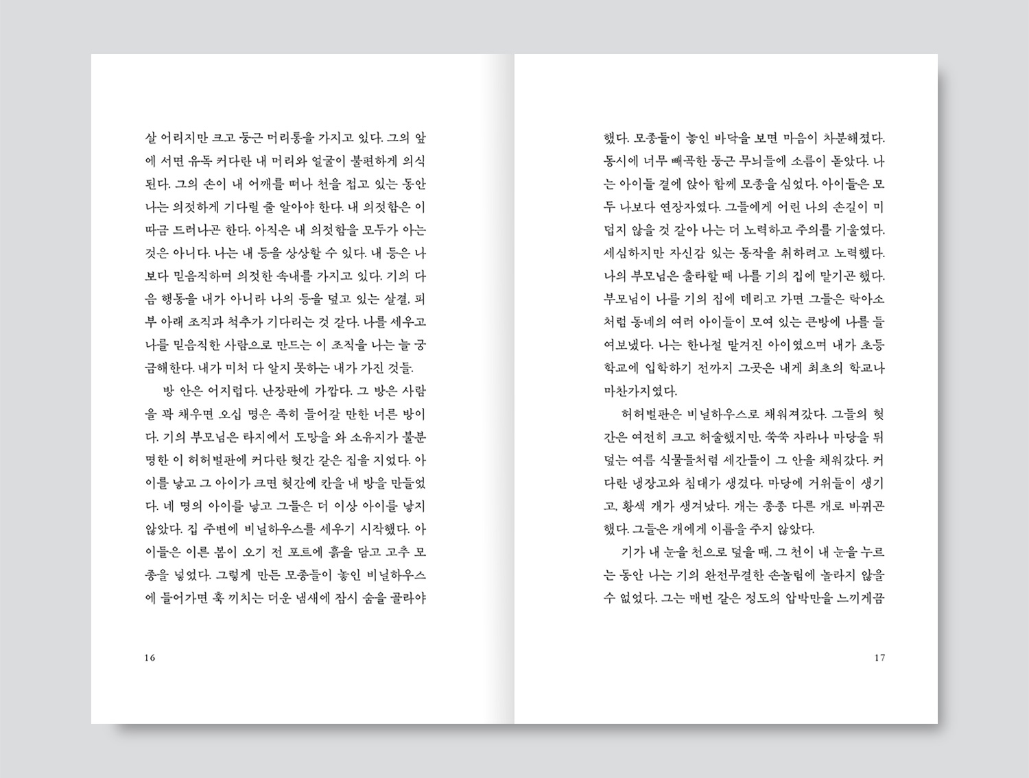 더 늦기 전에 나는 집으로 들어가야 한다. 나는 천천히 걸음을 멈추고 옷을 벗는 법을 떠올린다. 뱀의 허물을 그리듯 떠올리며 내 허물을 벗어내는 연습을 한다. 내게도 피막과 같은 보이지 않는 막이 있다. 그 막은 진짜 ‘나’이다. 집으로 갈 때 나는 진짜 나를 벗어두고 간다. 그것이 내게 필요하다. 단지 폭력이나 미움, 무관심에 대응하기 위해서가 아니다. 나의 일부는 이 평원의 더 너른 곳을 다녀와야 한다. 내가 밤에 누리지 못하는 모험과 덧없는 경계의 드나듦을 경험해야 한다. 그것은 꿈과 현실의 경계에서 무디게 자라나는 빛깔로 이뤄져 있다. 지평선과 수평선까지 내가 벗어둔 얇은 막은 나를 벗어나 나만큼의 무게를 잃고 날아오른다. 그 얇은 장막이 펼쳐져 새로운 날이 오면 새로운 상처를 얻은 내 몸에 와서 다시 하나가 되어 스민다. 그러면 나는 밖으로 나가 들을 걷고 강둑을 달려 기의 집에 다시 갈 수 있다. (본문 45쪽)