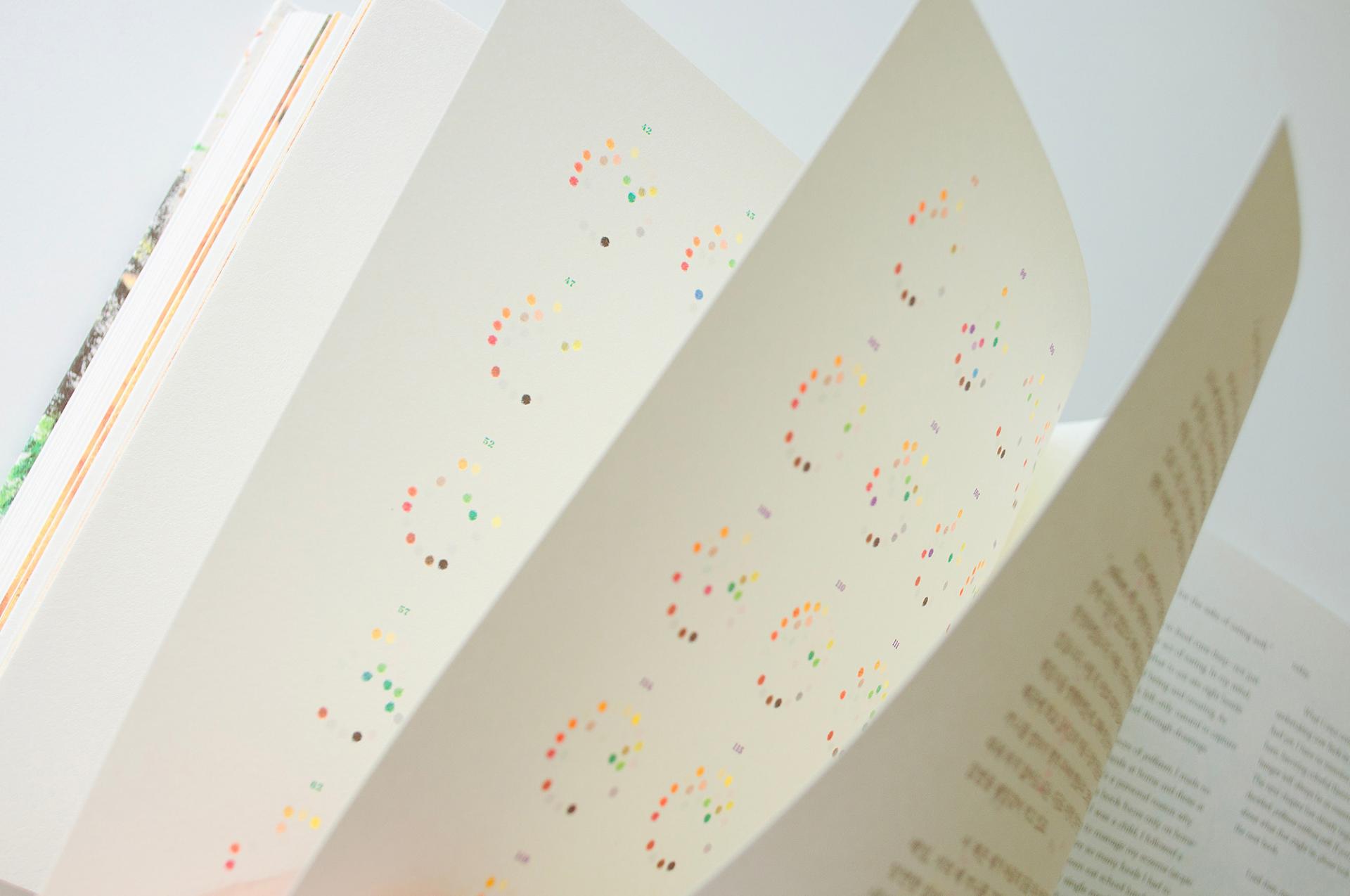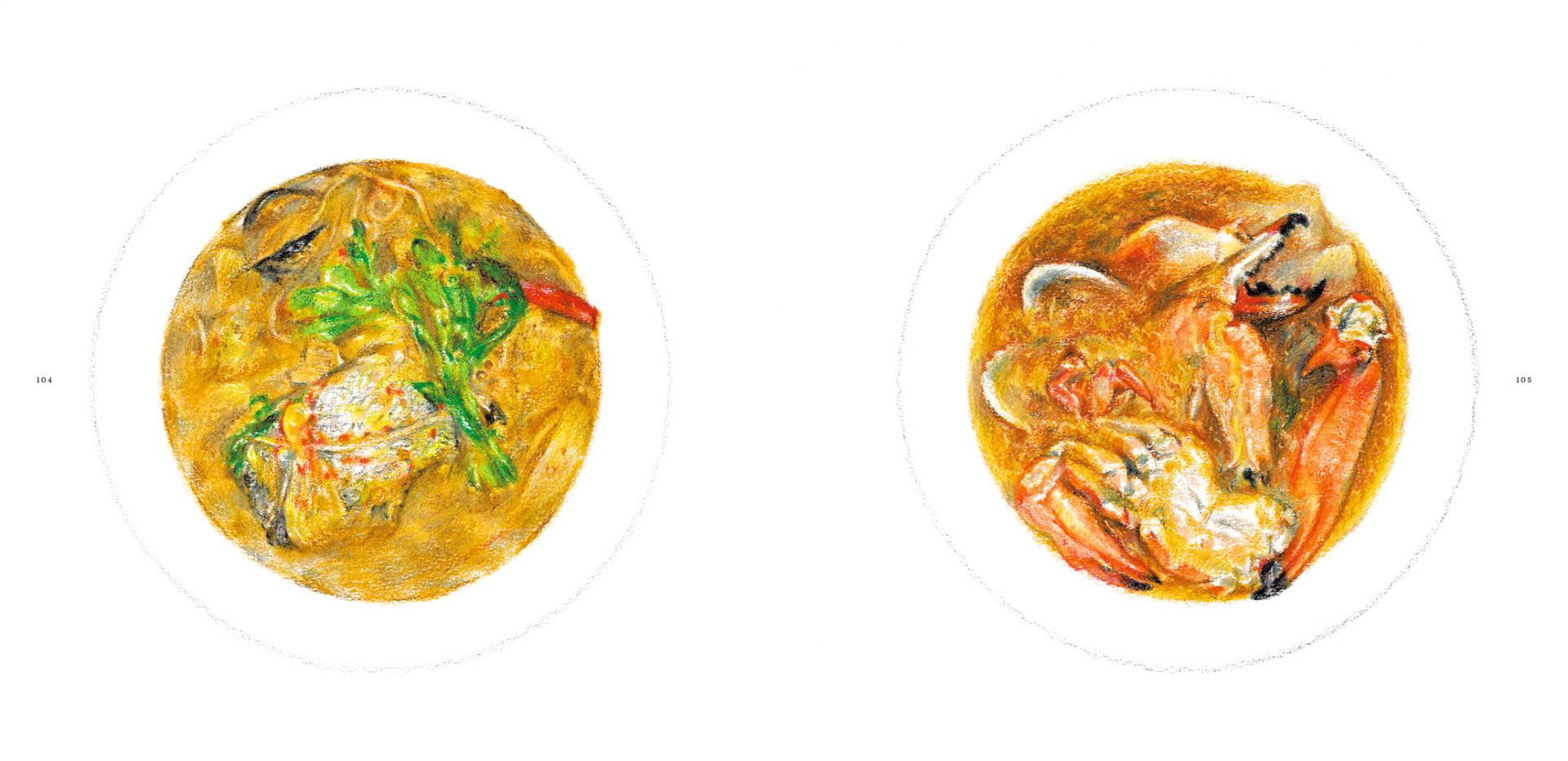 Sometimes just three, other times up to eighteen out of 44 colors bring the ingredients to life—tracing their journey from firm, vibrant freshness to simmered, golden tenderness. (color ingredients, 148p)