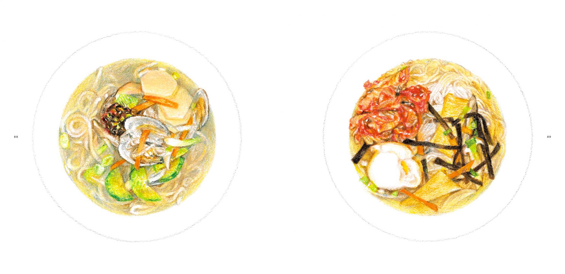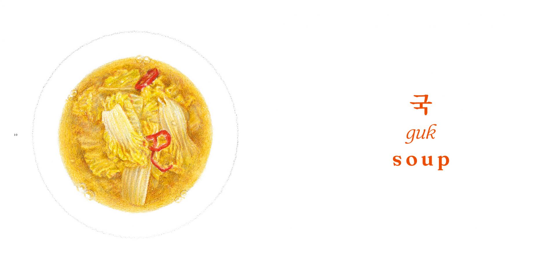 This book offers dozens of clues to very Korean dining customs: having ssal-bap (rice) and doenjang-guk (soybean paste soup) with various kinds of kimchi; eating salad as a banchan (side dish); devouring a double serving of pasta at home; getting a year older by eating tteokguk (sliced rice cake soup); desperately craving ramyeon (instant noodles). (toast, 7p)