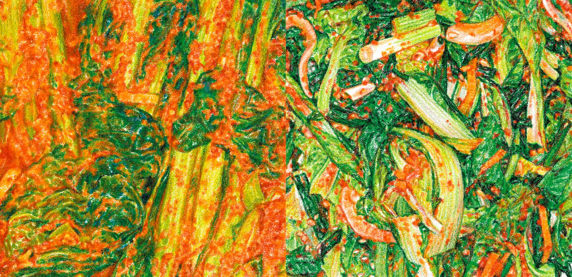 밀폐용기에 한가득 쌓인 색색의 나물들을 마주한 순간에는, 비빔밥을 푸지게 비빌 생각에, 또 좀처럼 쓸 수 없던 무지개색을 써서 그릴 생각에 들뜨기도 합니다. (밥과 면, 70p)