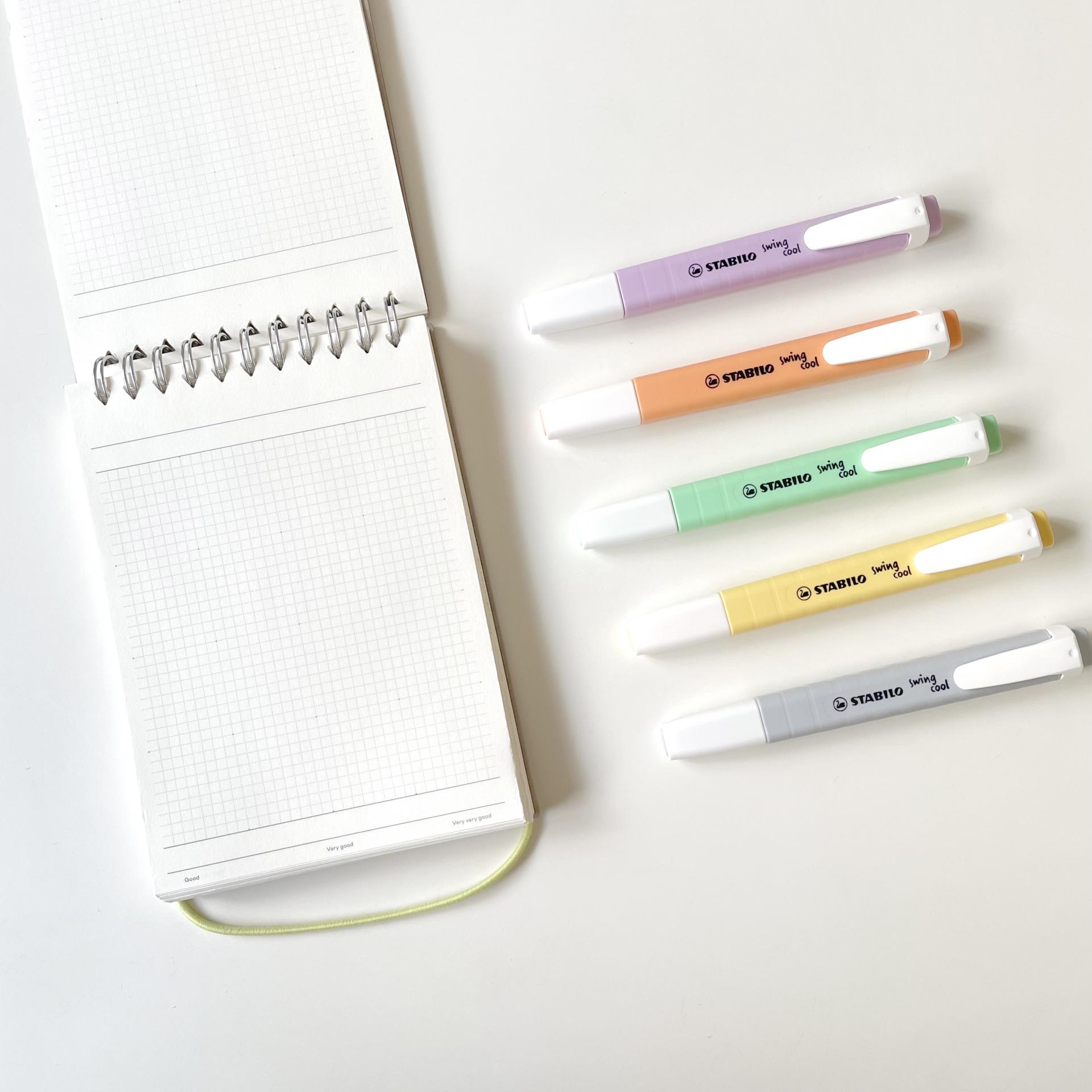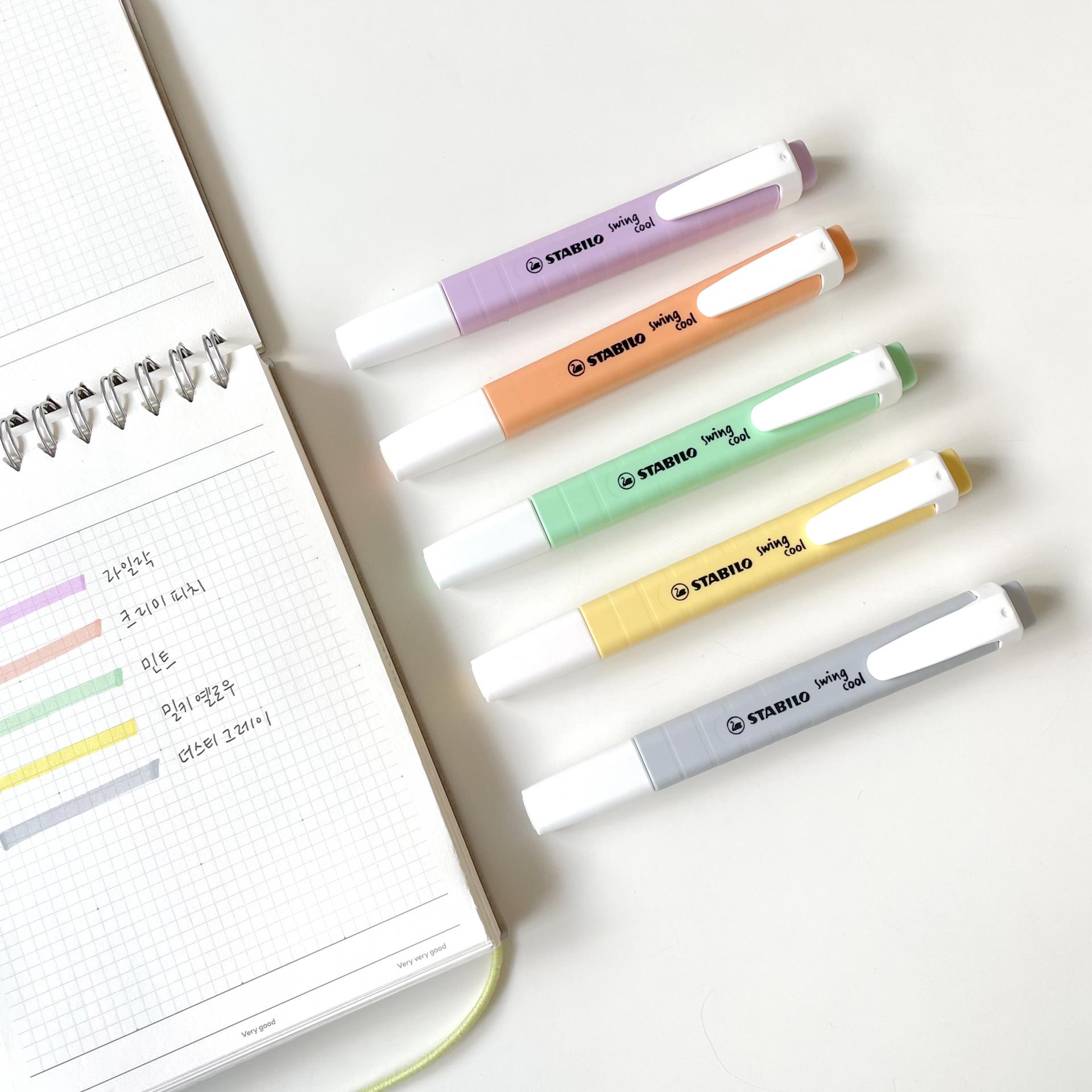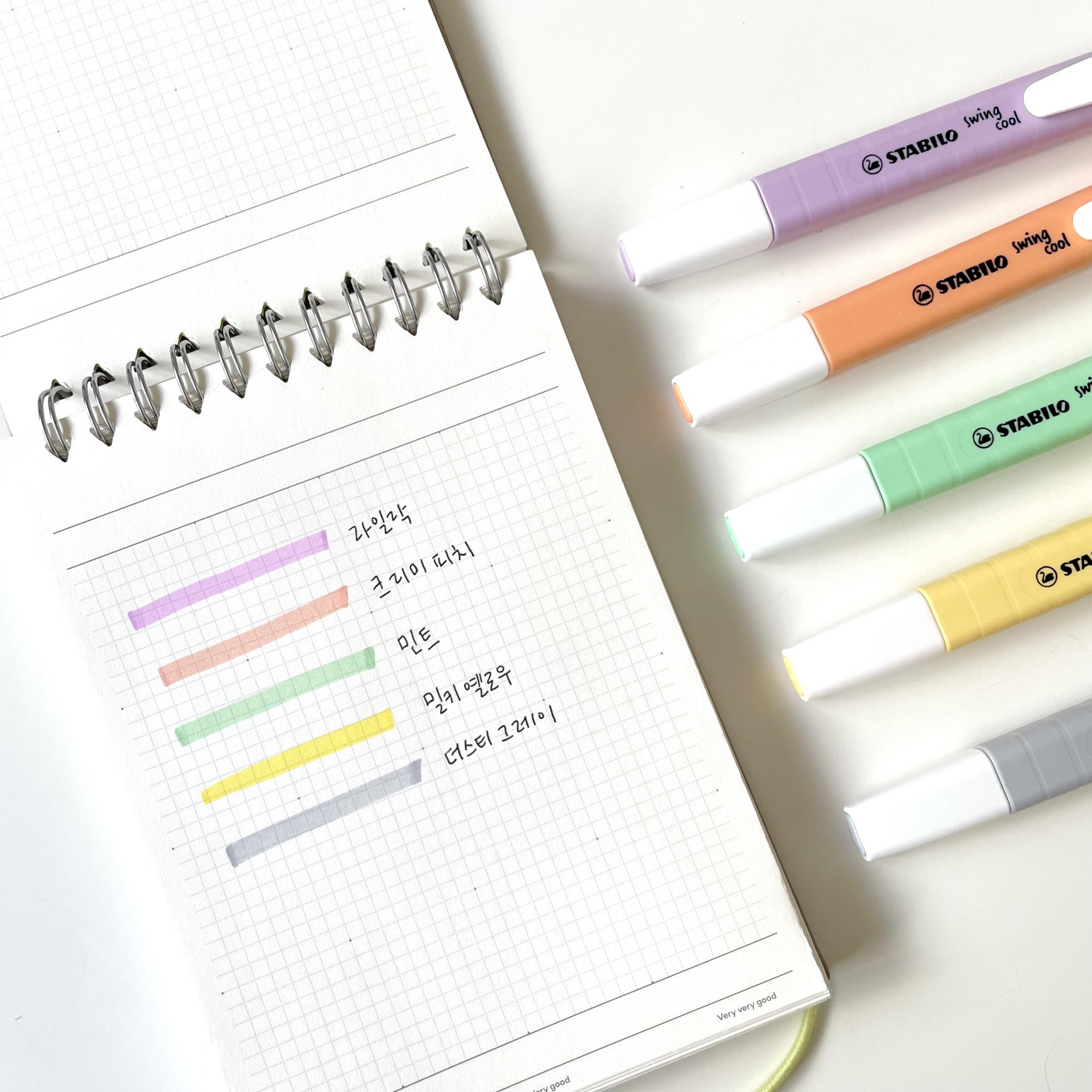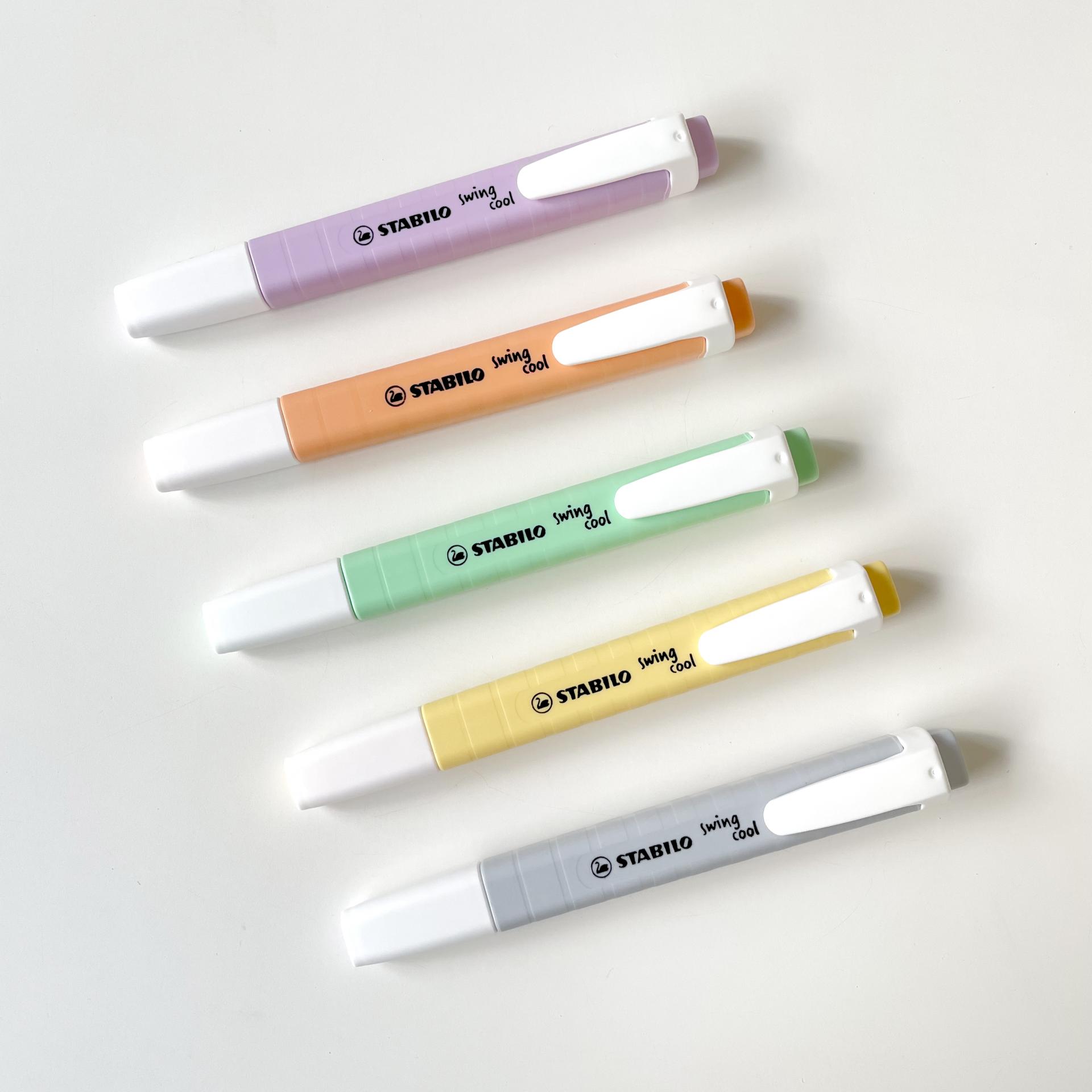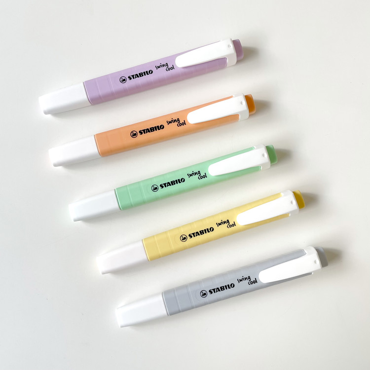 스타빌로 스윙쿨 파스텔 에디션은 부드러운 컬러의 하이라이터를 원하는 사람들에게 완벽합니다. 포켓 사이즈의 플랫한 디자인은 어디서든 사용이 간편합니다.