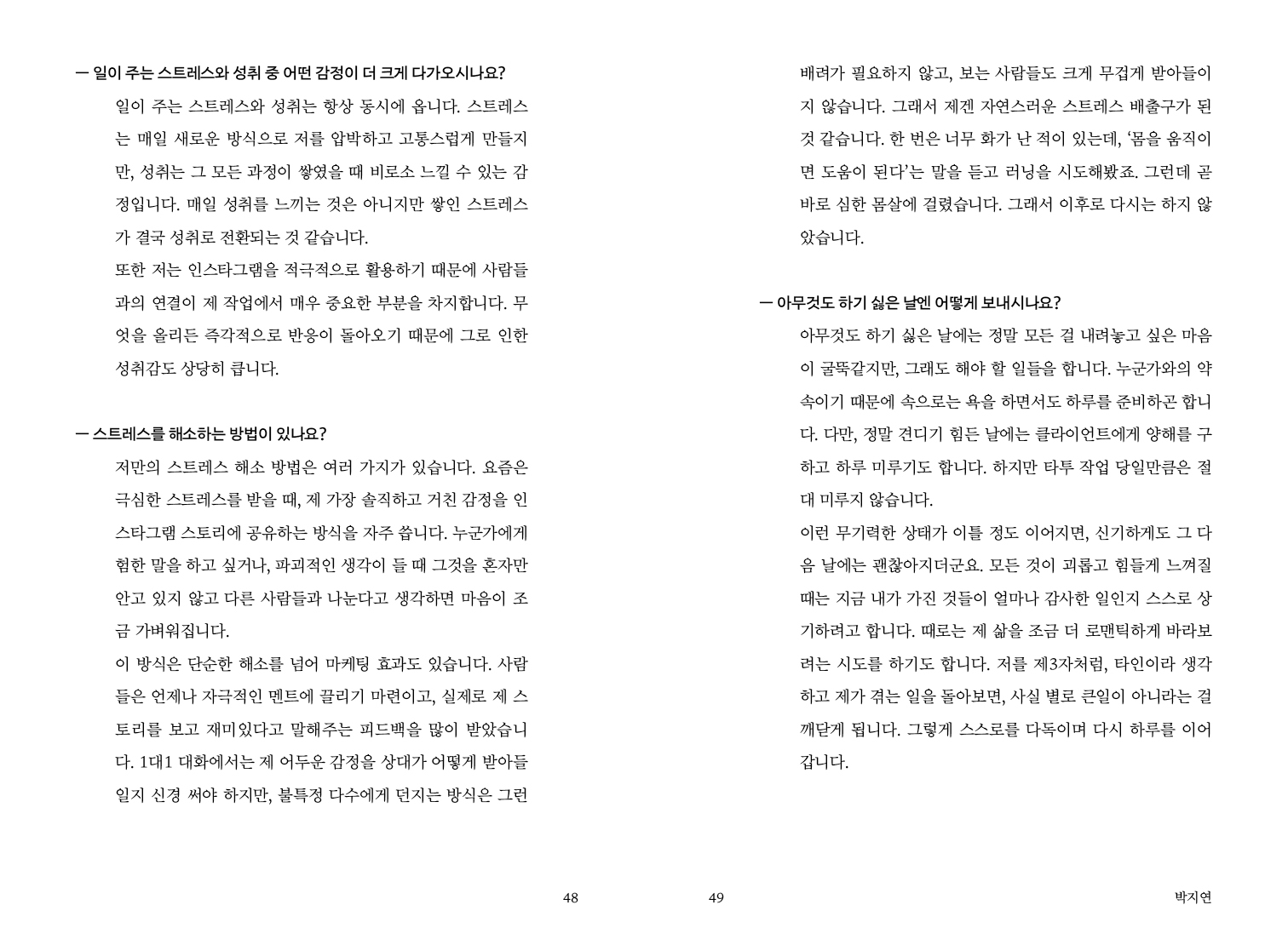 모든 것이 괴롭고 힘들게 느껴질 때는 지금 내가 가진 것들이 얼마나 감사한 일인지 스스로 상기하려고 합니다. 때로는 제 삶을 조금 더 로맨틱하게 바라보려는 시도를 하기도 합니다. 저를 제3자처럼, 타인이라 생각하고 제가 겪는 일을 돌아보면, 사실 별로 큰일이 아니라는 걸 깨닫게 됩니다. 그렇게 스스로를 다독이며 다시 하루를 이어갑니다. -49p 박지연(타투이스트)