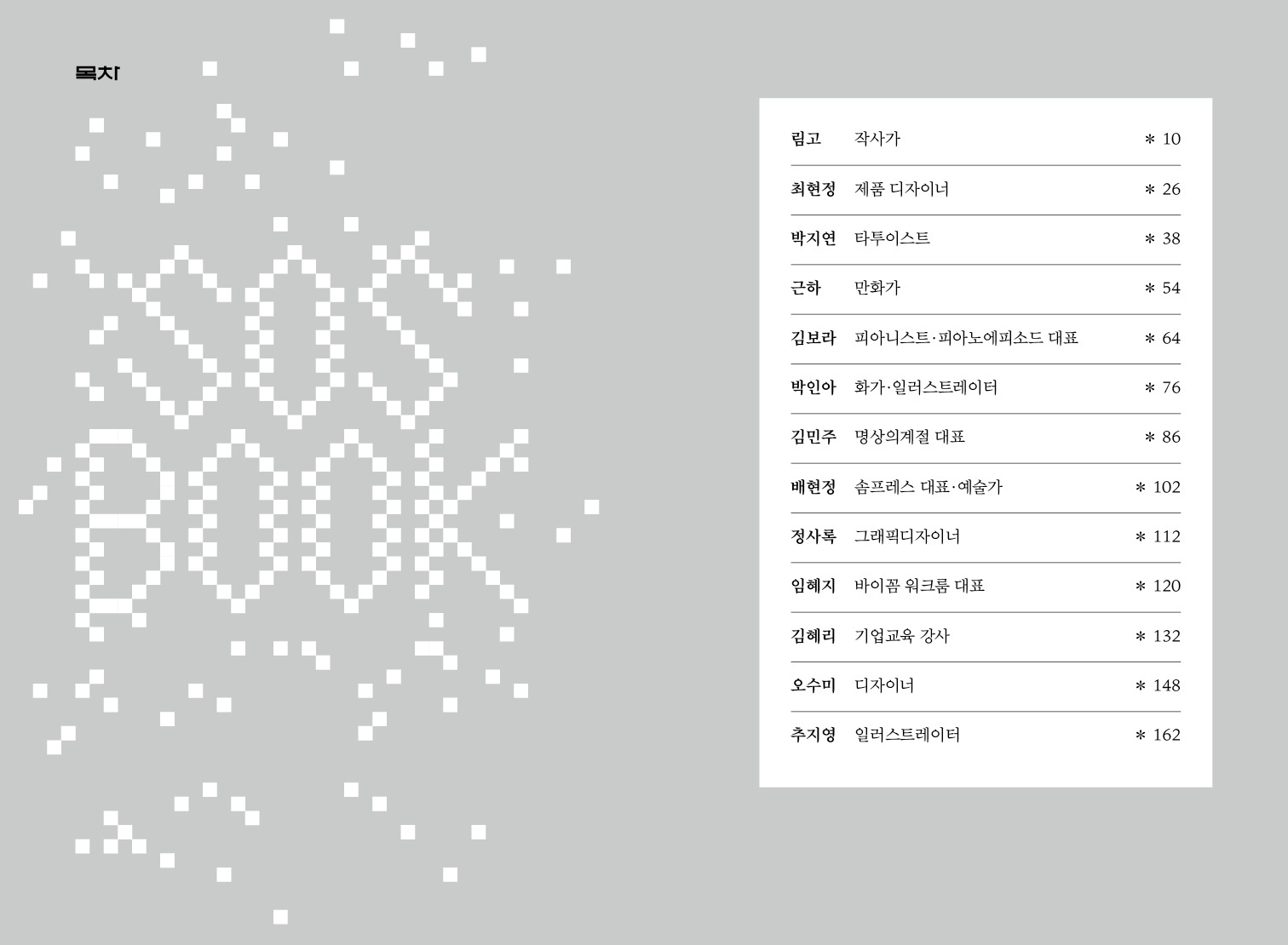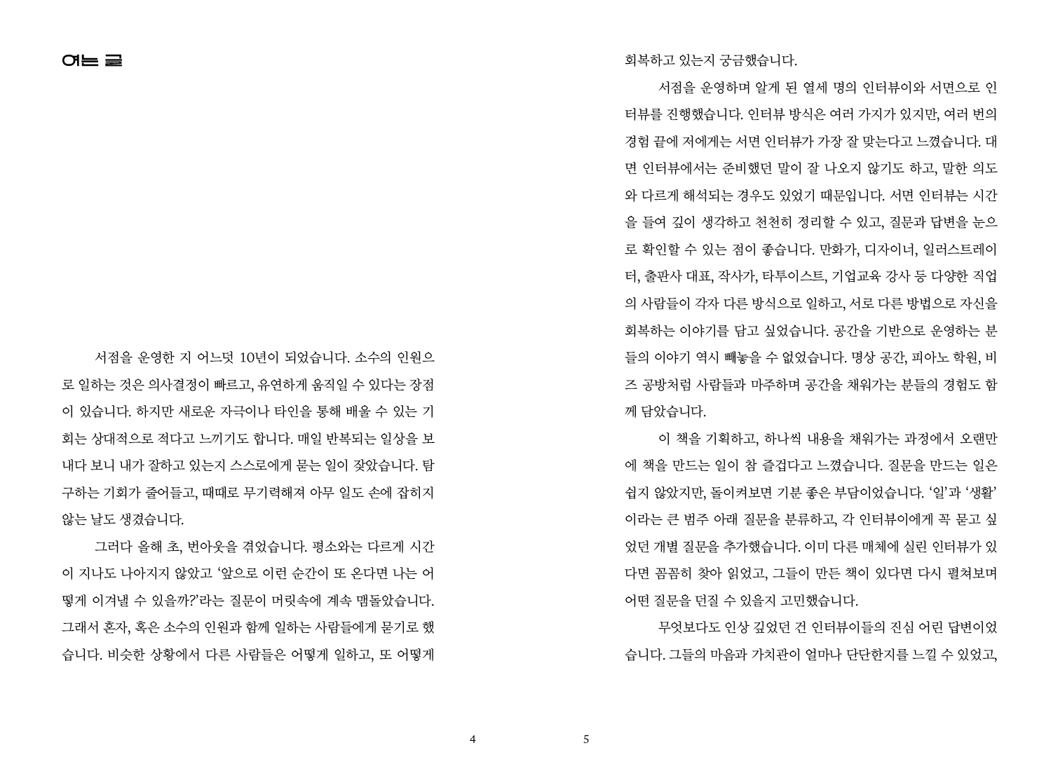 책을 만들며 무엇보다도 인상 깊었던 건 인터뷰이들의 진심 어린 답변이었습니다. 그들의 마음과 가치관이 얼마나 단단한지를 느낄 수 있었고, 스스로에 대해 잘 알고 있는 사람들의 태도에서 많은 것을 배웠습니다. 모두 각기 다른 방식으로 답했지만, 그 안에서 공감하고 배운 것 들이 많다는 점은 같습니다.