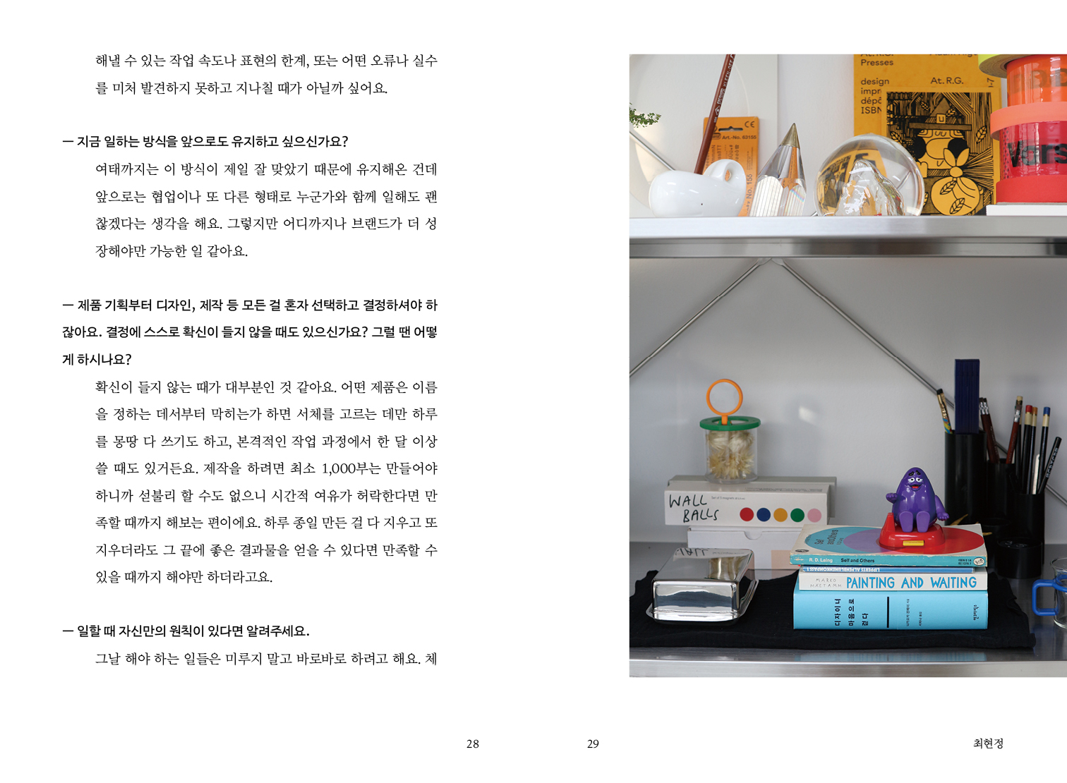 할 수 있는 방법을 다 동원해도 소용이 없을 때가 있어요. 그냥 자책하거나 괴로워하다가 시간이 가는 것 같아요. 그 과정들을 어떻게 지나왔나 생각해보면 부족하면 부족한대로 인정하면서 돌파해 나간 것 같아요. -35p 최현정 (제품 디자이너)