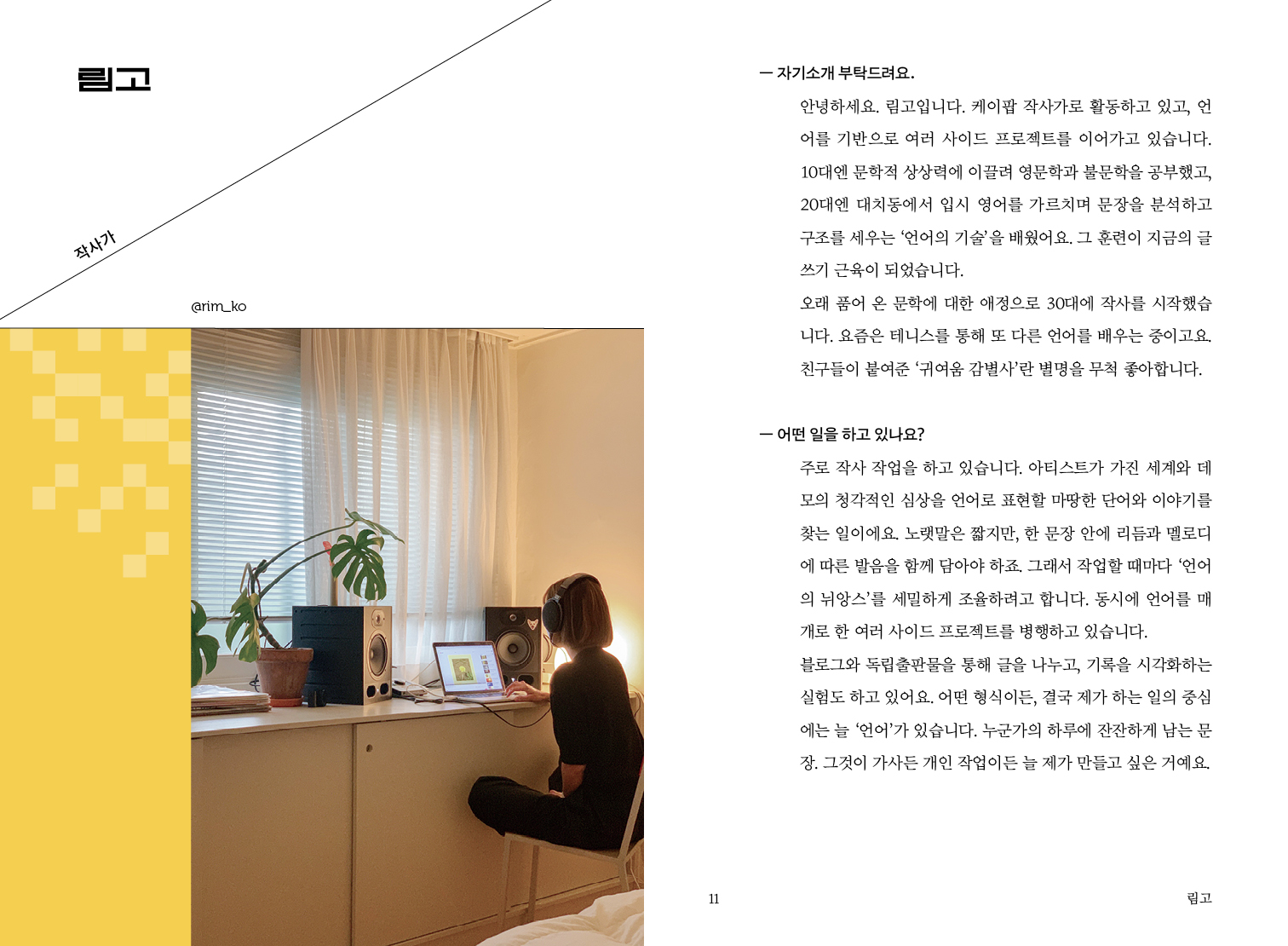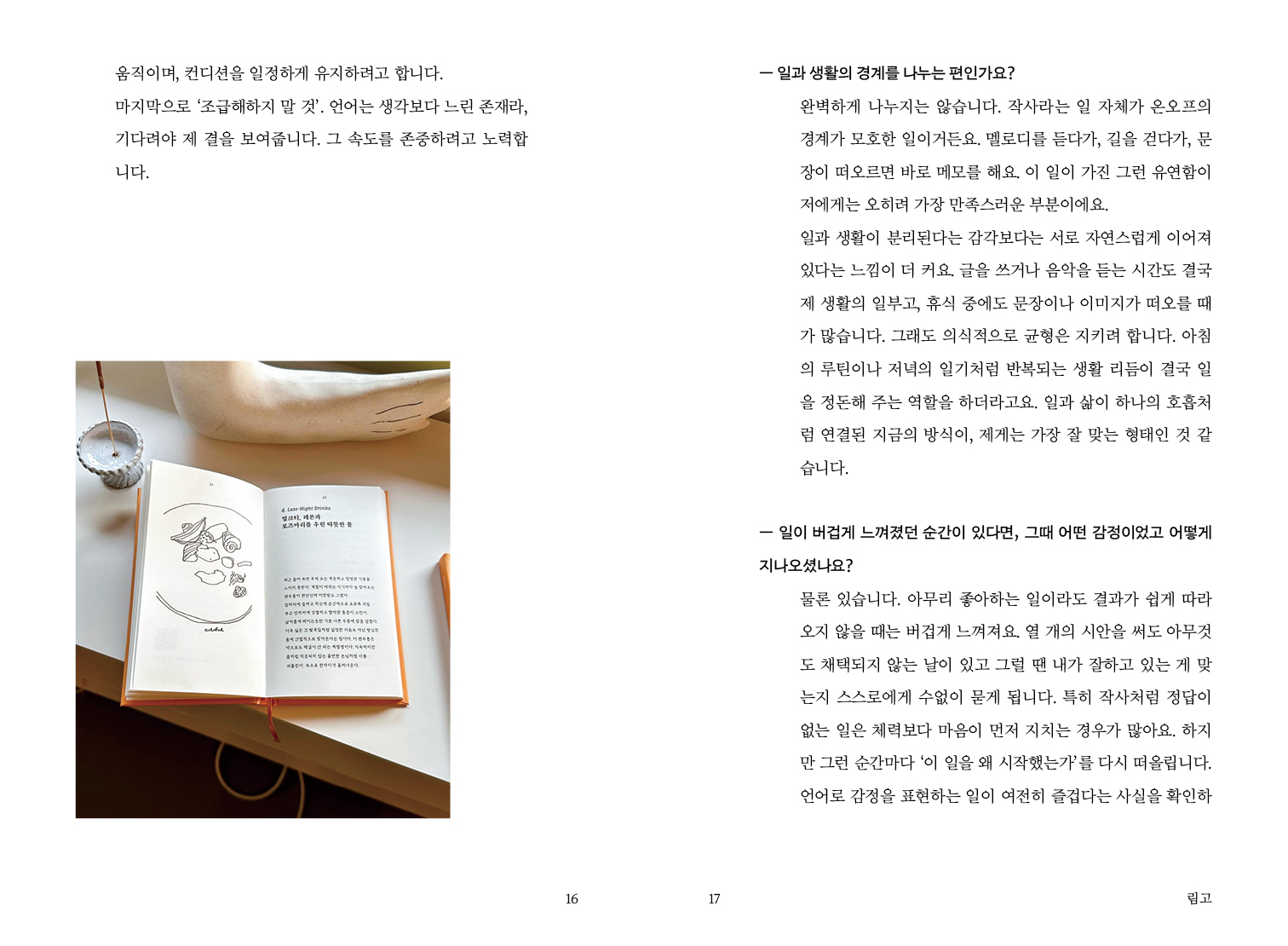 가능하다면 지금처럼 일하고 싶어요. 빨리 가기보다 오래가는 방식을 선호합니다. 스스로의 속도를 지키는 게 결국 가장 효율적이라는 걸 지난 몇 년 동안 배웠어요. 작업의 양보다 리듬이 중요하다고 생각해요. 에너지가 몰리는 시기엔 몰입해서 쓰고, 잠시 비워야 할 땐 과감히 멈춥니다. 이런 흐름을 받아들이면서 일에 대한 지속력이 생겼습니다. 지금의 방식은 제가 만든 리듬 위에서 일과 삶이 자연스럽게 섞여 있는 상태예요. 균형이 무너지지 않는 한, 이 속도로 계속 가고 싶습니다. -15p 림고(작사가)
