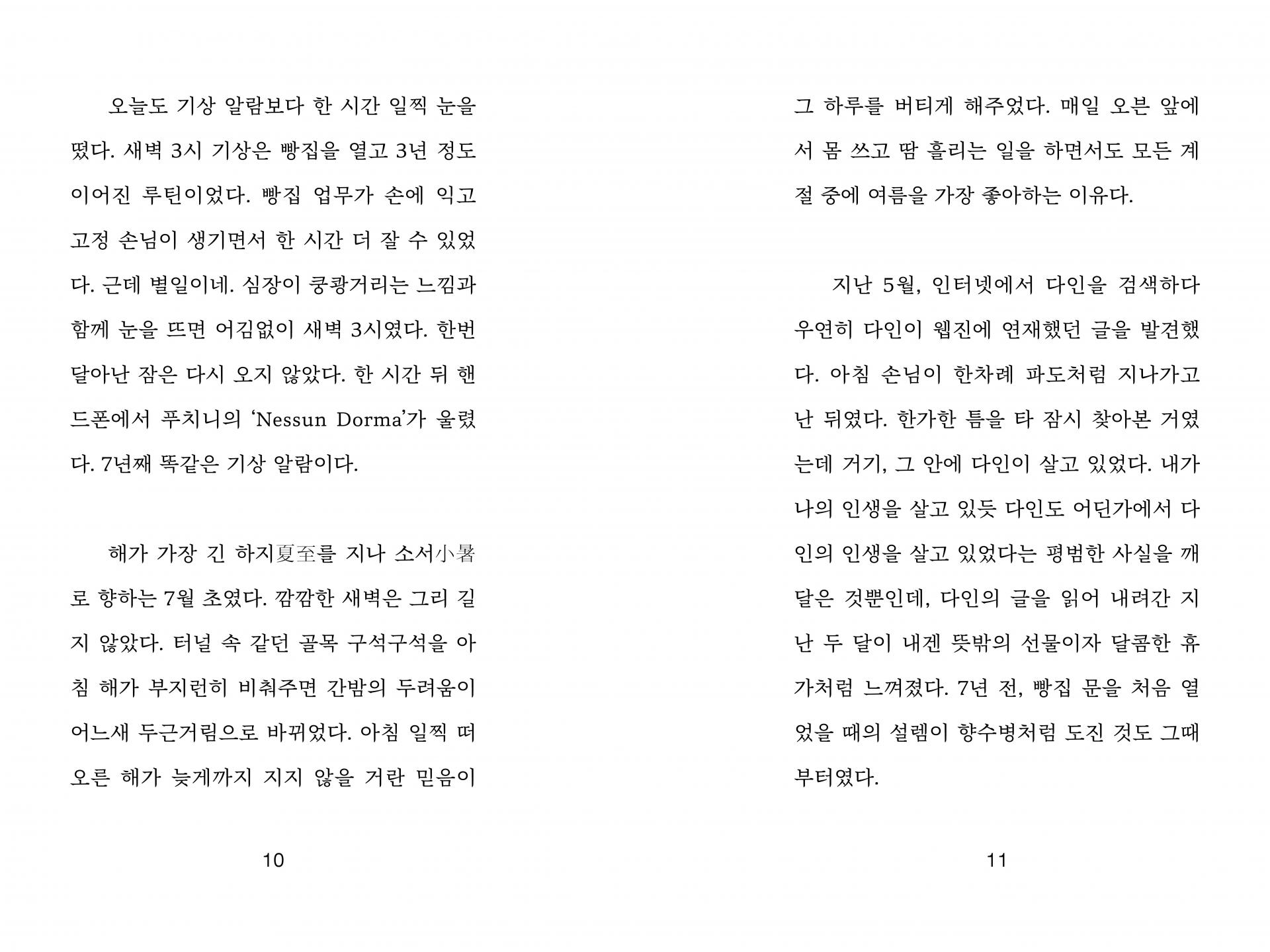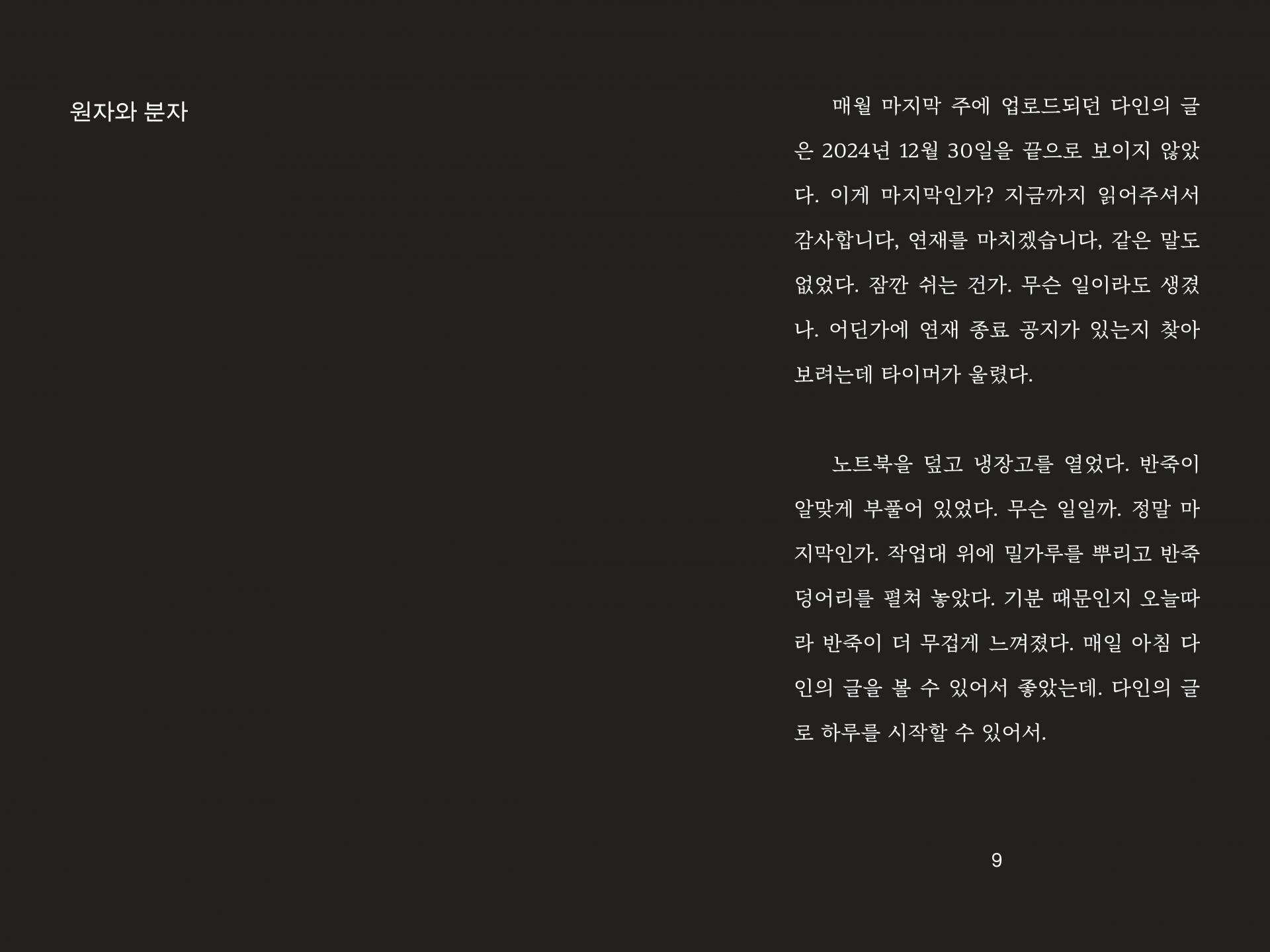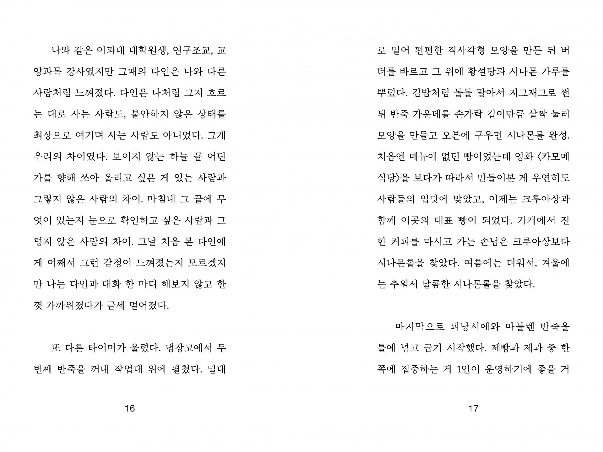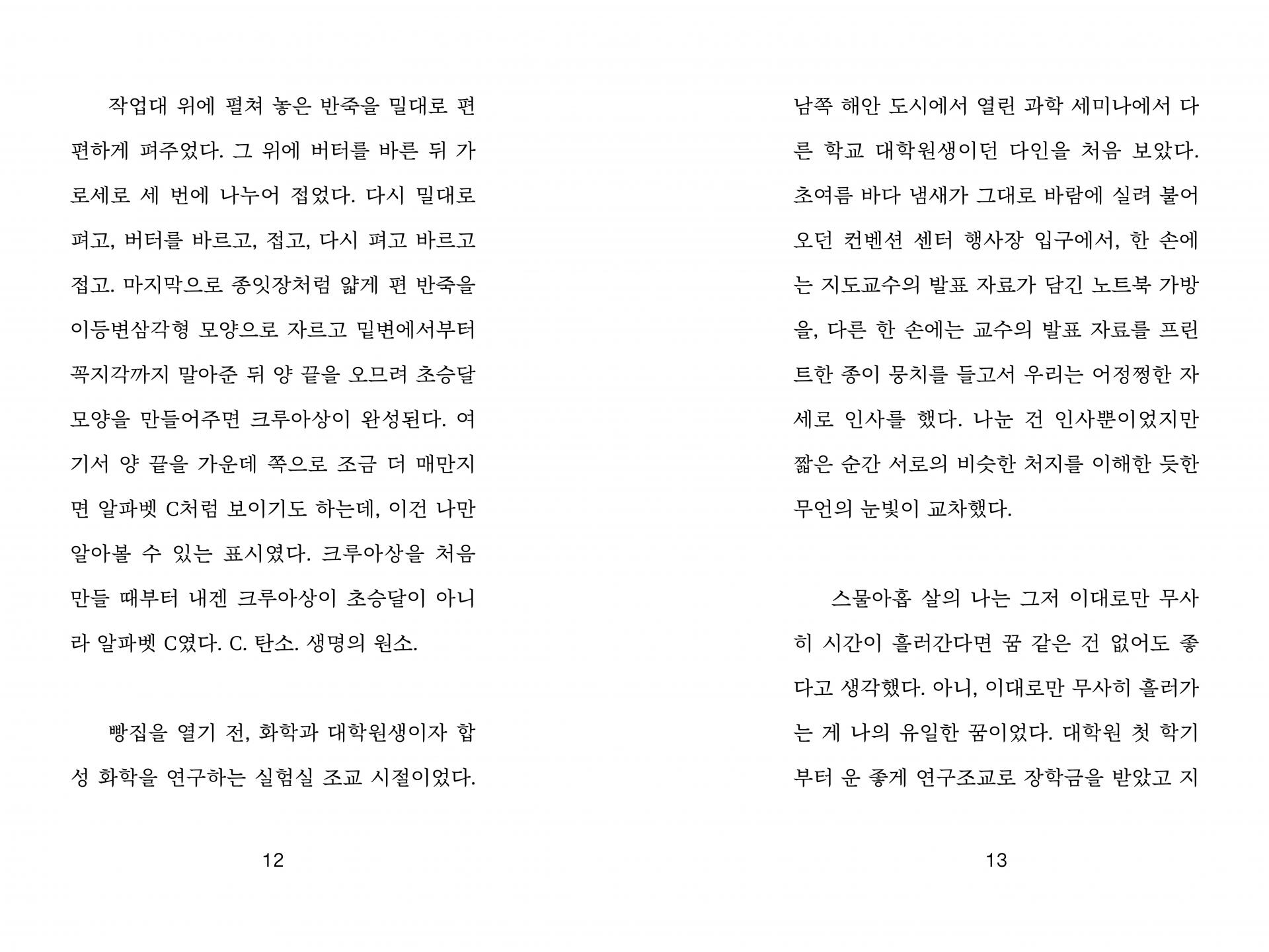 제빵사, 소설가, 책방지기, 연구원이 맞이하는 지구 멸망 전의 평범한 하루를 그린 연작소설집이다. 화학자를 그만두고 빵집 ‘원자와 분자’를 연 수윤, 도서관 상주 작가로 일하며 독립출판을 하는 시원, 10년째 책방을 지키는 안지, 그리고 태양을 관측하는 다인. 이들은 모두 언젠가 다가올 세계의 끝을 알면서도 일상의 리듬에 기대어 오늘을 살아간다. 멸망보다 삶, 우주보다 마을에 시선이 닿아 있는 이 소설은 상상과 현실의 경계를 오가며 유한한 시간 속에서 어떻게 서로를 바라보고 기억하며 사랑할 수 있는지를 묻는다.