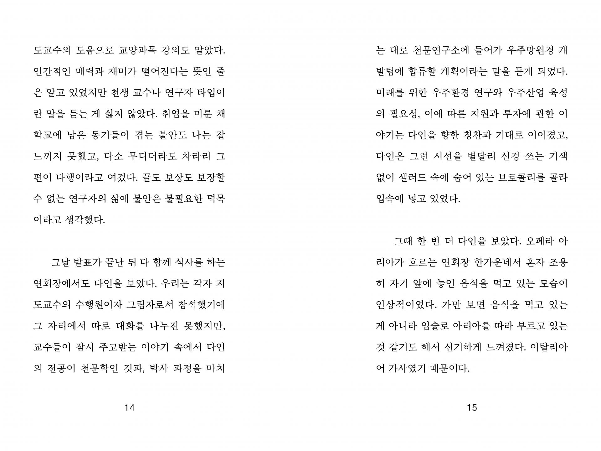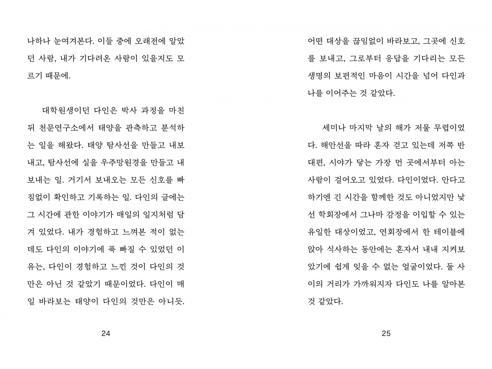 태양은 매일 변해. 어떤 날은 사납고 어떤 날은 아름다워. 태양이 숨 쉴 때마다 우주를 향해 내보내는 물질이 있는데 그게 지구에 닿으면 무슨 일이 일어날지 아무도 몰라. 한순간에 지구가 사라져 버릴 수도 있고, 매일 오로라 축제가 열릴 수도 있고. 그게 내 일인 것 같아. 태양을 보면서 아직 오지 않은 미래를 끊임없이 예측하는 거. 가끔은 벗어나고 싶을 때도 있어. 태양이 안 보이는 곳으로, 밤으로. 근데 이상해. 밤이 되면 다시 보고 싶어져. 혼란스럽지만 심장을 뛰게 해. 괴롭지만 나를 살게 하지. 너도 그렇지 않니?