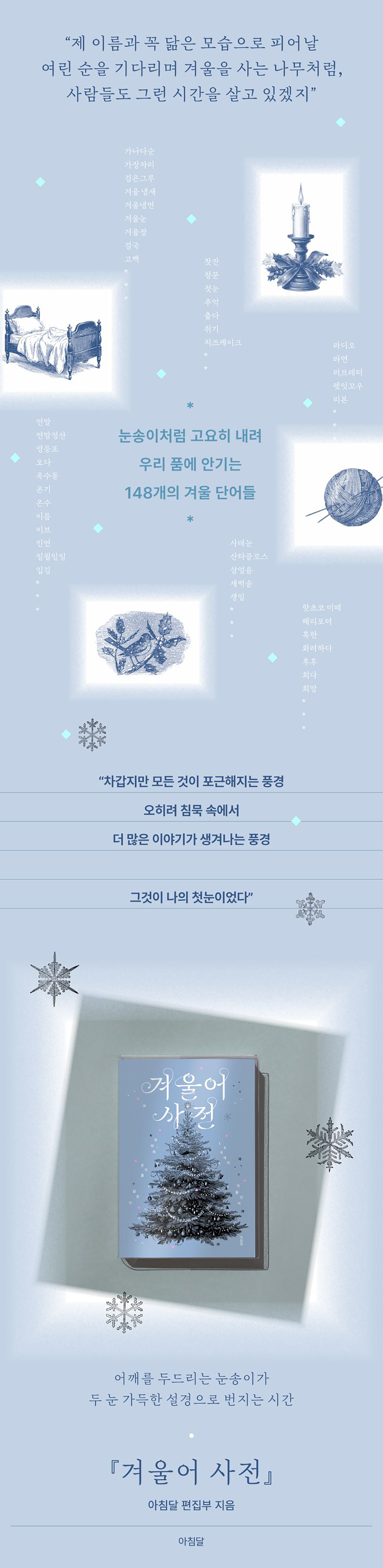 지나온 계절을 돌이키며 마음속으로 품고 있던 단어를 꺼내와 자기만의 이야기로 새롭게 정의 내리는 『겨울어 사전』이 출간되었다. 올여름 『여름어 사전』을 통해, 여름이라는 시간을 힘껏 사유하고, 여름에 맺혀 있던 단어들을 함께 읽었던 시간을 지나 겨울로 도착했다. 총 148개의 단어로 구성된 이번 책은 마찬가지로 아침달 편집부를 비롯해 아침달 출간 저자들과 독자들의 원고를 받아 수록했다. 한국문학의 아름다움을 일상 가까이에 둔 사람들의 겨울에 관한 이야기가 단어 하나에서 출발해 명징한 장면으로 이어져 전환된다.