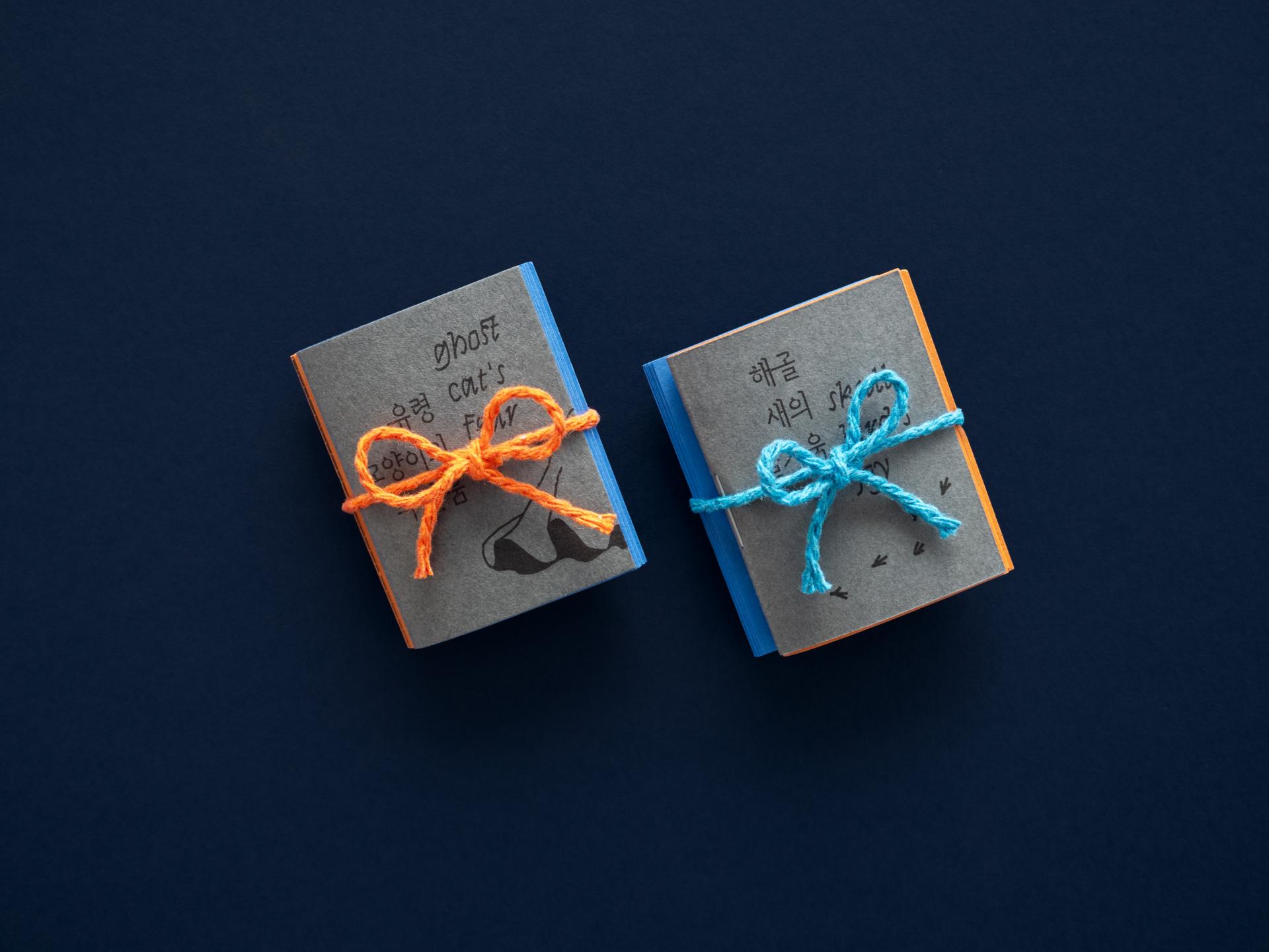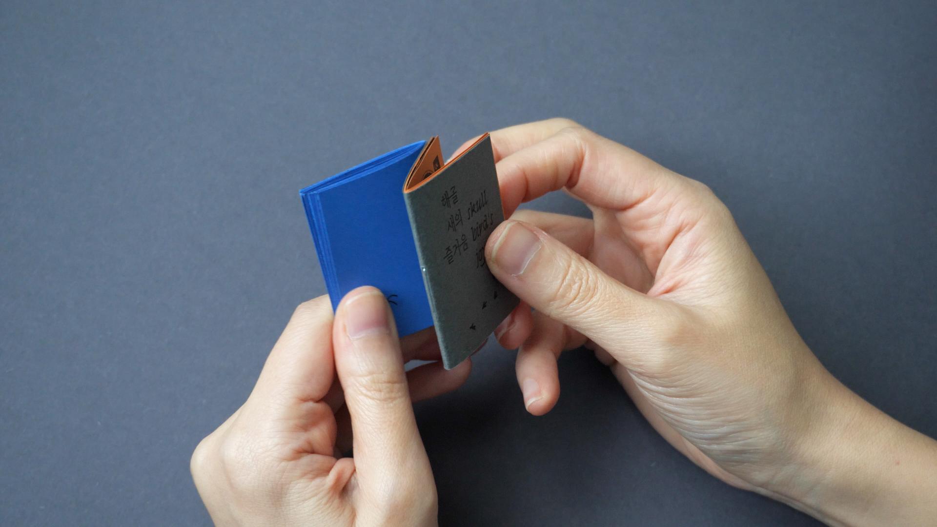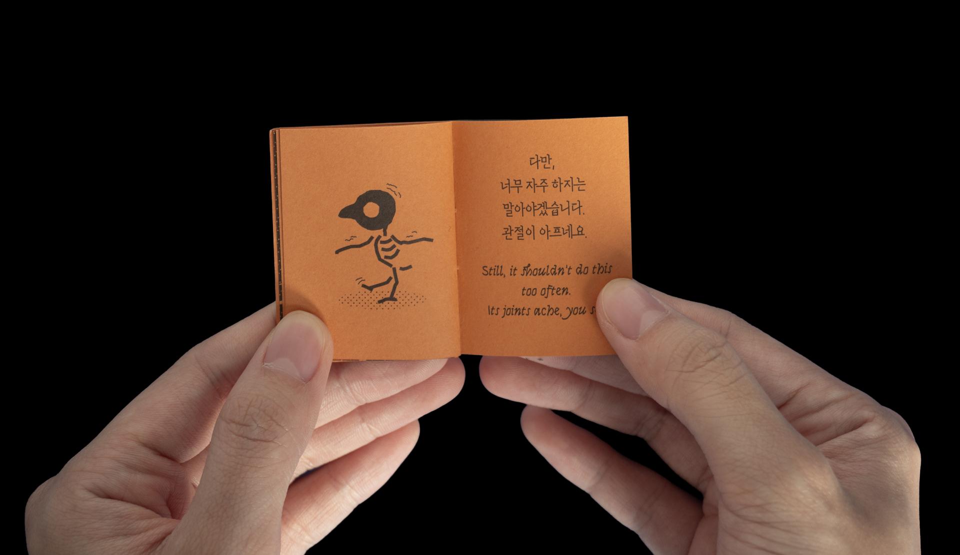 손바닥에 쏙 들어가는 작은 책에 유령고양이와 해골새의 이야기를 담았습니다. 두 권의 책이 Z자 형태로 연결되어 있어서 한쪽 면에서는 『유령고양이의 두려움』을, 반대쪽 면에서는 『해골새의 즐거움』을 읽을 수 있습니다.