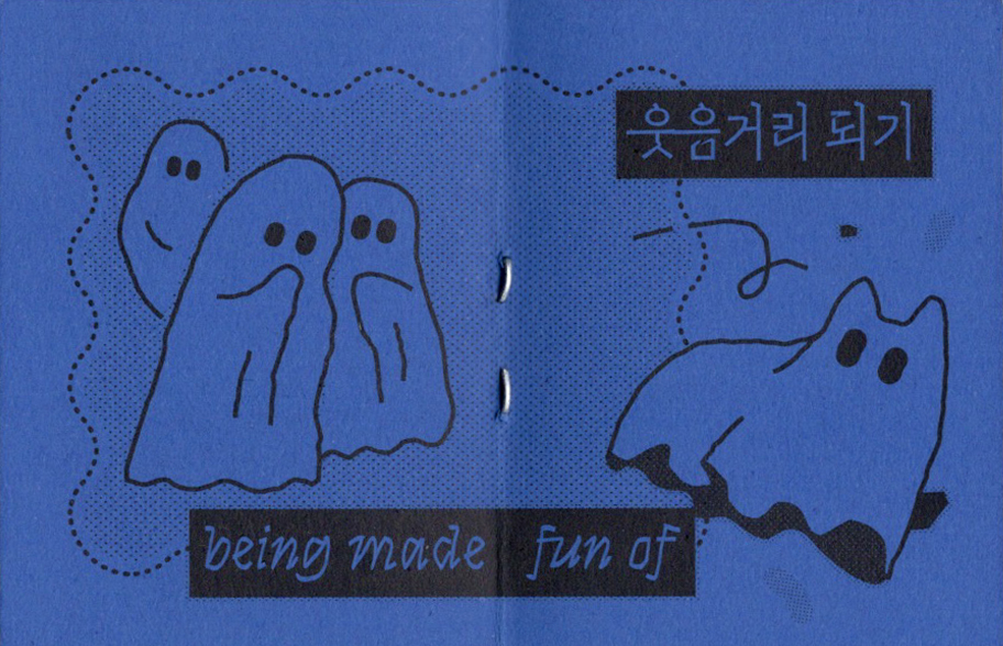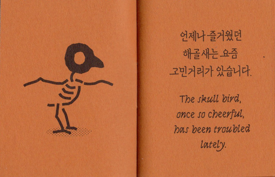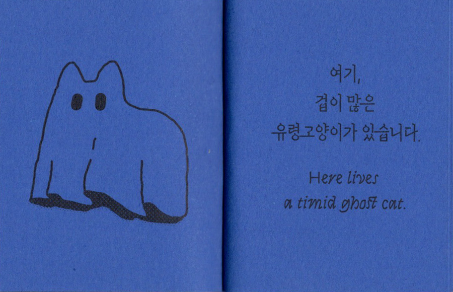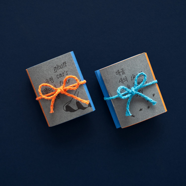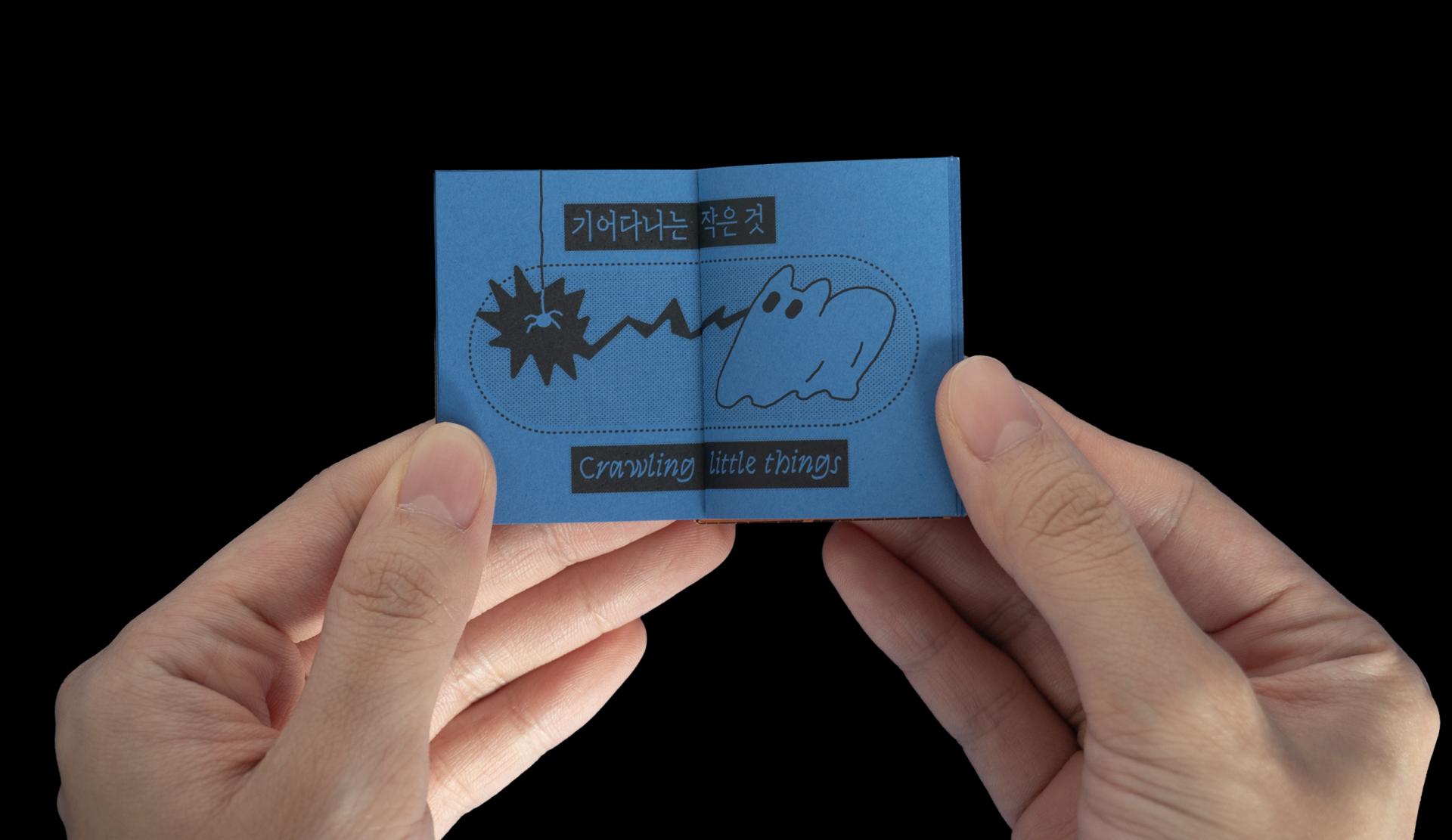 손바닥에 쏙 들어가는 작은 책에 유령고양이와 해골새의 이야기를 담았습니다. 두 권의 책이 Z자 형태로 연결되어 있어서 한쪽 면에서는 『유령고양이의 두려움』을, 반대쪽 면에서는 『해골새의 즐거움』을 읽을 수 있습니다.