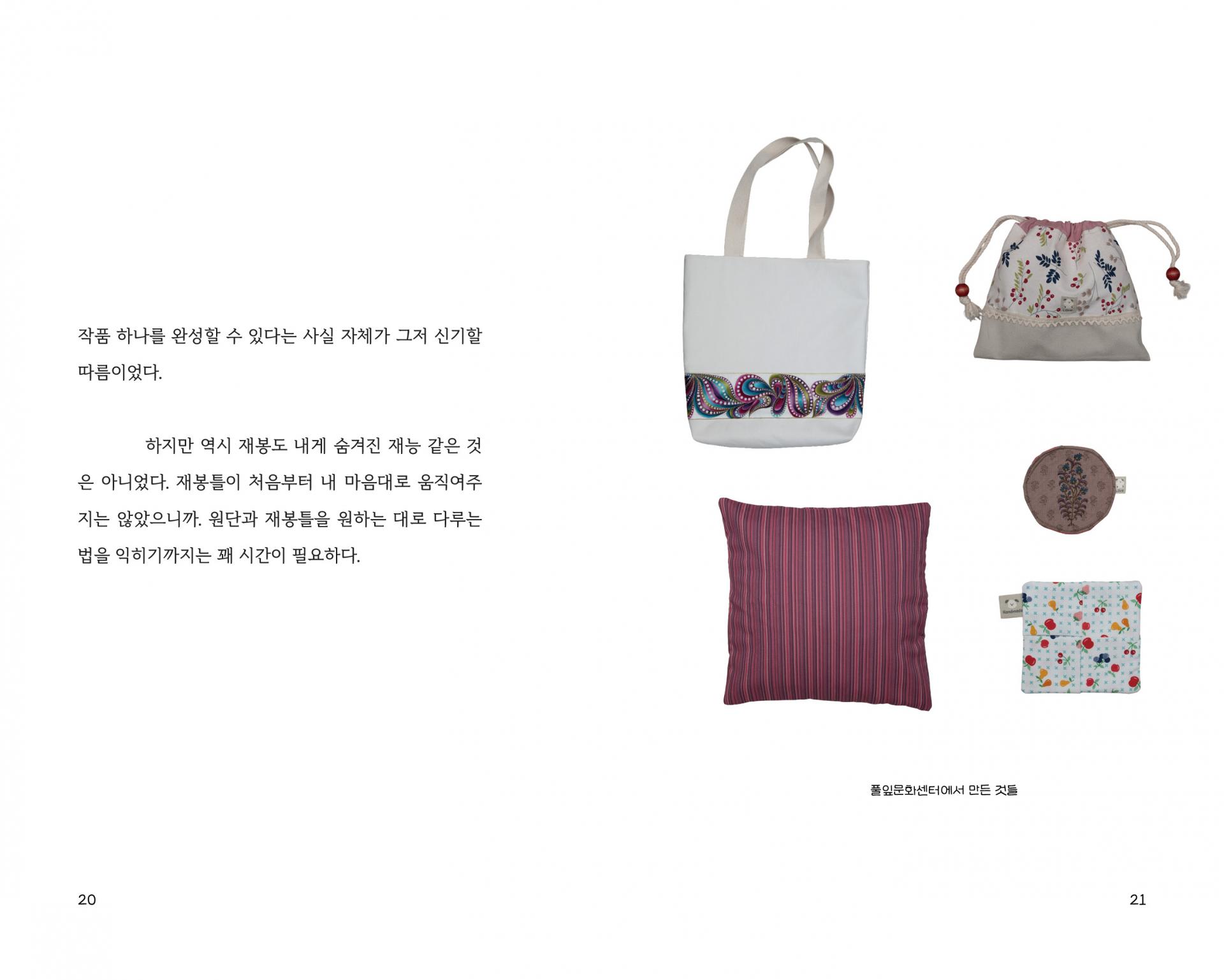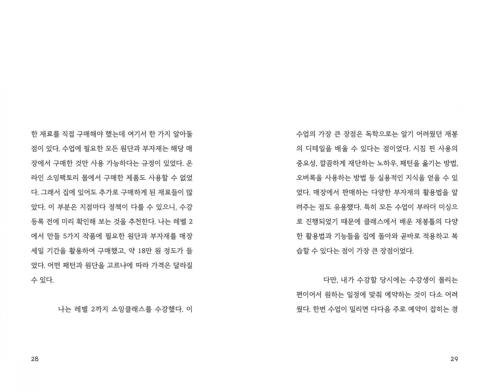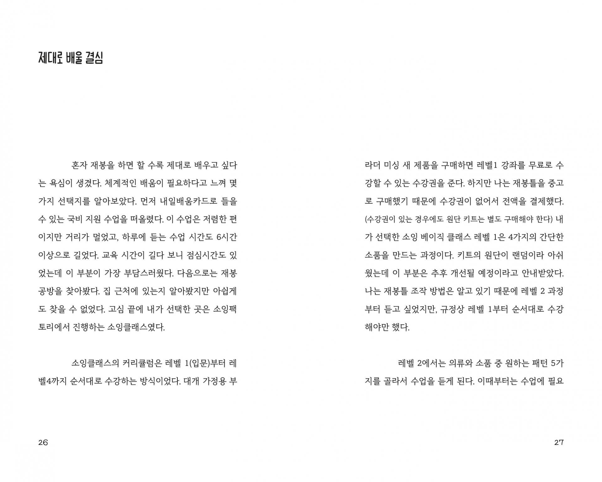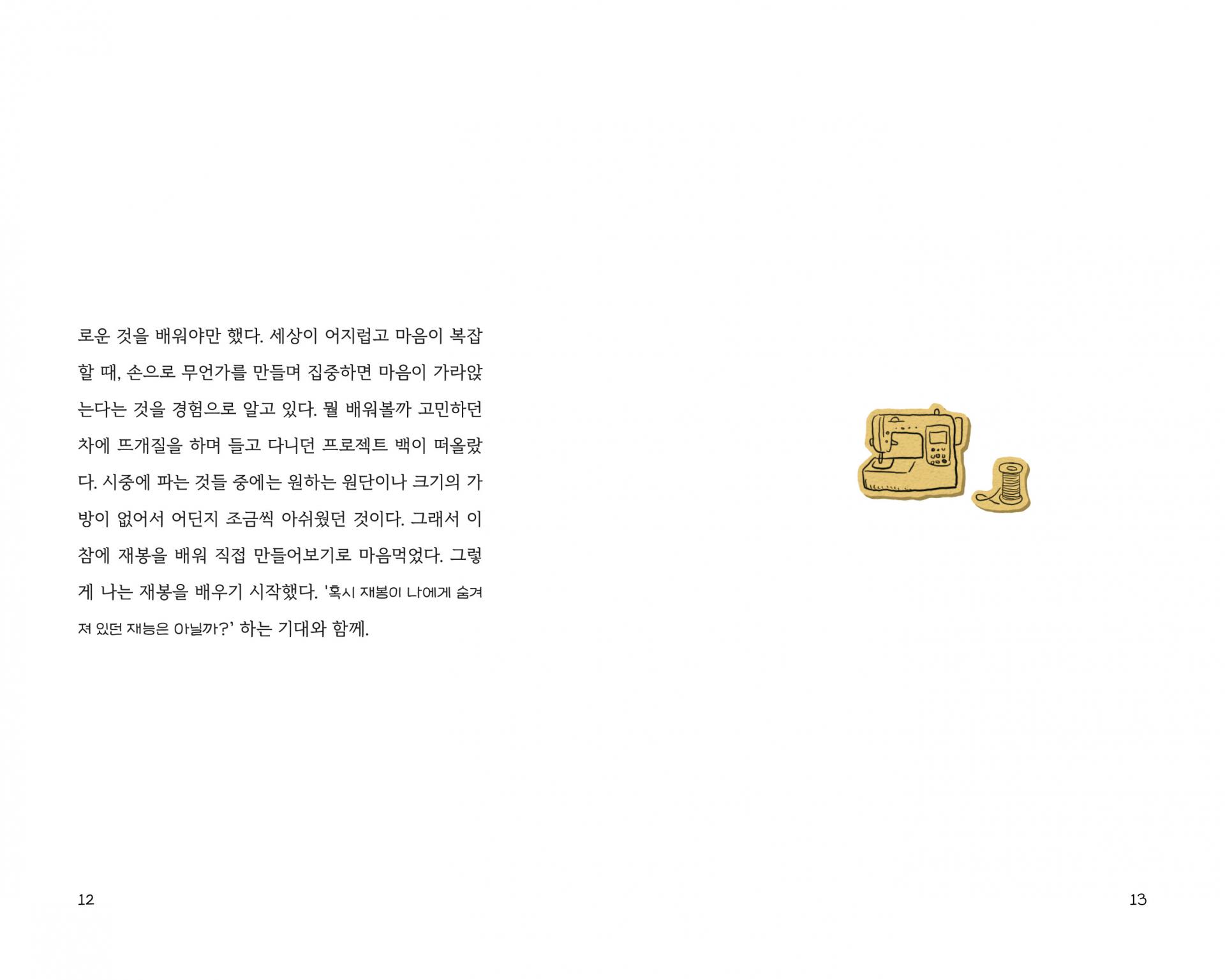 자꾸만 가라앉는 나를 붙잡기 위해 무언가 새로운 것을 배워야만 했다. 세상이 어지럽고 마음이 복잡할 때, 손으로 무언가를 만들며 집중하면 마음이 가라앉는다는 것을 경험으로 알고 있다. 뭘 배워볼까 고민하던 차에 뜨개질을 하며 들고 다니던 프로젝트 백이 떠올랐다. 시중에 파는 것들 중에는 원하는 원단이나 크기의 가방이 없어서 어딘지 조금씩 아쉬웠던 것이다. 그래서 이참에 재봉을 배워 직접 만들어보기로 마음먹었다. 그렇게 나는 재봉을 배우기 시작했다. '혹시 재봉이 나에게 숨겨져 있던 재능은 아닐까?’ 하는 기대와 함께. -재봉으로 또다시 시작되는 나의 이야기(들어가며) 중에서