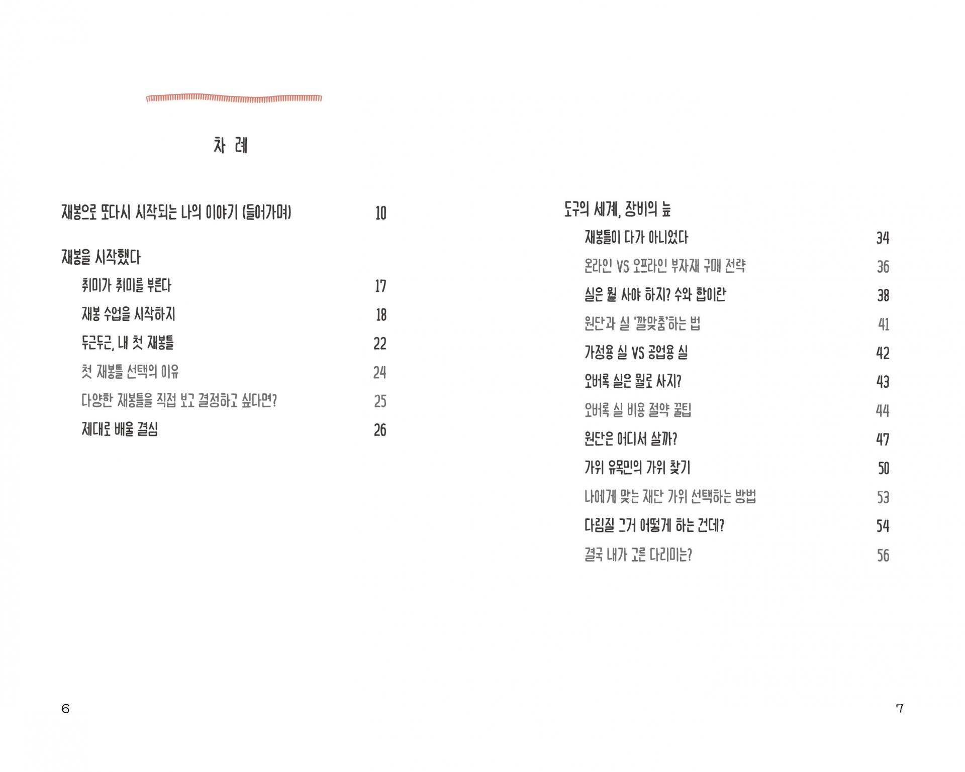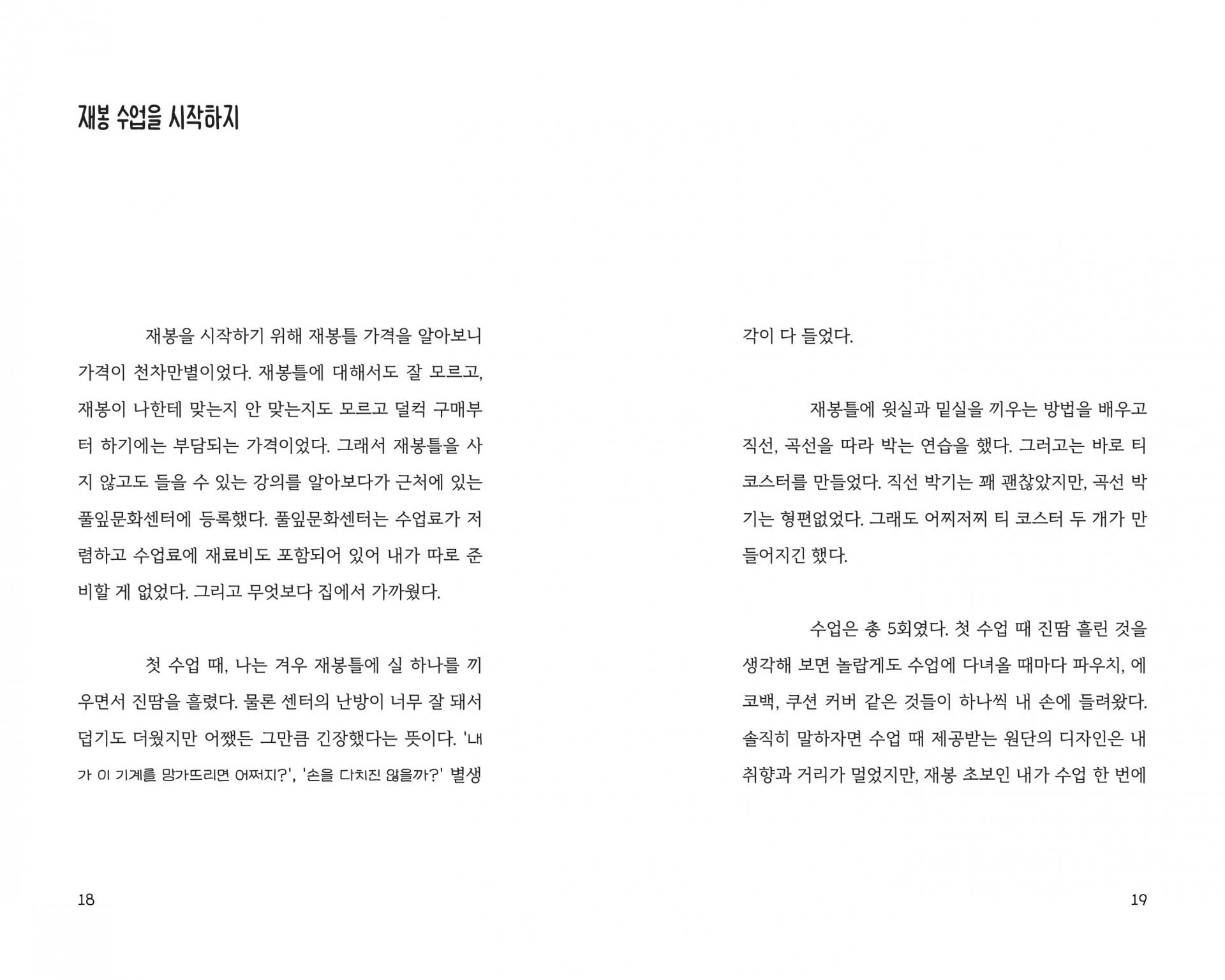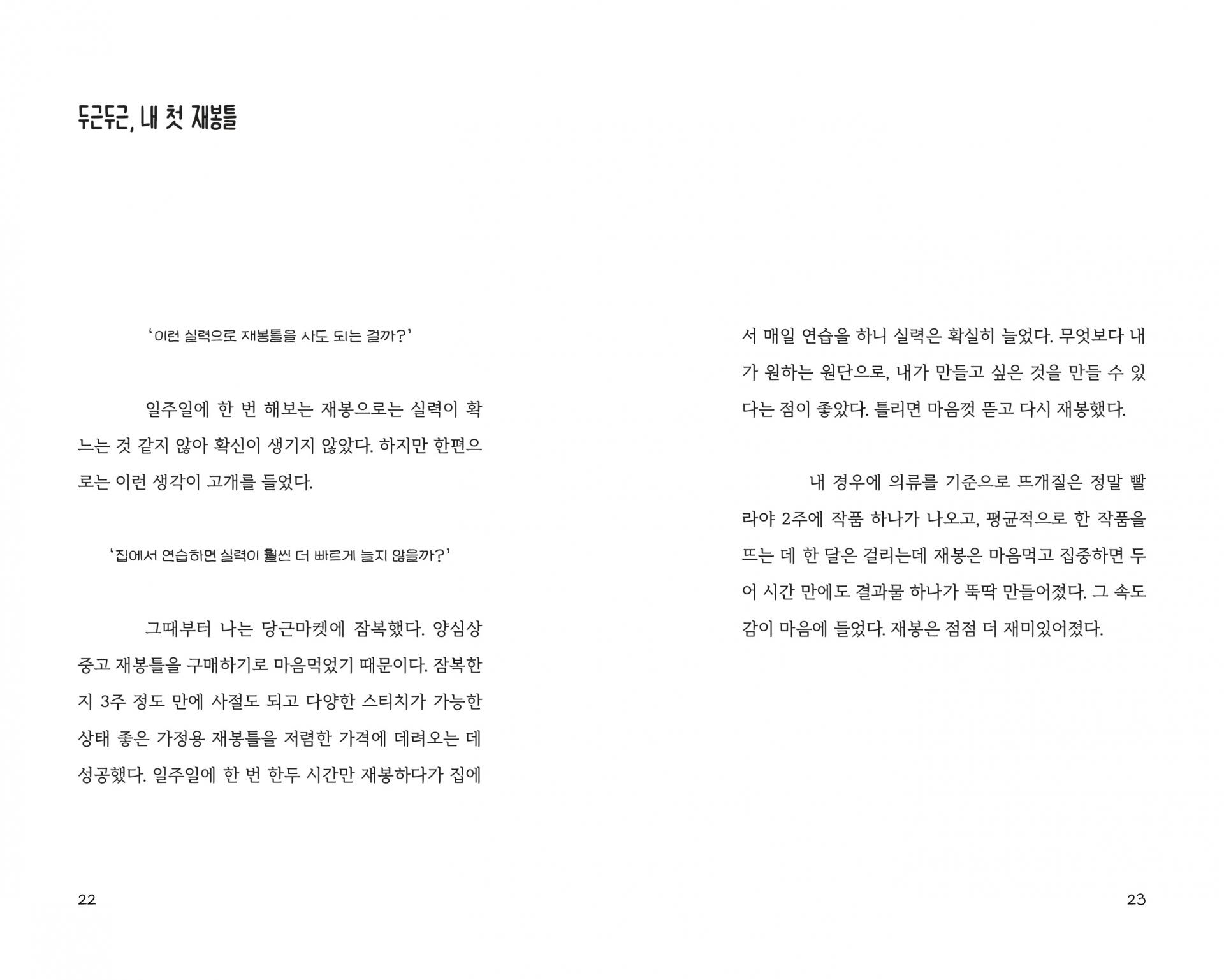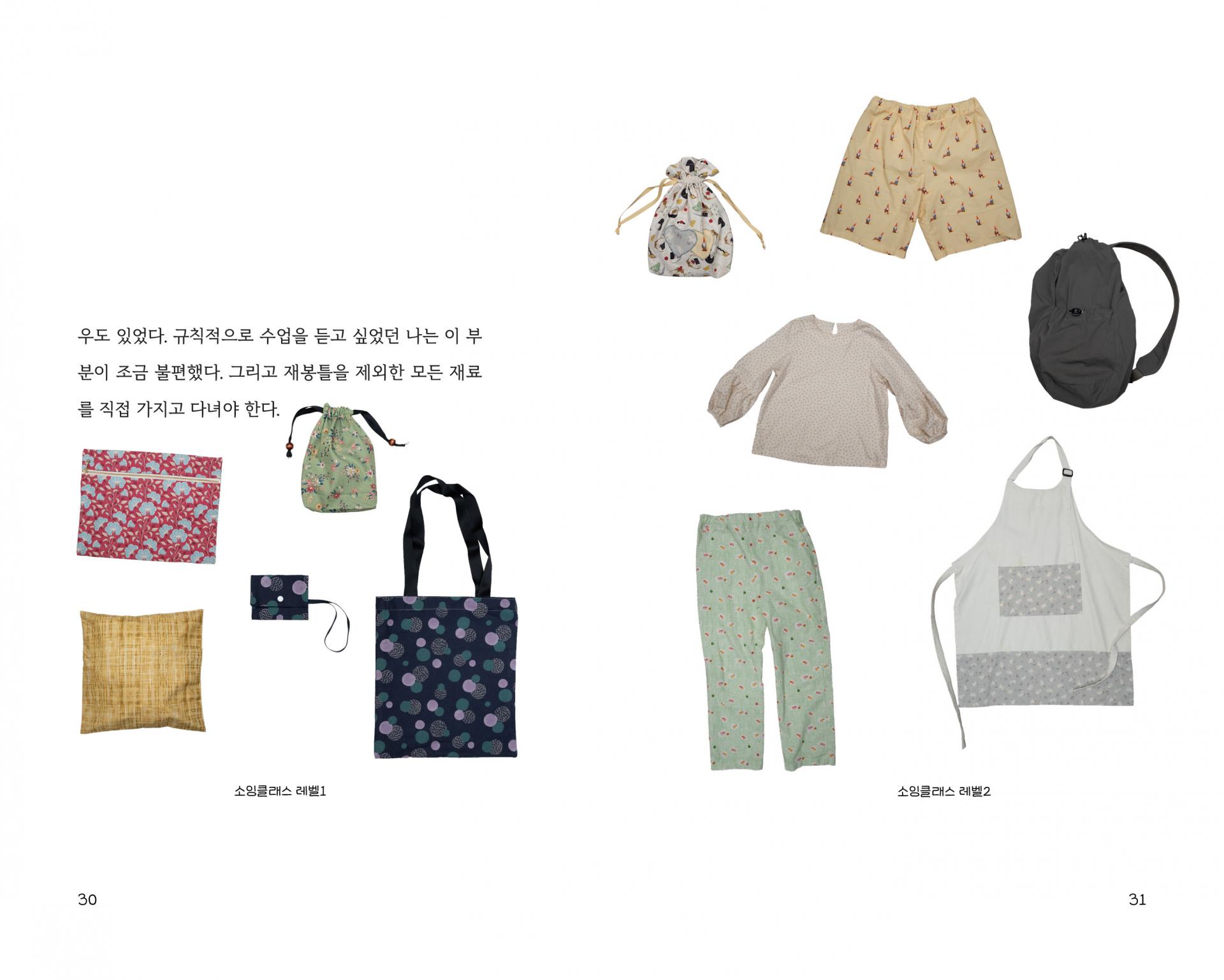 자꾸만 가라앉는 나를 붙잡기 위해 무언가 새로운 것을 배워야만 했다. 세상이 어지럽고 마음이 복잡할 때, 손으로 무언가를 만들며 집중하면 마음이 가라앉는다는 것을 경험으로 알고 있다. 뭘 배워볼까 고민하던 차에 뜨개질을 하며 들고 다니던 프로젝트 백이 떠올랐다. 시중에 파는 것들 중에는 원하는 원단이나 크기의 가방이 없어서 어딘지 조금씩 아쉬웠던 것이다. 그래서 이참에 재봉을 배워 직접 만들어보기로 마음먹었다. 그렇게 나는 재봉을 배우기 시작했다. '혹시 재봉이 나에게 숨겨져 있던 재능은 아닐까?’ 하는 기대와 함께. -재봉으로 또다시 시작되는 나의 이야기(들어가며) 중에서