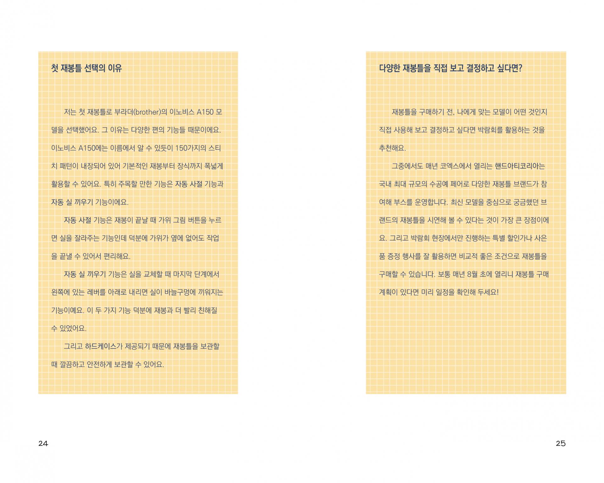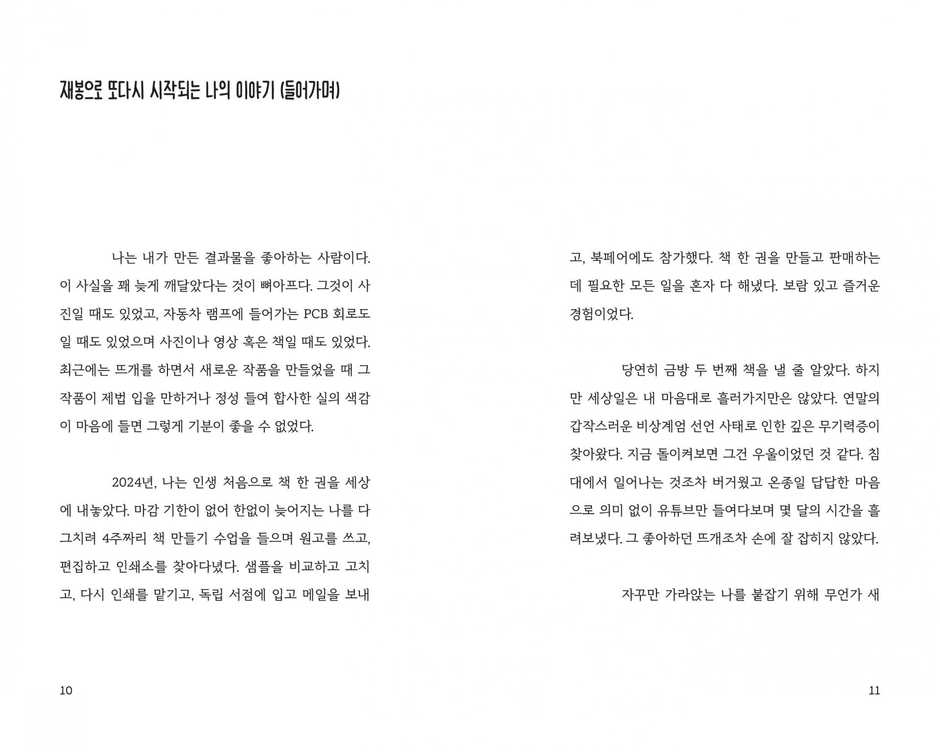 가정용 재봉틀로 시작해 공업용 재봉틀을 들여놓기까지. 더 잘하고 싶은 마음과 덜컥 저지르기엔 무서웠던 현실 사이의 고민을 기록했습니다. 재봉의 세계가 궁금하지만 시작이 막막할 때 읽기 좋은 현실적인 재봉 에세이입니다.