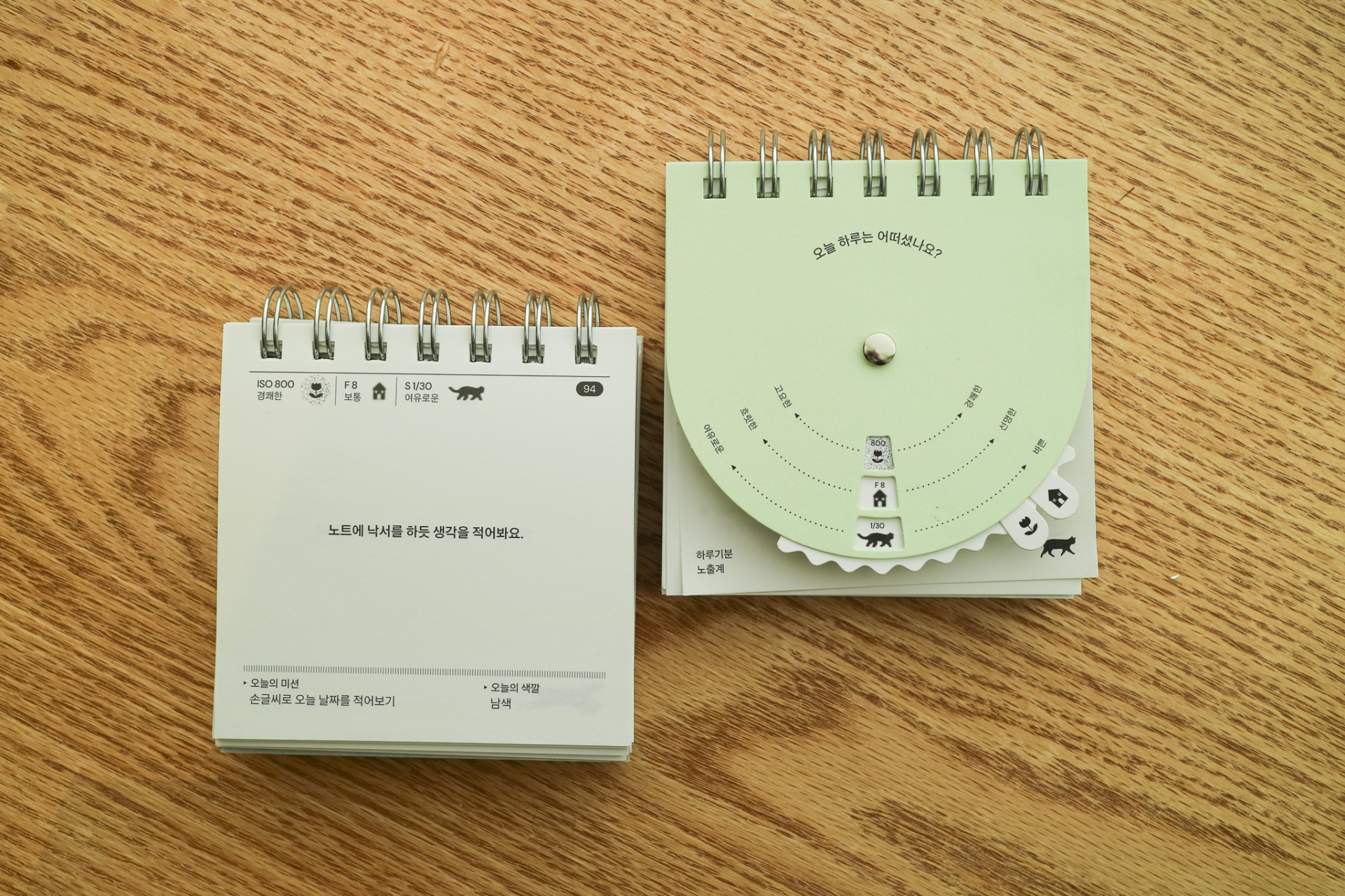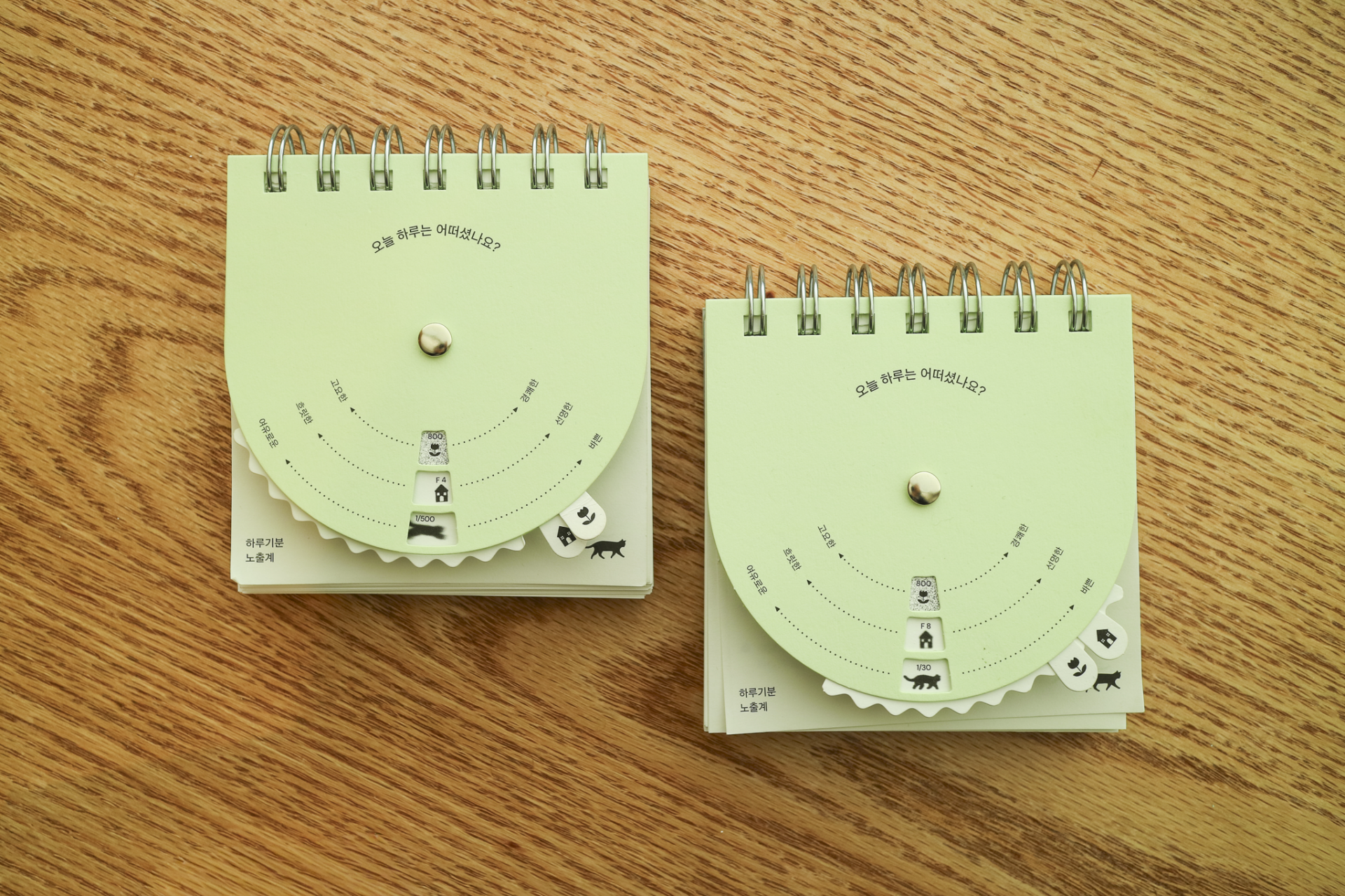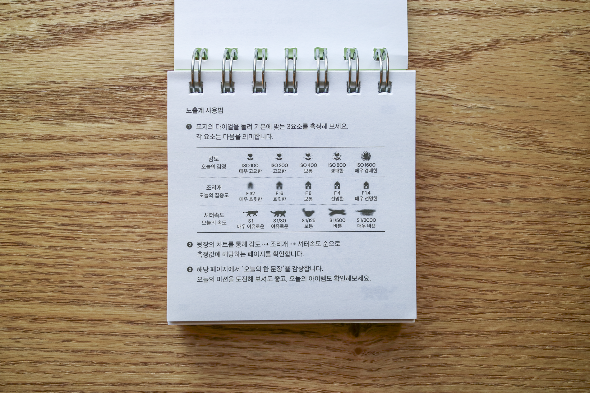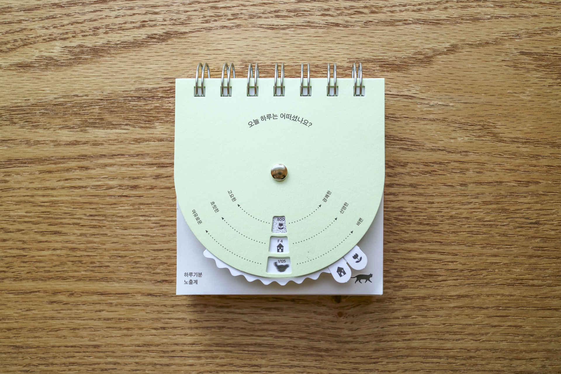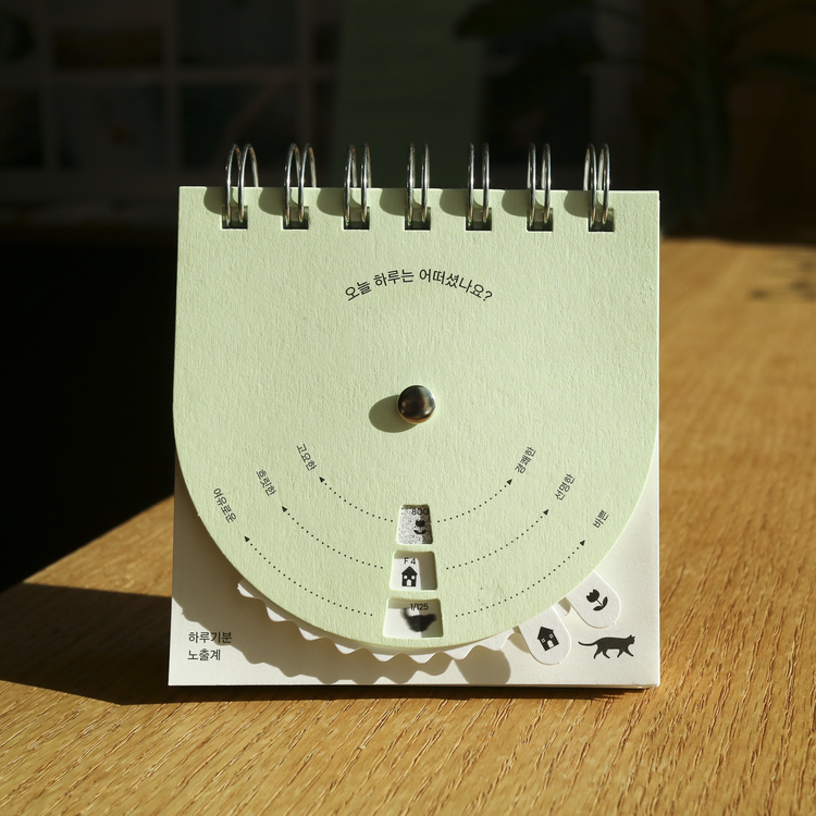 카메라 노출계의 3요소를 모티브로 하루의 기분을 측정할 수 있도록 만든 책입니다. 표지의 다이얼을 하나씩 돌리며 오늘 하루를 측정해보고 세가지 측정값을 모두 완성했다면 뒤쪽 감도 차트를 통해 오늘 내 측정값에 해당하는 페이지를 확인할 수 있습니다.