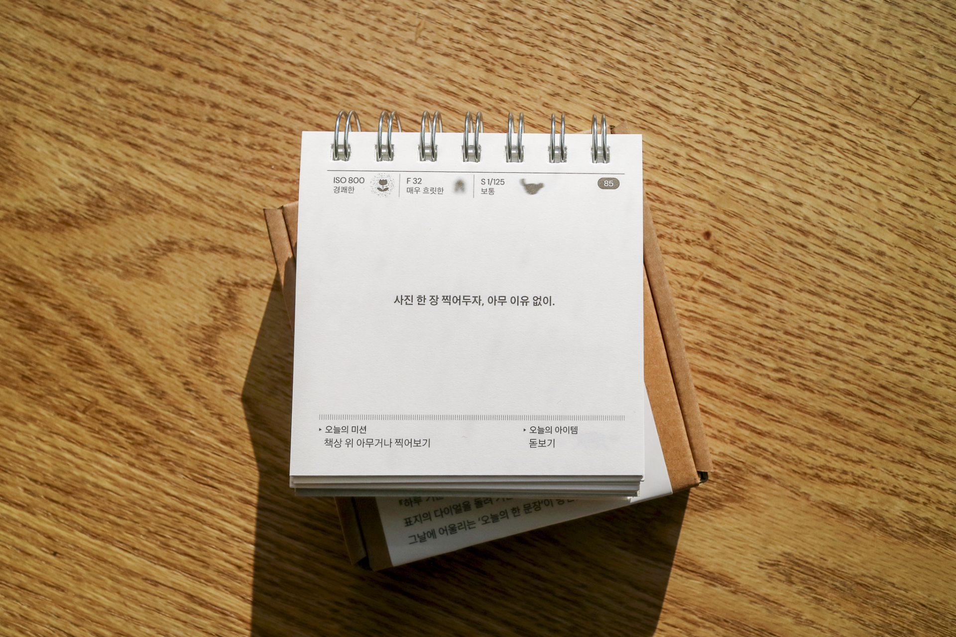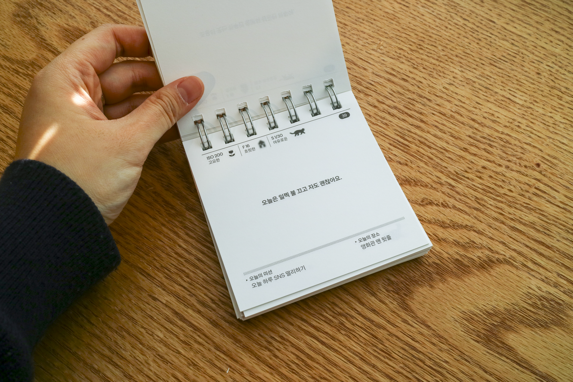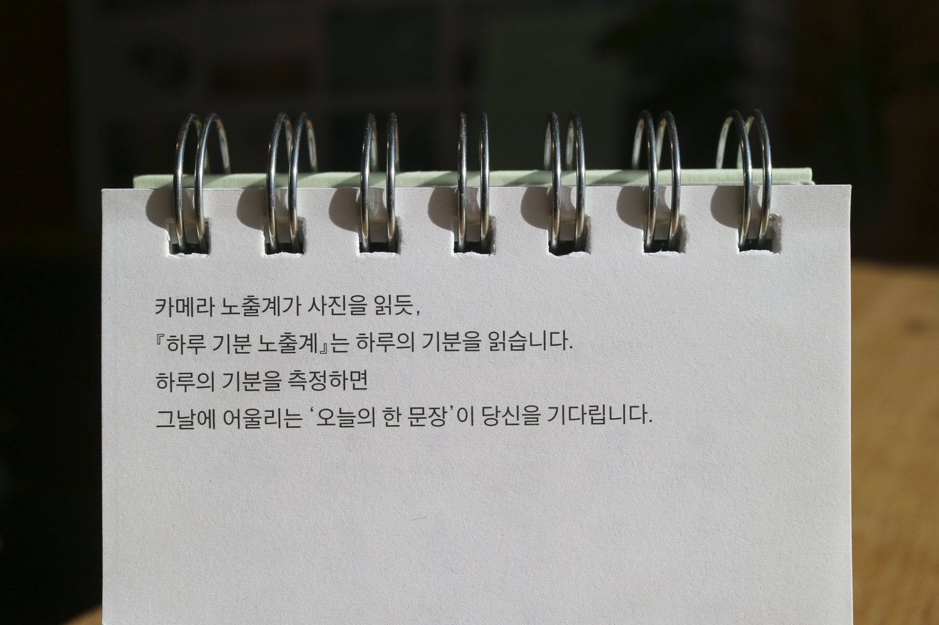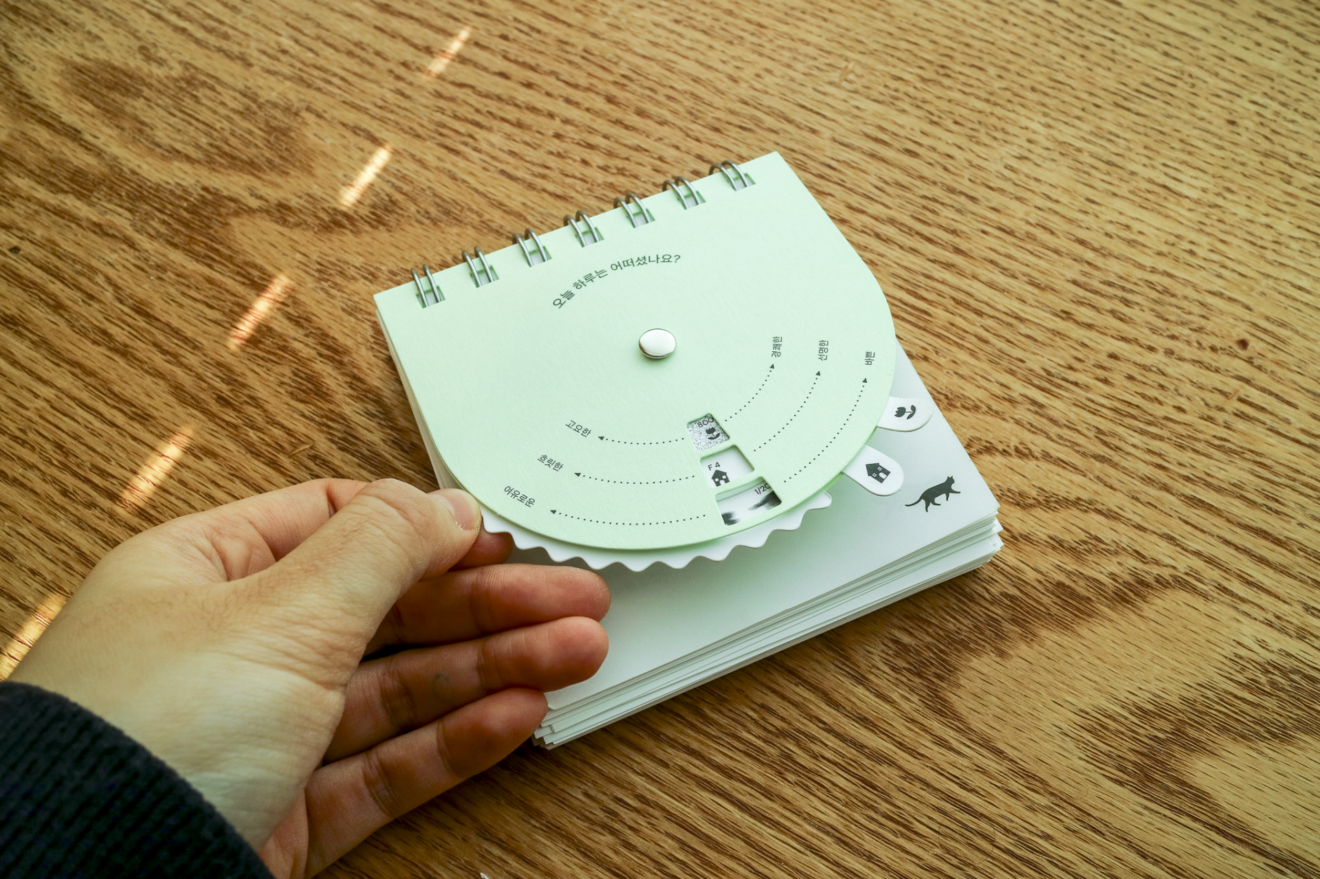 카메라 노출계의 3요소를 모티브로 하루의 기분을 측정할 수 있도록 만든 책입니다. 표지의 다이얼을 하나씩 돌리며 오늘 하루를 측정해보고 세가지 측정값을 모두 완성했다면 뒤쪽 감도 차트를 통해 오늘 내 측정값에 해당하는 페이지를 확인할 수 있습니다.