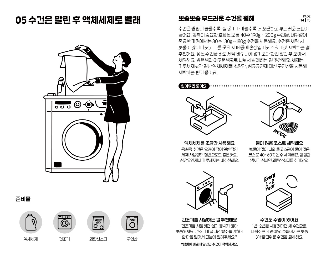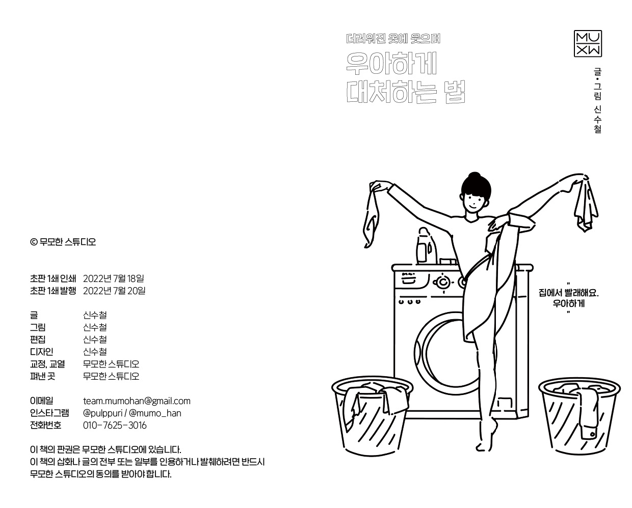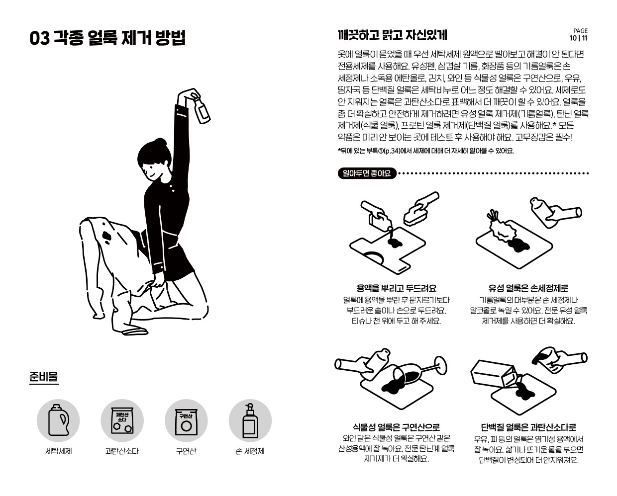 책 속에 담은 우아한 살림 동작 일러스트와 귀여운 설명 일러스트로 풀어낸 각종 얼룩 제거 방법, 표백제 사용 방법, 신발 세탁 방법 등으로 집안일 하는 우아한 사람들에게 도움이 되기를 바랍니다.