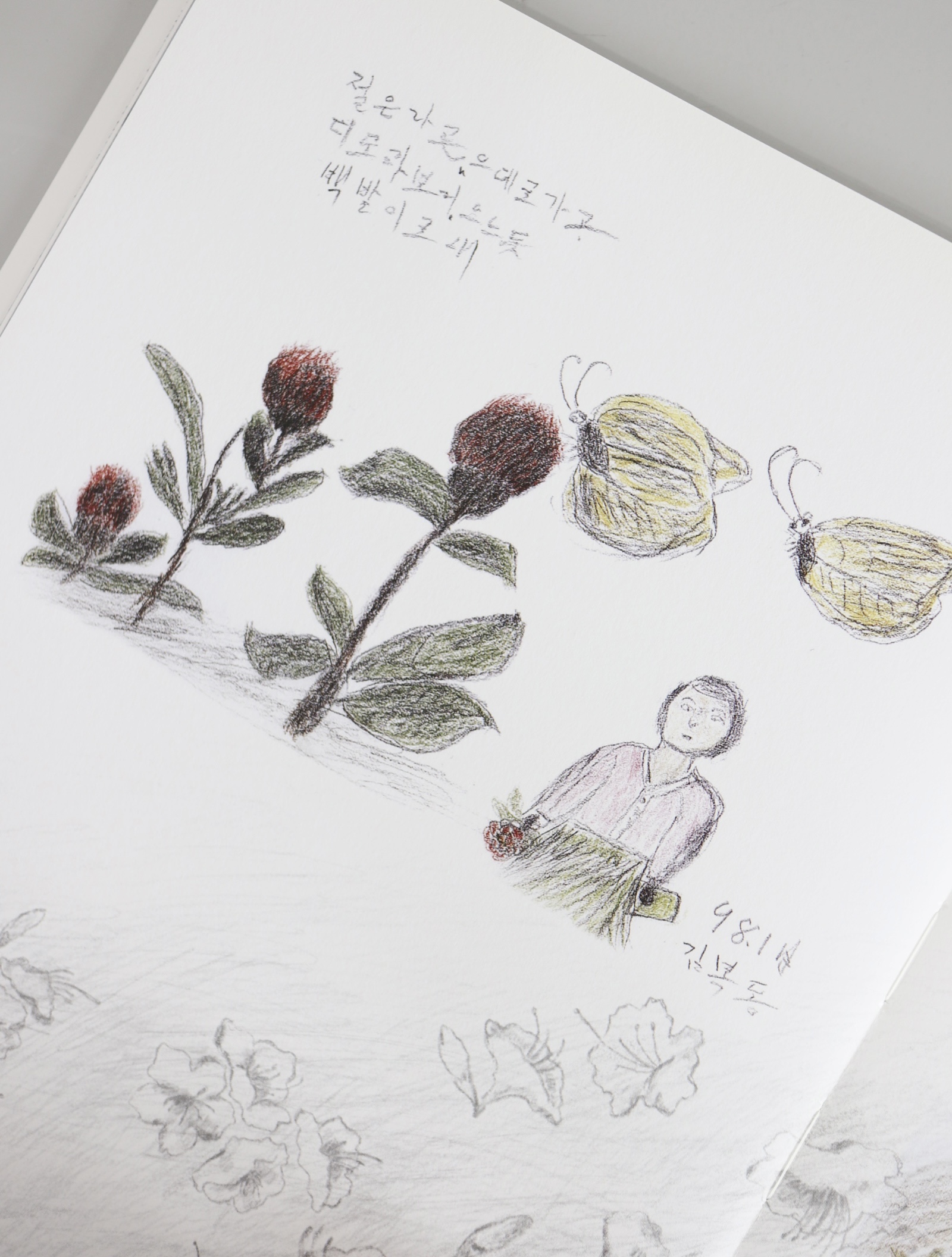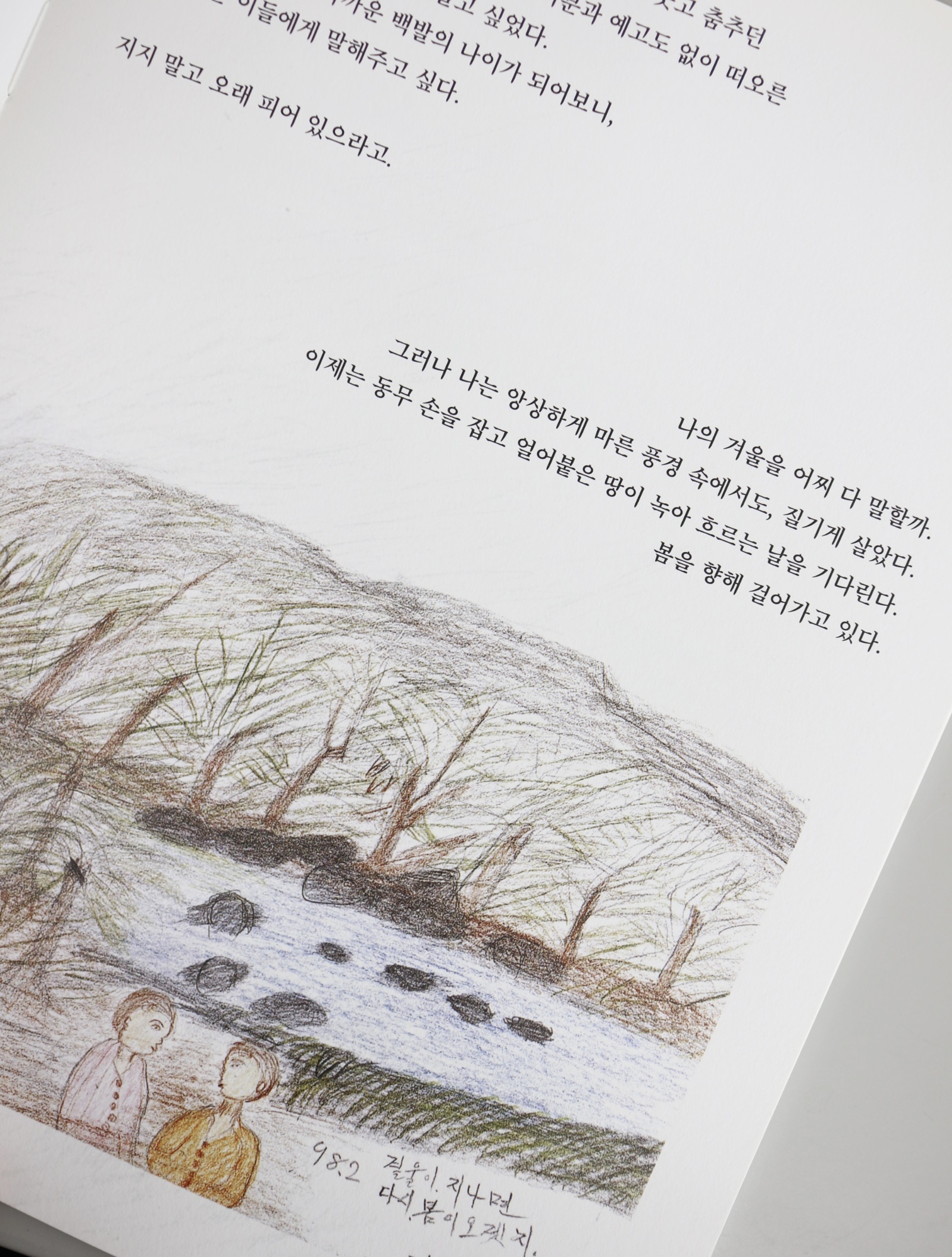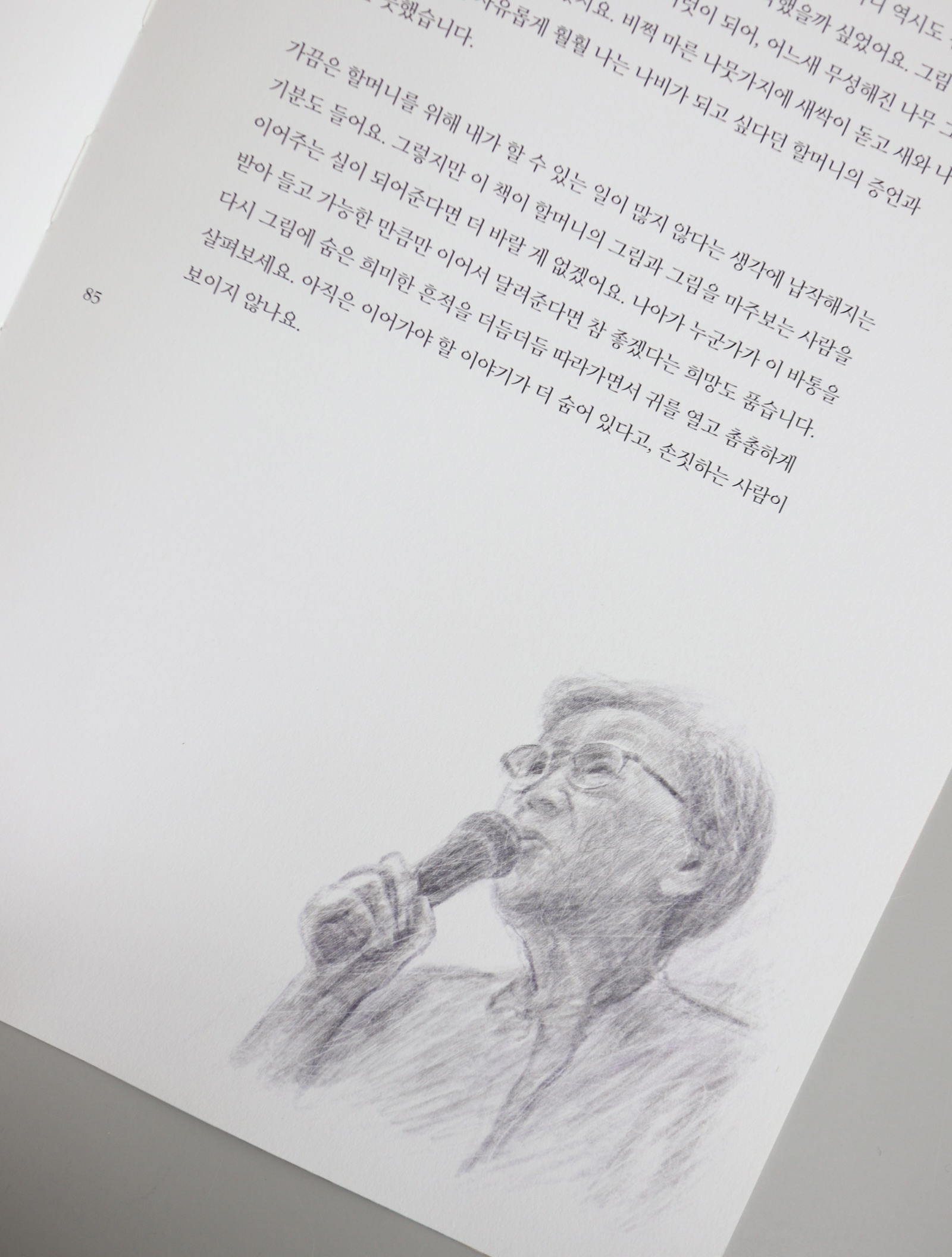 마치 헝클어진 타래에서 실낱 하나를 끄집어 올리듯, 김지현은 그림에 새겨진 김복동의 기억과 감정의 흔적들을 그림과 시의 언어로 표현했다. 조심스럽지만 적극적으로 그 그림들의 뒤를 잇듯 그리고, 또 이어서 썼다. 역사적 기록물로서 일본군 ‘위안부’ 피해사실을 열거하기보다, 김복동이 일상 속에서 만났을 풍경과 사람, 마음 속 이야기를 풀어내는 작업에 집중했다. 삶에 대한 의지와 번민, 그저 평범한 생을 살고 싶은 한 사람으로서의 내면 풍경을 김복동의 그림에서 찾아 풀어냄으로써, 김복동의 일상이 어디에나 있는 우리 이웃의 일상처럼 독자의 삶 곁에 머무를 수 있었으면 하는 바람을 담았다. 나아가 작가는 이제 고인이 되어 마주할 수 없는 분들을 우리가 어떻게 기억하고 그 기억을 이어갈 수 있을지를 고민하며 질문하고 있기도 하다.