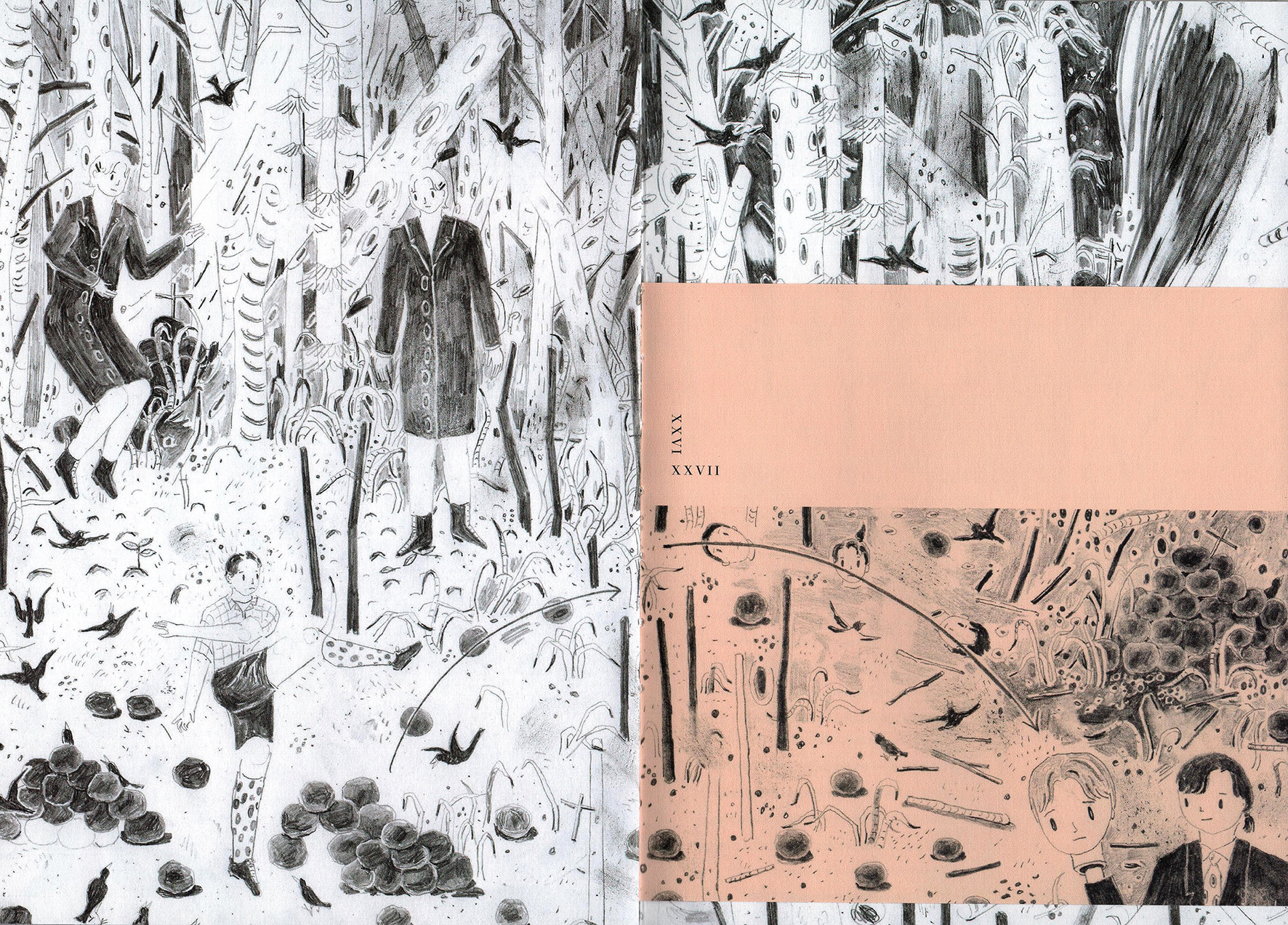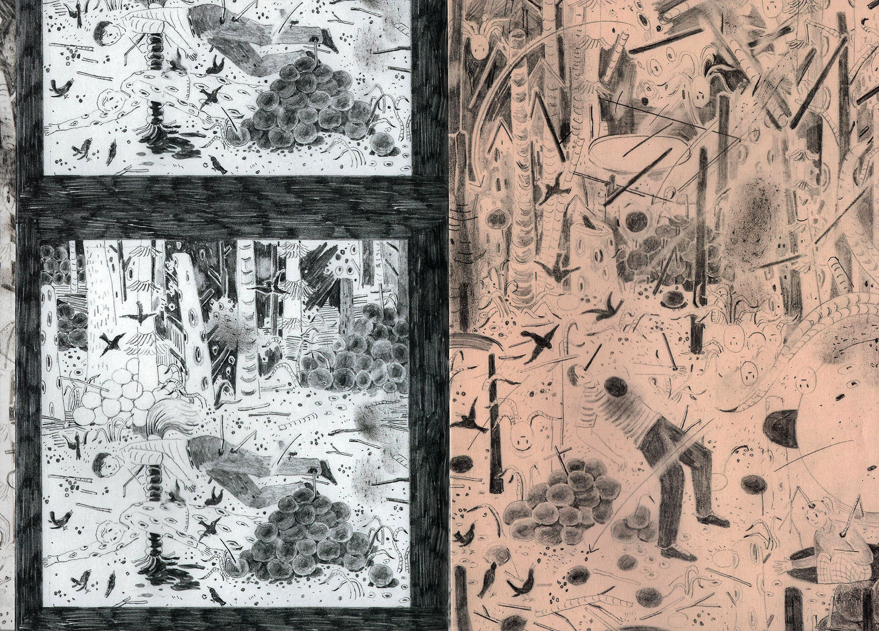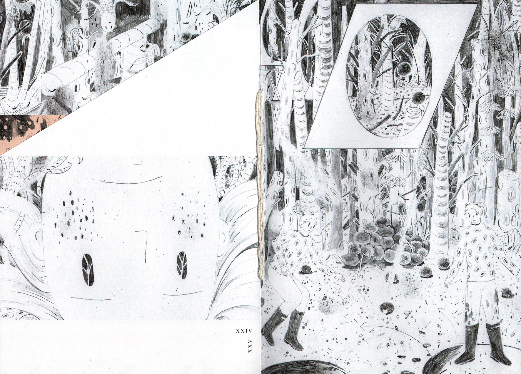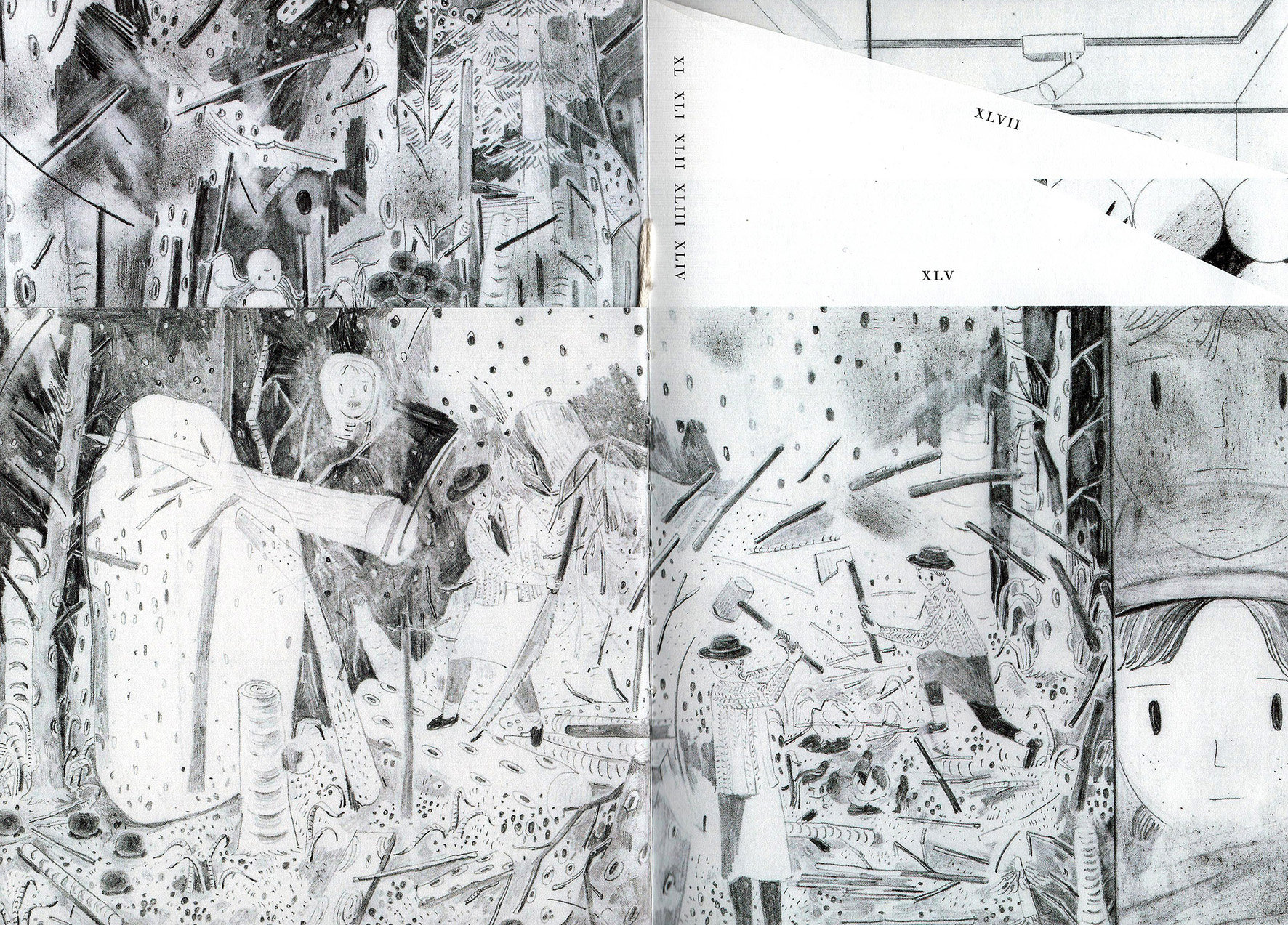 숲 속에 서 있는 사람의 모공 속: 눈에 나뭇가지가 박힌 옆집여자, 돌무덤, 토끼 똥, 씨앗괴물, 까마귀에 관한 이야기입니다. 책의 마지막 페이지는 맨 앞장과 이어집니다. 이는 영원히 끝나지 않는 돌림노래와 같습니다. 작가가 손수 실로 엮었으며, 책마다 에디션넘버가 있습니다.