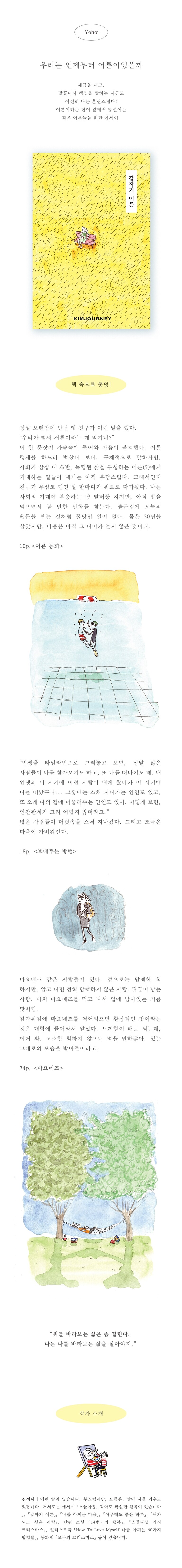 어른이라는 단어 앞에서 망설이는 이들을 위한 에세이, 『갑자기 어른』의 개정판이 출간되었다. 작가는 이 책을 통해 ‘어른이 되는 과정’에 대한 솔직한 감정을 담담하게 풀어낸다. 서른이 되었지만 여전히 만화를 보고, 출근길에 웹툰 한 편에 웃음을 터뜨리는 일상이 낯설지 않은 자신을 보며, 어른이라는 말이 얼마나 무거운지, 그리고 그 무게를 어떻게 받아들이고 있는지를 고백한다.어느날 보니, 세금을 내는 어른이 되어버렸습니다. 문득, 어른에게도 동화같은 로맨스가 필요하다는 생각이 듭니다.