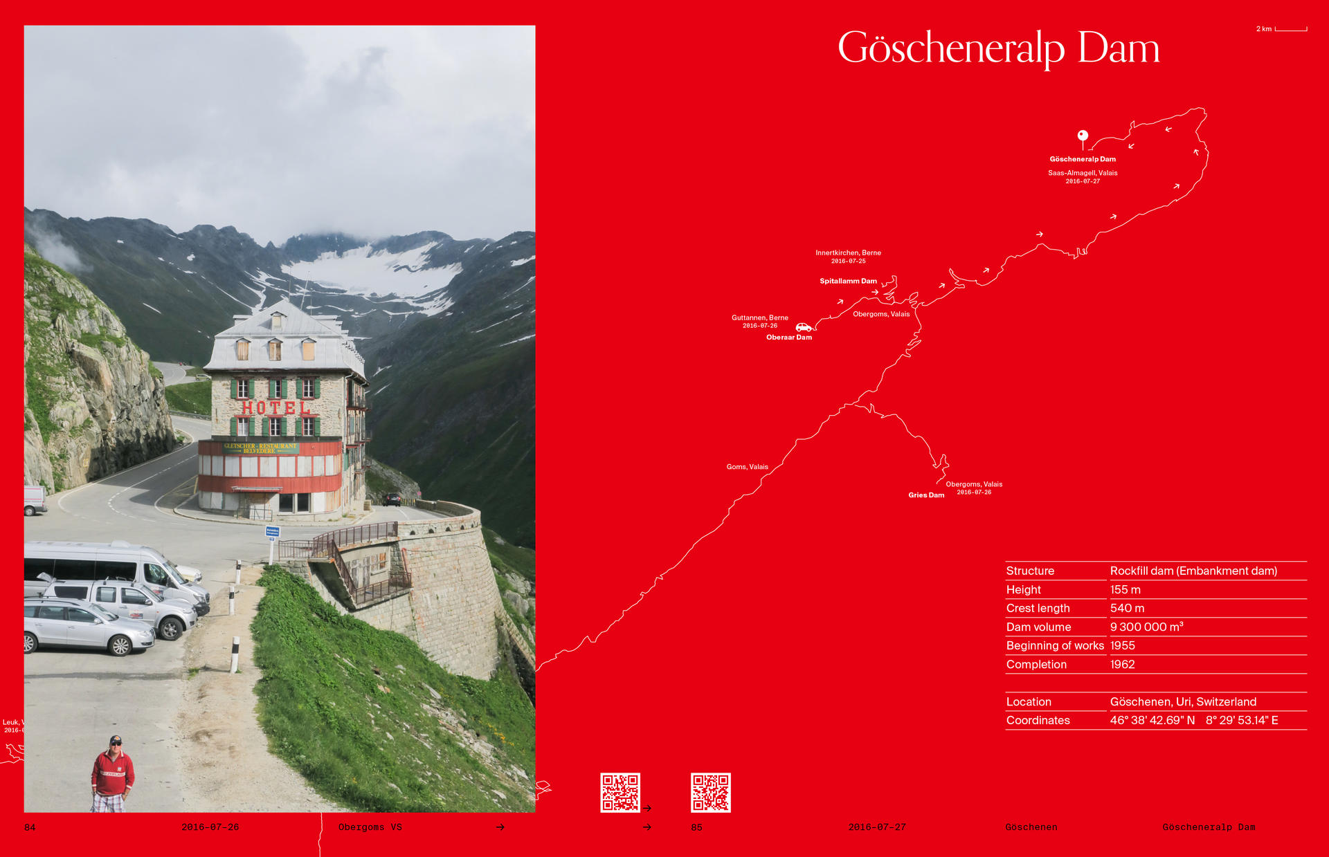 이 책은 2016년 7월 18일부터 8월 9일까지 김경태 사진가가 스위스의 댐을 방문하며 촬영한 사진과 비디오를 엮은 사진집이다. 기록된 자료들을 배열하기 위해 당시 댐을 찾아가며 이동했던 주행 경로가 담긴 지도 데이터와 이미지, 비디오 파일의 생성 일시를 대조하며 시간 순으로 추적했다. 결과적으로 책에는 180점의 사진과 24점의 영상이 담겼다. 독자 또한 책 속에 나열된 시청각 지표를 통해 촬영한 당시의 현장감을 추적할 수 있기를 바란다. 나아가 거대한 구조물과 그 주변 풍경을 바라보는 사진가의 시선을 좇으며, 크기에 대한 감각을 상상해 보는 시간을 가지길 권하고 싶다.