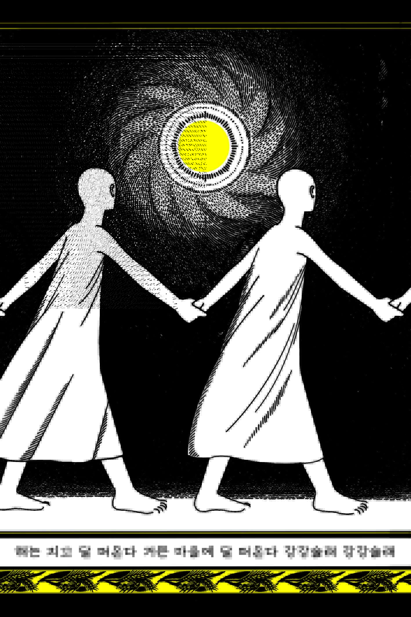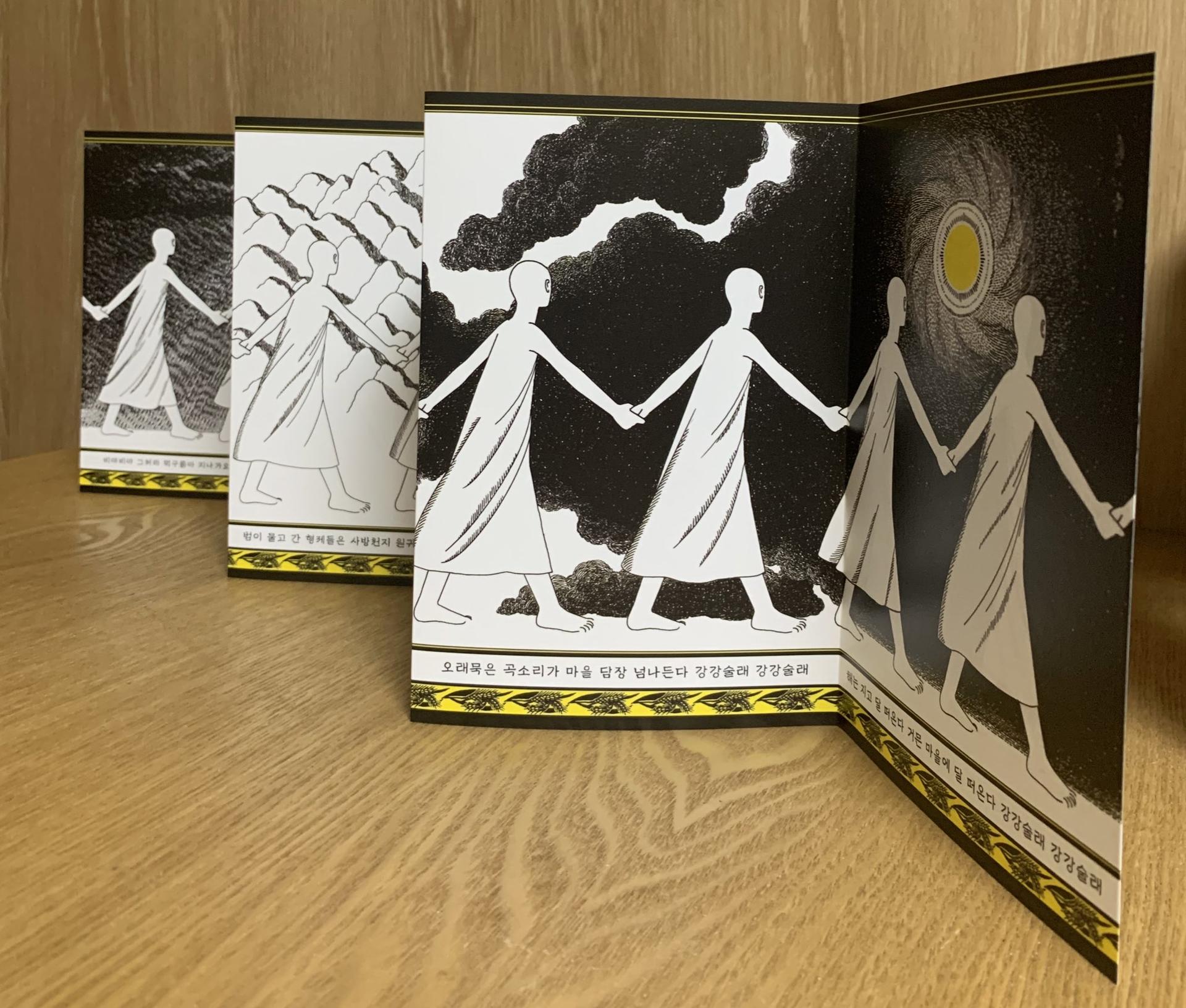 인물들이 반복적으로 등장하며, 강강술래 노래가사를 담은 아코디언 북입니다.
