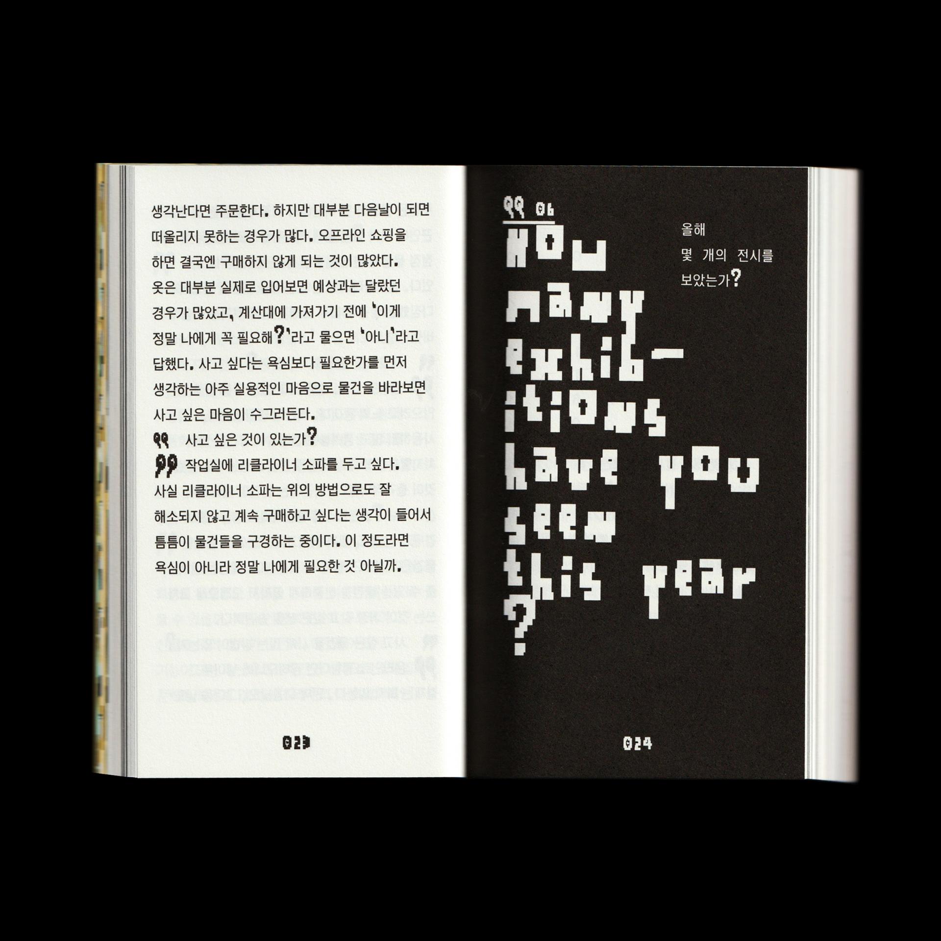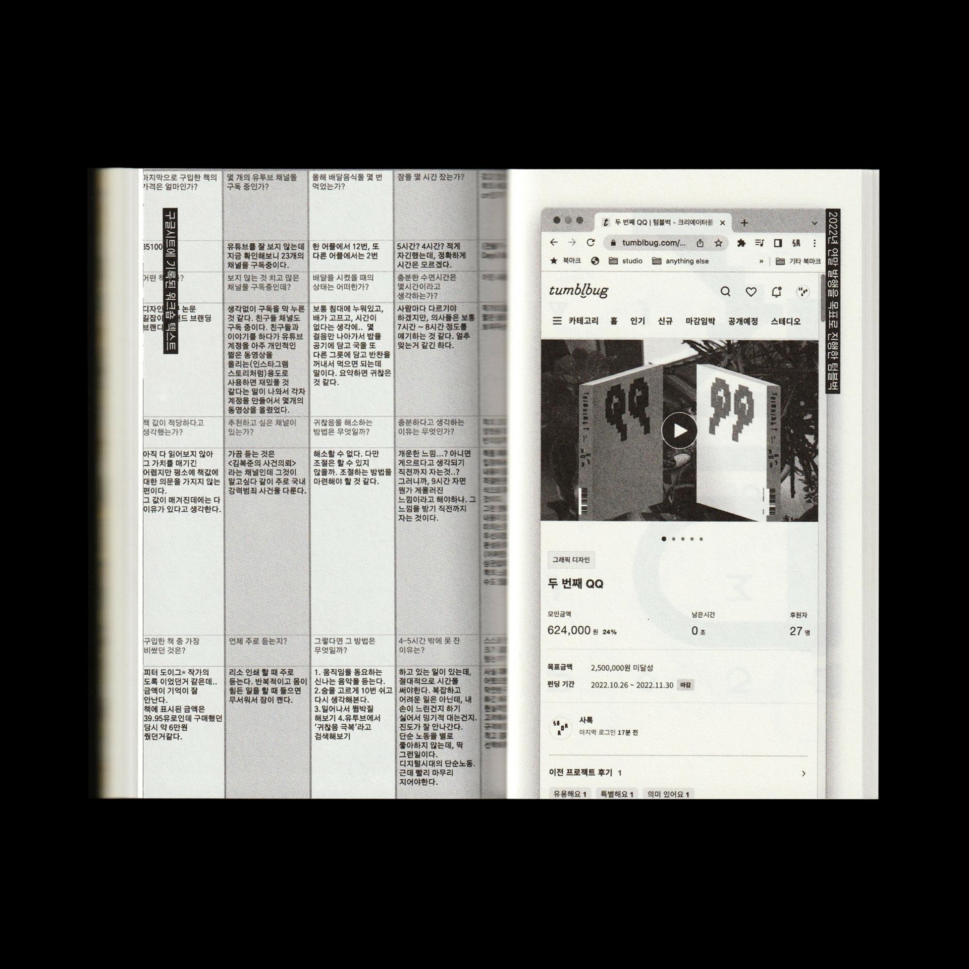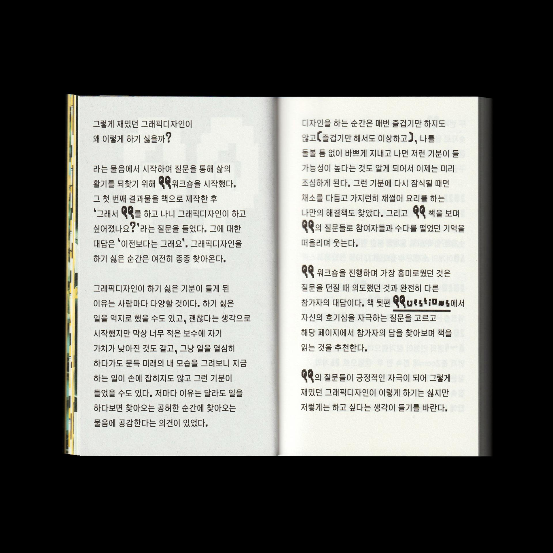 ‘QQ’는 그래픽디자인을 하고자 하는 욕구를 일깨우기 위해 질문에 질문을 잇는 워크숍을 진행하고 그 결과물을 엮은 책이다. 2020년에 여름에 이어 발행하는 두 번째 QQ는 2022년 1월부터 6월까지 웹사이트에서 수집한 질문에 대한 숫자와, 구글시트에서 세 번의 워크숍을 통해 발생한 텍스트를 담았다. 첫 번째 워크숍과 달리 두 번째 워크숍은 ‘숫자’로 응답할 수 있는 질문 26가지(‘마지막으로 산 책의 가격은 얼마인가?’ ‘몇 명의 사람과 이야기하기를 좋아하는가’ ‘이름을 알고 있는 강아지/고양이는 몇 마리인가’ ‘갖고 있는 가장 작은 책의 세로 높이는 몇 cm인가’ ‘하루 중 인스타그램에서 좋아요를 몇 번 누를까’ 등)를 준비했다.