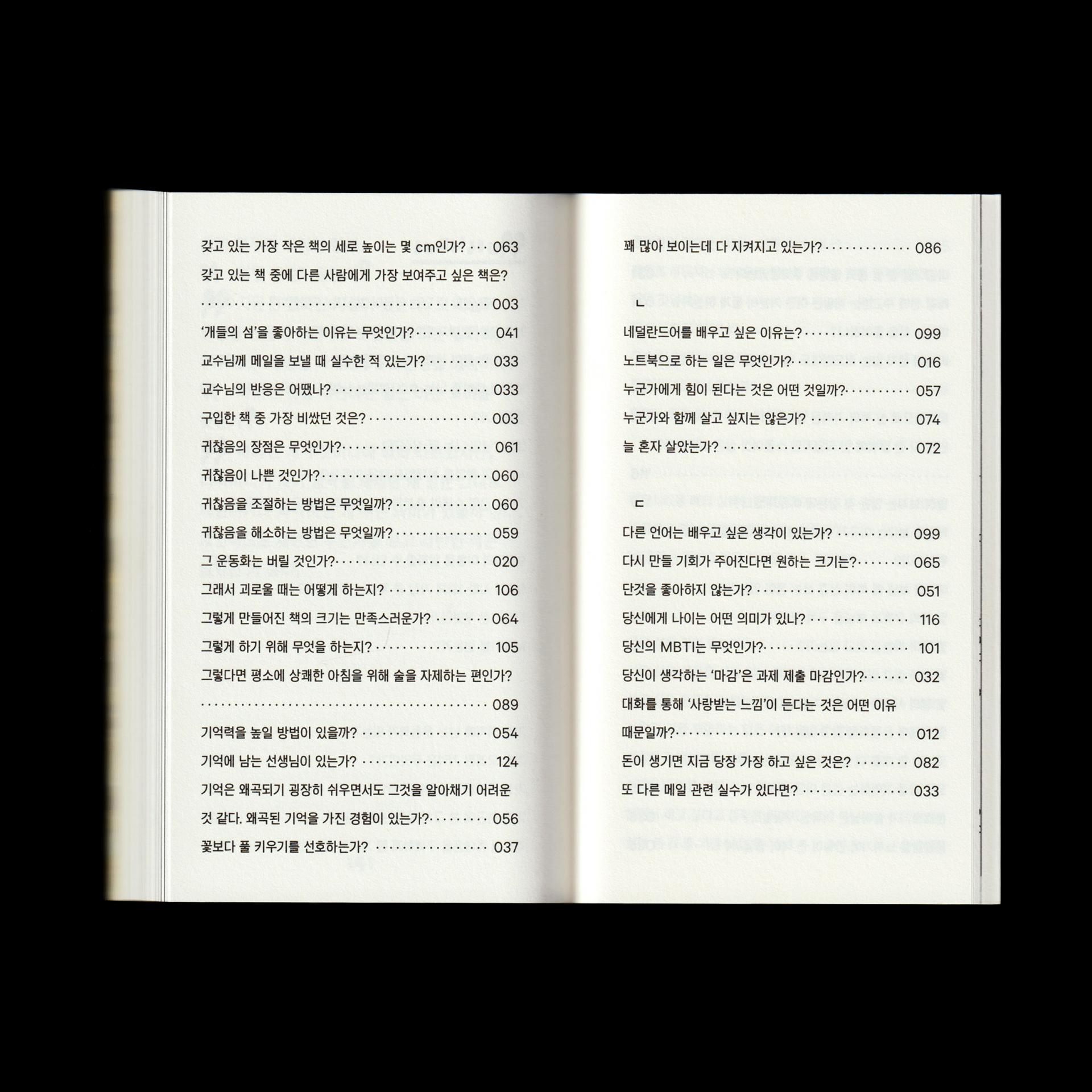 책은 26개의 질문에 대한 참여자들의 응답과 이 과정에서 파생된 222개의 질문들, 저자가 작성한 질문과 응답인 ‘두 번째 QQ 워크숍을 운영하고 책을 만드는 동안 스스로 어떤 질문을 했는가?’, 세 번째 큐큐를 위한 질문(엽서)로 구성되어 있다.