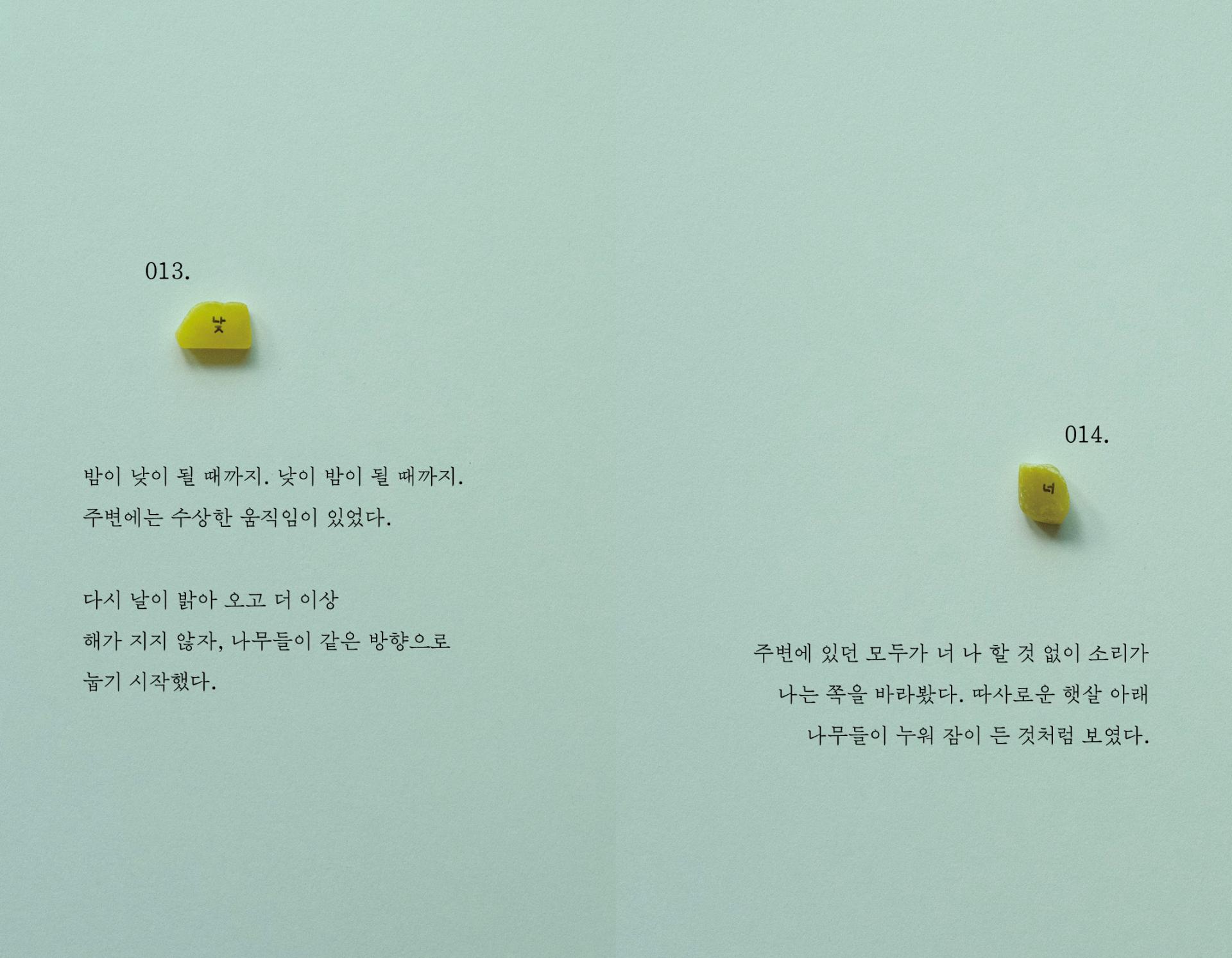 p.18 밤이 날이 될 때까지, 낮이 밤이 될 때까지. 주변에는 수상한 움직임이 있었다. 다시 날이 밝아 오고 더 이상 해가 지지 않자, 나무들이 같은 방향으로 눕기 시작했다.