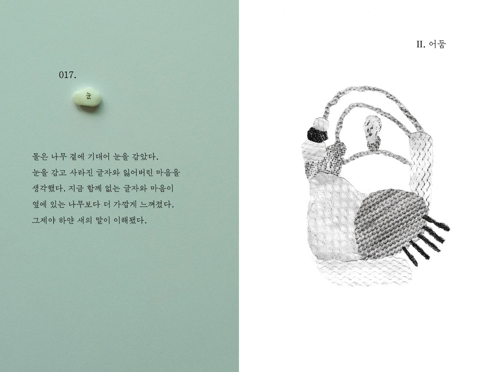 《돌과 말》은 작은 돌에 적힌 100개의 단어를 각각 하나의 문장으로 완성하고, 문장을 모아 유기적인 서사를 이룬 책이다. 돌을 주인공으로 삼아 탄생, 어둠, 혼란, 경계, 등장, 만남으로 이어지는 여정을 담는다. 이 과정에서 짧은 문장들이 앞뒤 장면과 연결되며 빛과 어둠, 머묾과 사라짐 같은 대비를 조용히 보여준다.