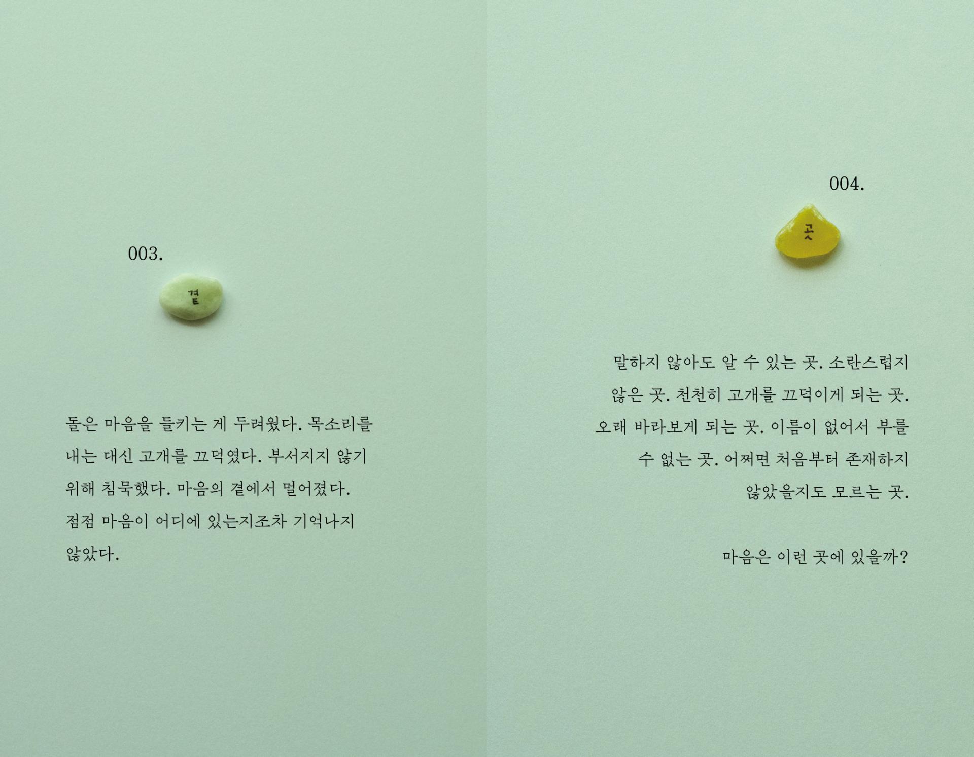 p.9 말하지 않아도 알 수 있는 곳. 소란스럽지 않은 곳. 천천히 고개를 끄덕이게 되는 곳. 오래 바라보게 되는 곳. 이름이 없어서 부를 수 없는 곳. 어쩌면 처음부터 존재하지 않았을지도 모르는 곳. 마음은 이런 곳에 있을까?