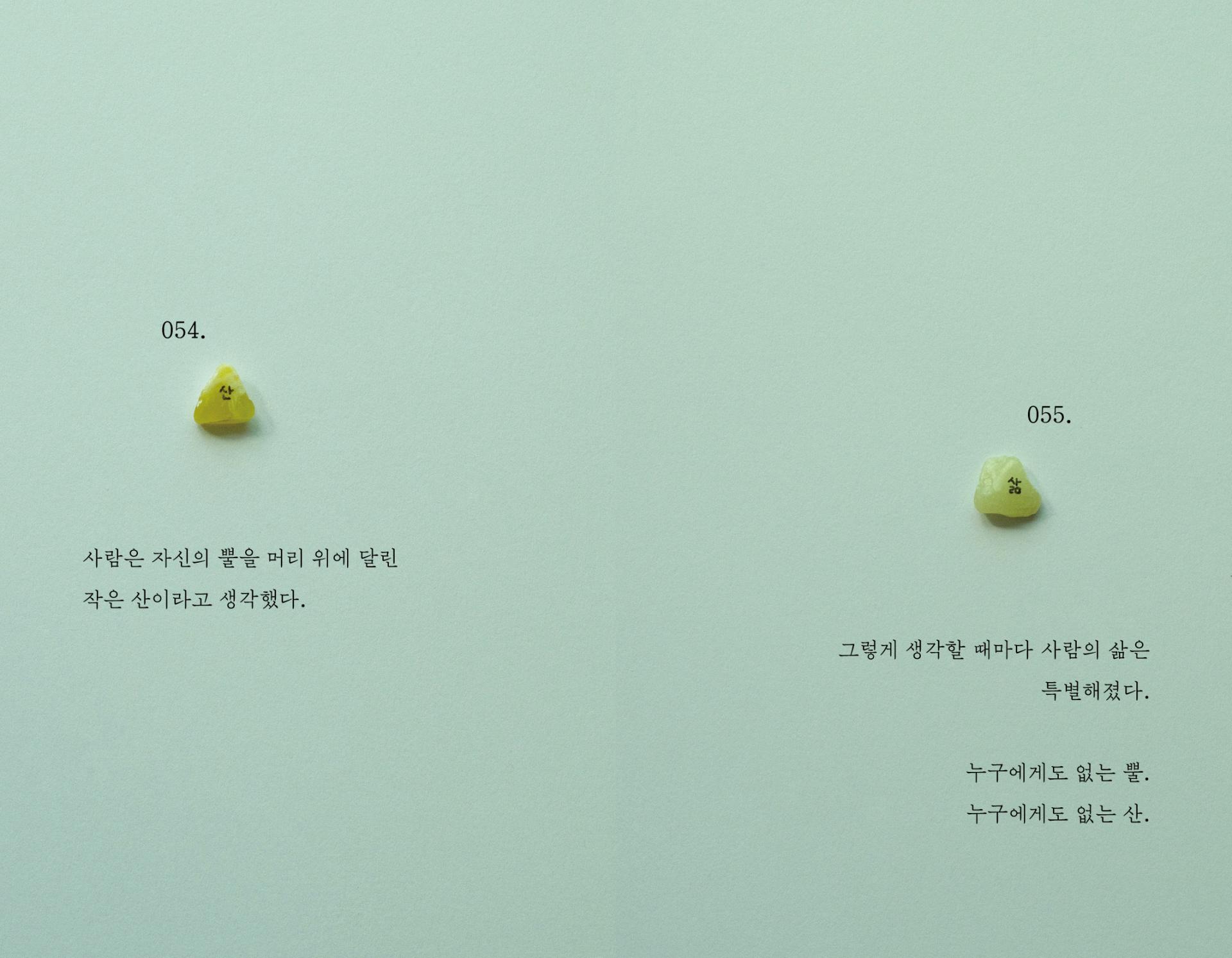 p.62 사람은 자신의 뿔을 머리 위에 달린 작은 산이라고 생각했다. 그렇게 생각할 때마다 사람의 삶은 특별해졌다. 누구에게도 없는 뿔. 누구에게도 없는 산.