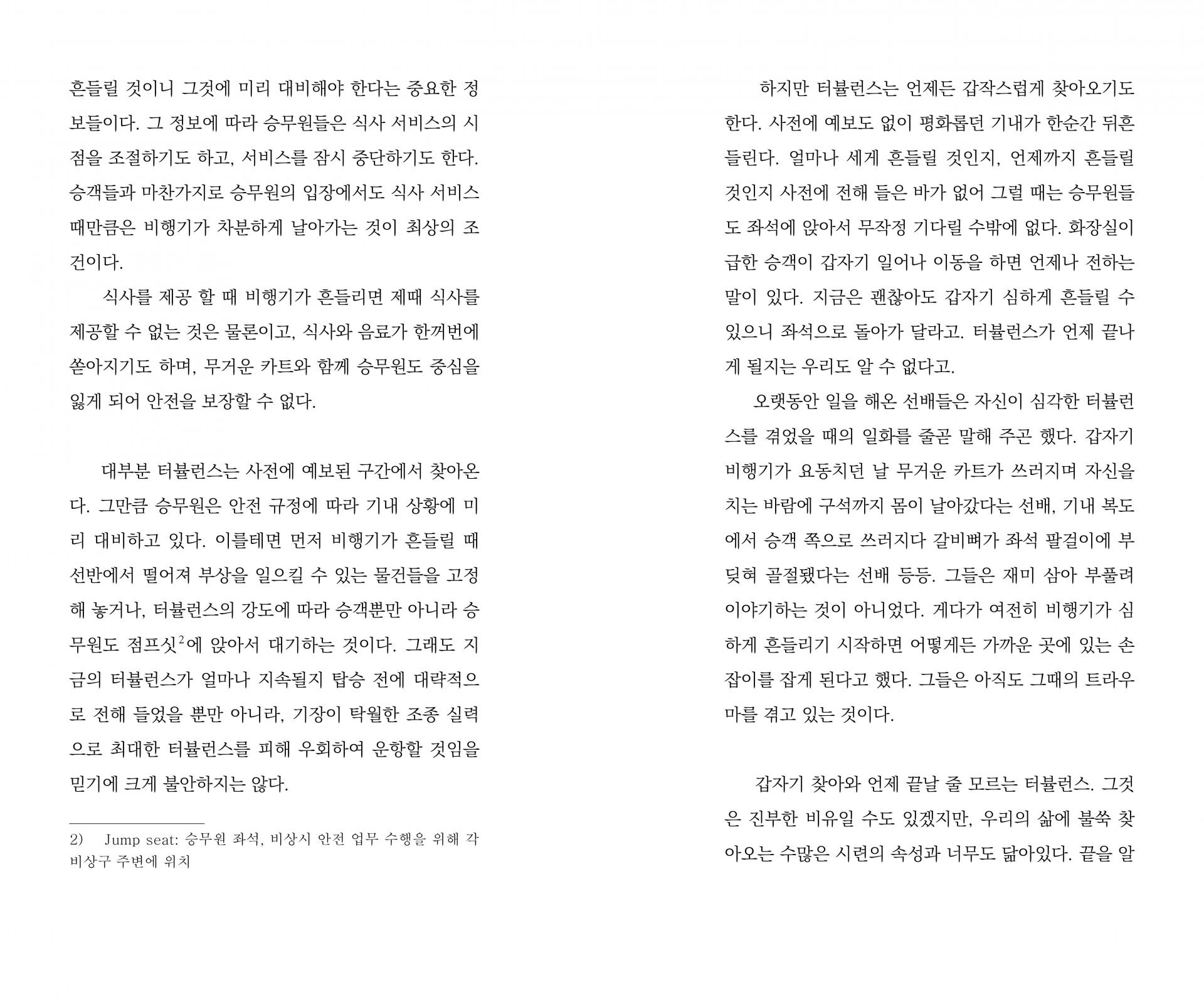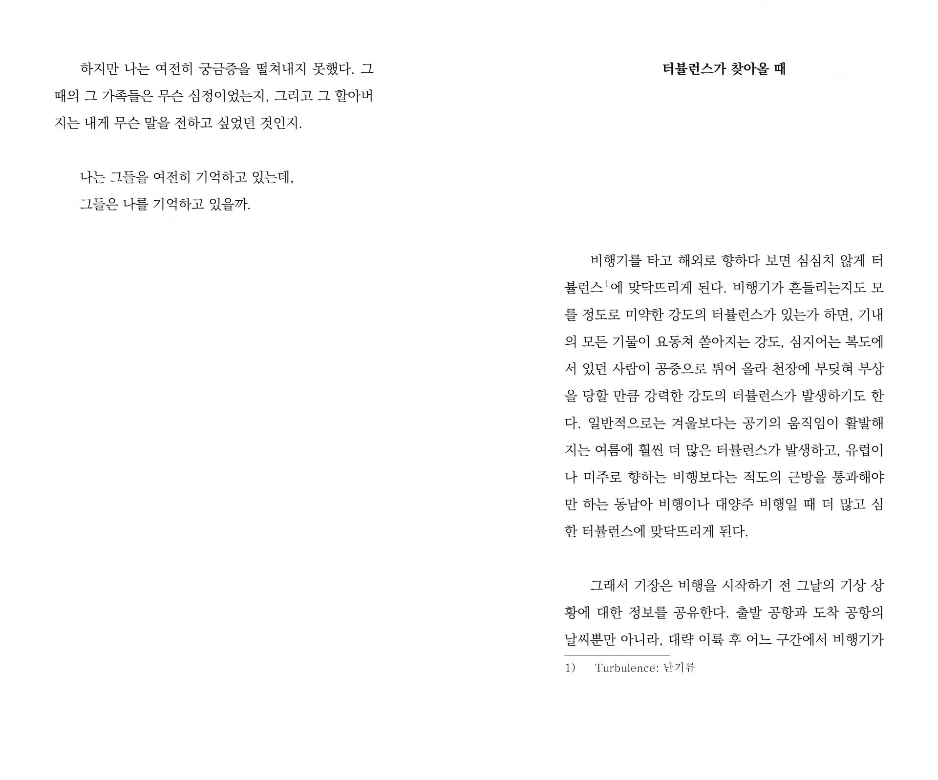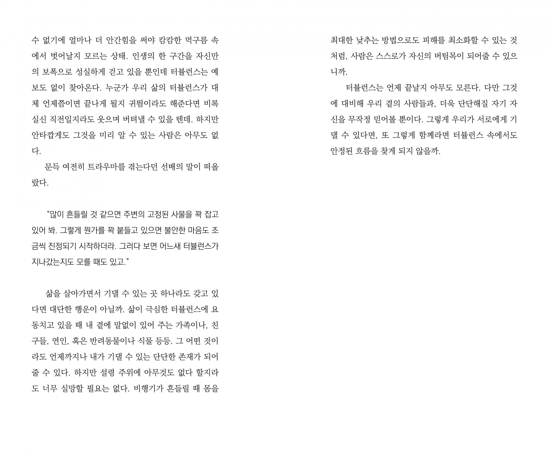 갑자기 찾아와 언제 끝날 줄 모르는 터뷸런스. 그것은 진부한 비유일 수도 있겠지만, 우리의 삶에 불쑥 찾아오는 수많은 시련의 속성과 너무도 닮아있다. 끝을 알 수 없기에 얼마나 더 안간힘을 써야 캄캄한 먹구름 속에서 벗어날지 모르는 상태. 인생의 한 구간을 자신만의 보폭으로 성실하게 걷고 있을 뿐인데 터뷸런스는 예보도 없이 찾아온다. 27p