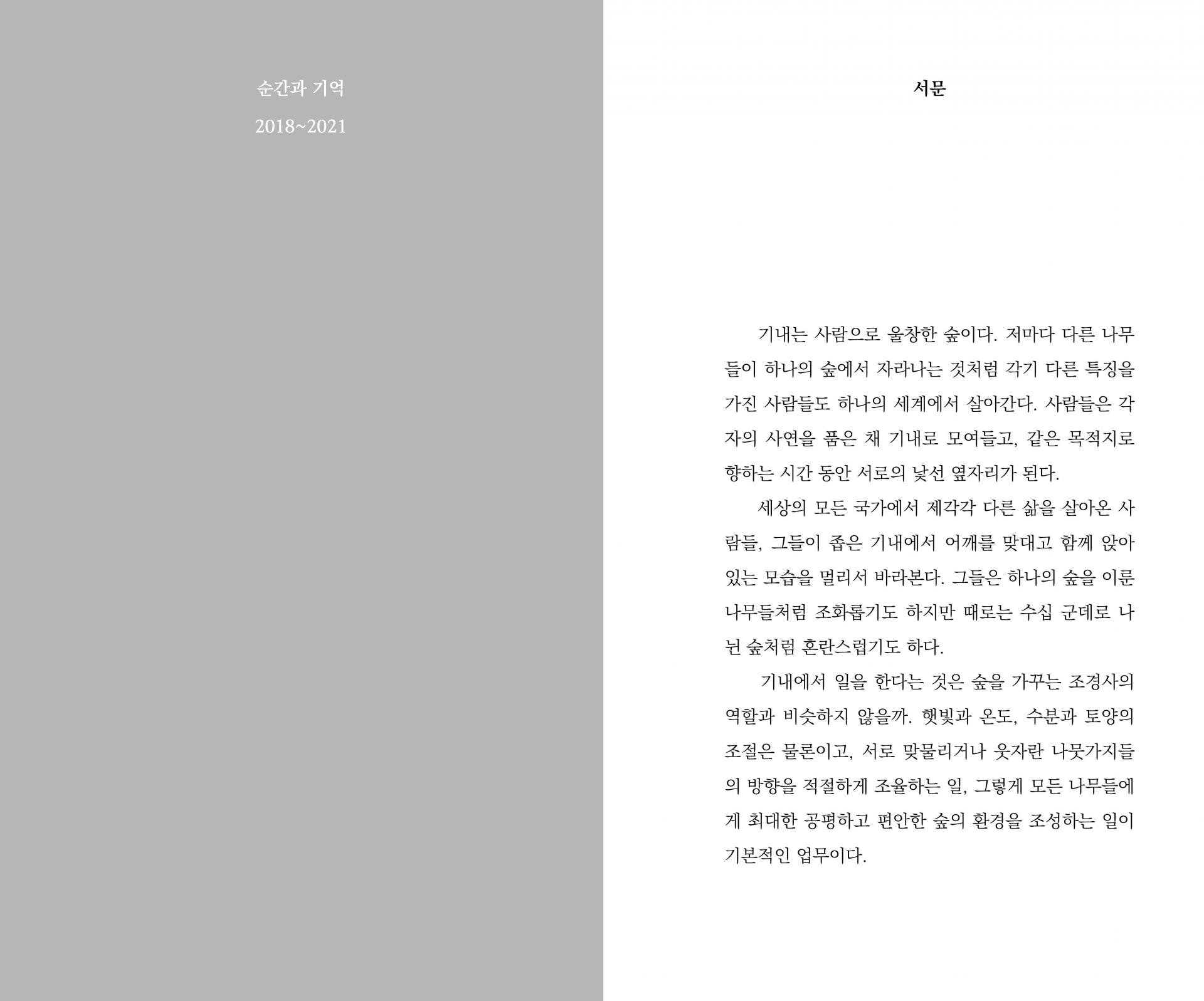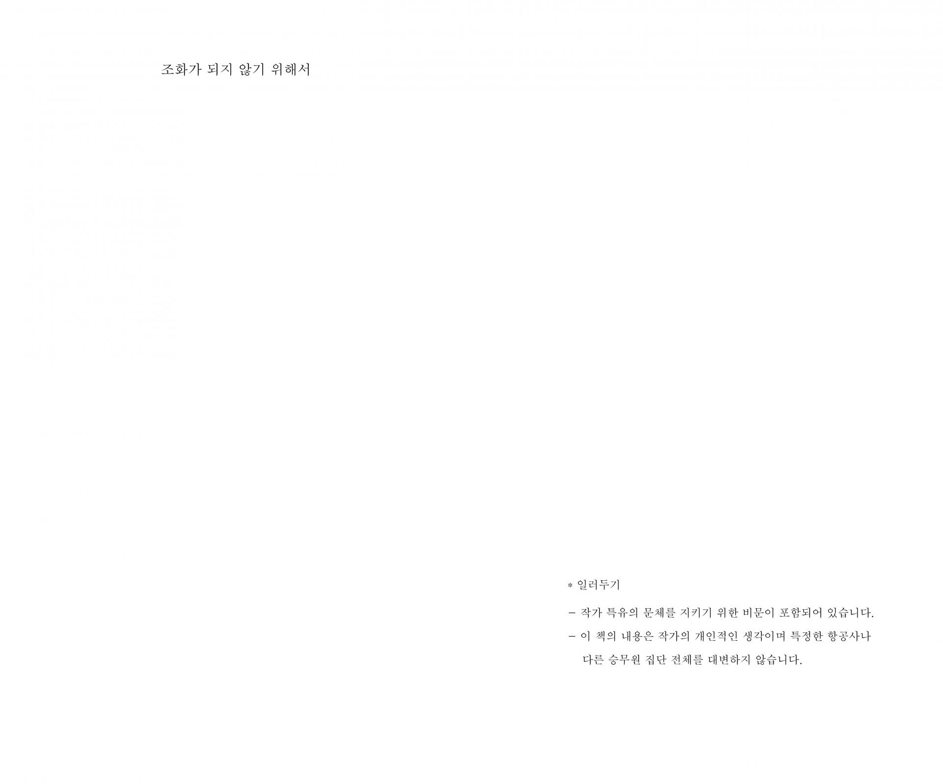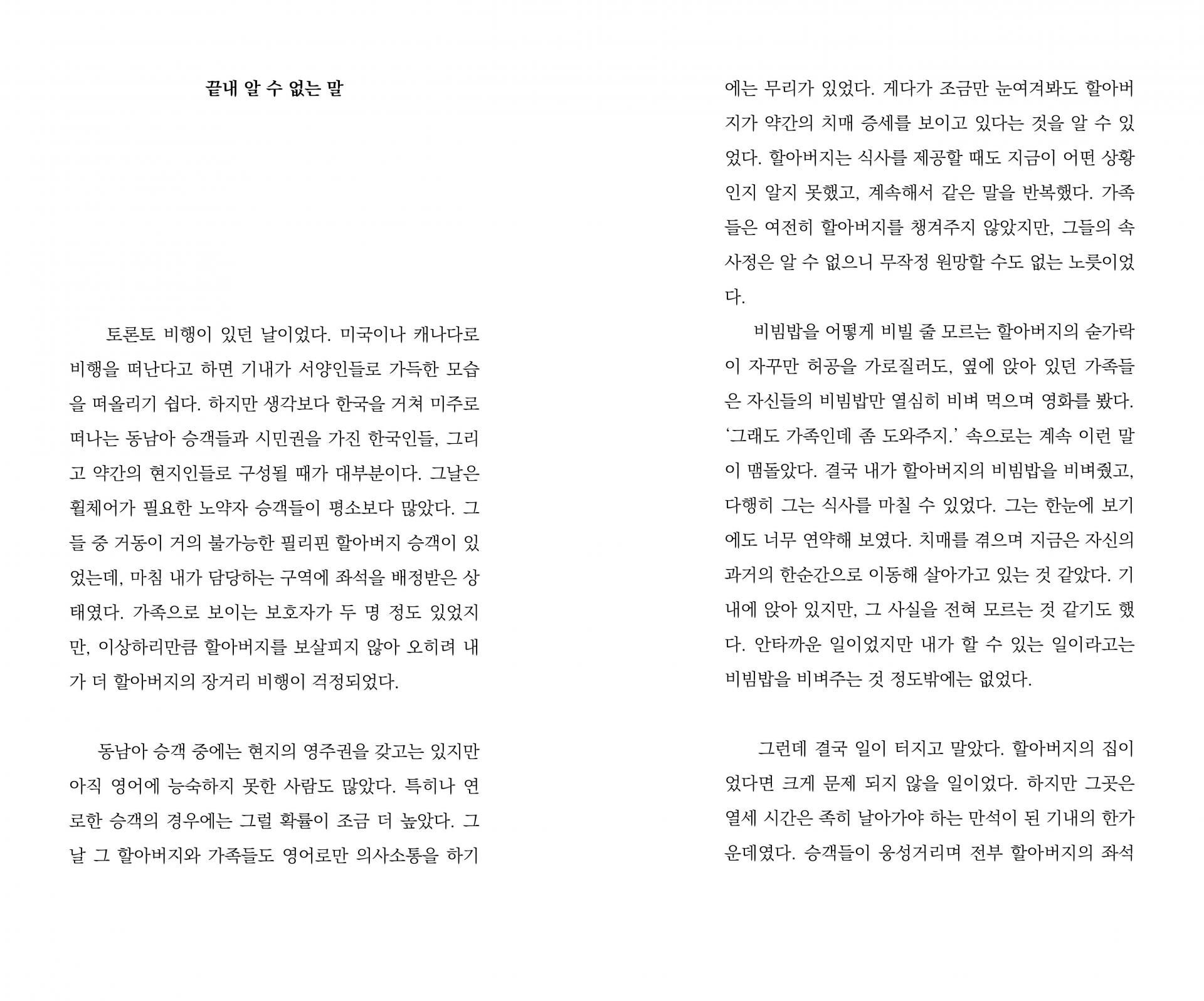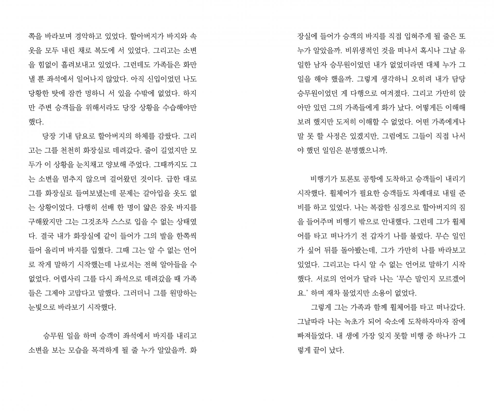 기내는 사람으로 울창한 숲이다. 저마다 다른 나무들이 하나의 숲에서 자라나는 것처럼 각기 다른 특징을 가진 사람들도 하나의 세계에서 살아간다. 사람들은 각자의 사연을 품은 채 기내로 모여들고, 같은 목적지로 향하는 시간 동안 서로의 낯선 옆자리가 된다. 7p