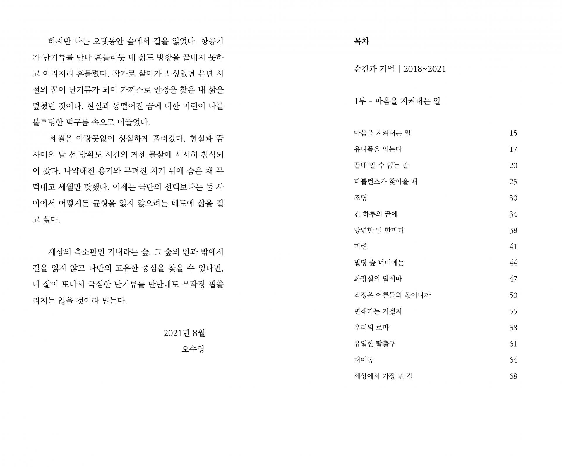 나는 오랫동안 숲에서 길을 잃었다. 항공기가 난기류를 만나 흔들리듯 내 삶도 방황을 끝내지 못하고 이리저리 흔들렸다. 작가로 살아가고 싶었던 유년 시절의 꿈이 난기류가 되어 가까스로 안정을 찾은 내 삶을 덮쳤던 것이다. 현실과 동떨어진 꿈에 대한 미련이 나를 불투명한 먹구름 속으로 이끌었다. 세상의 축소판인 기내라는 숲. 그 숲의 안과 밖에서 길을 잃지 않고 나만의 고유한 중심을 찾을 수 있다면, 내 삶이 또다시 극심한 난기류를 만난대도 무작정 휩쓸리지는 않을 것이라 믿는다.