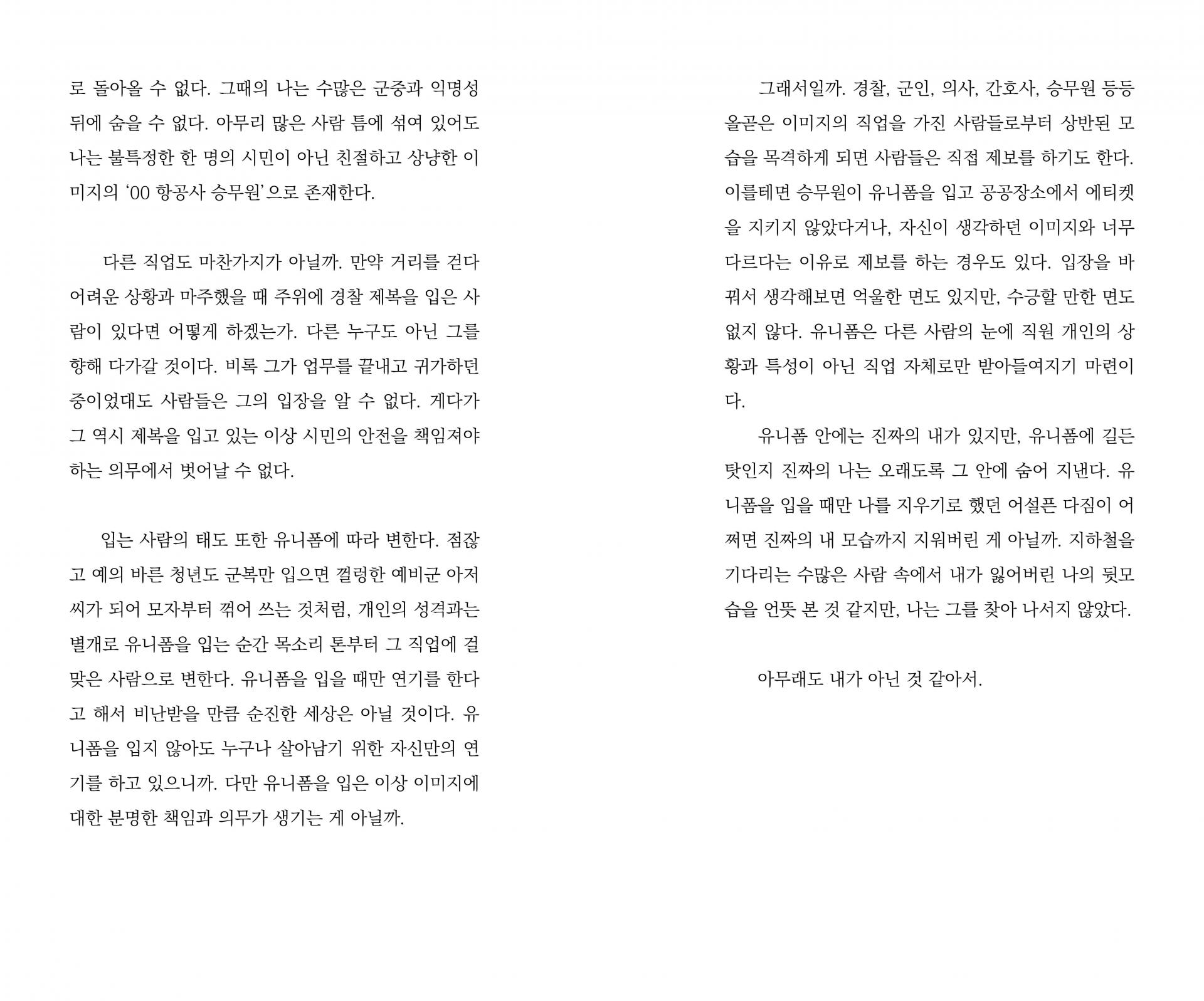 삶을 이루는 다양한 장면들도 언뜻 보면 모두 별개이지만, 품고 있는 목표가 같다면 결국은 하나의 이야기처럼 연결되지 않을까. 거창한 꿈은 아닐지라도 일상에서 결코 놓을 수 없는 오랜 취미나 습관 같은 것들이 사람의 생각과 행동, 그리고 선택의 방향에 깊숙이 관여한다면 삶의 끝에는 비슷한 장면들로 편집된 결말이 기다리고 있을 것이라 믿는다. 42p