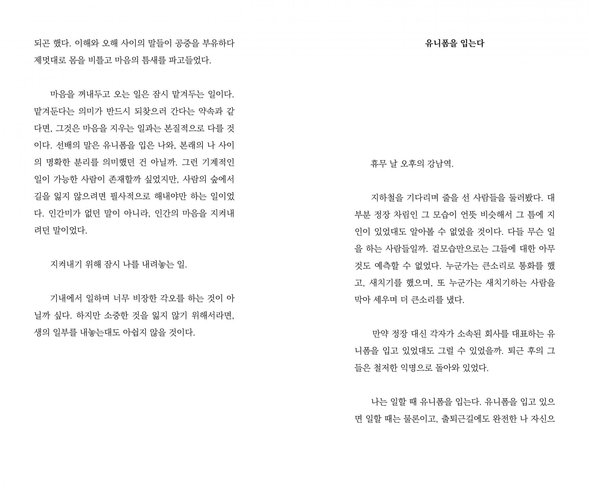출근할 때는 잊지 말고 마음을 꺼내어 이불 속에 꼭꼭 숨겨두고 나오세요. 애초부터 마음이라는 게 없었던 사람처럼. 그래야 사람들에게 상처받지 않을 수 있어요. 15p