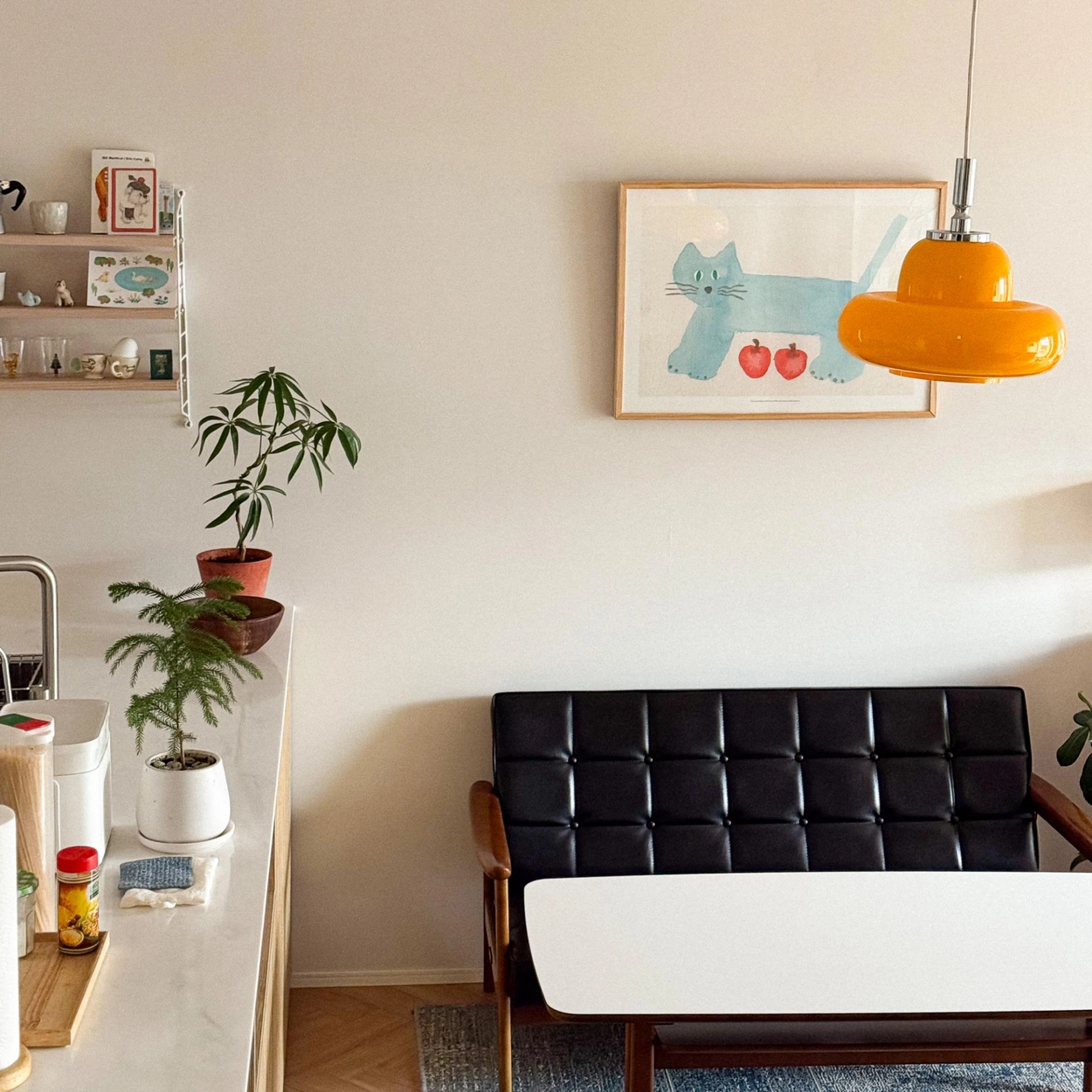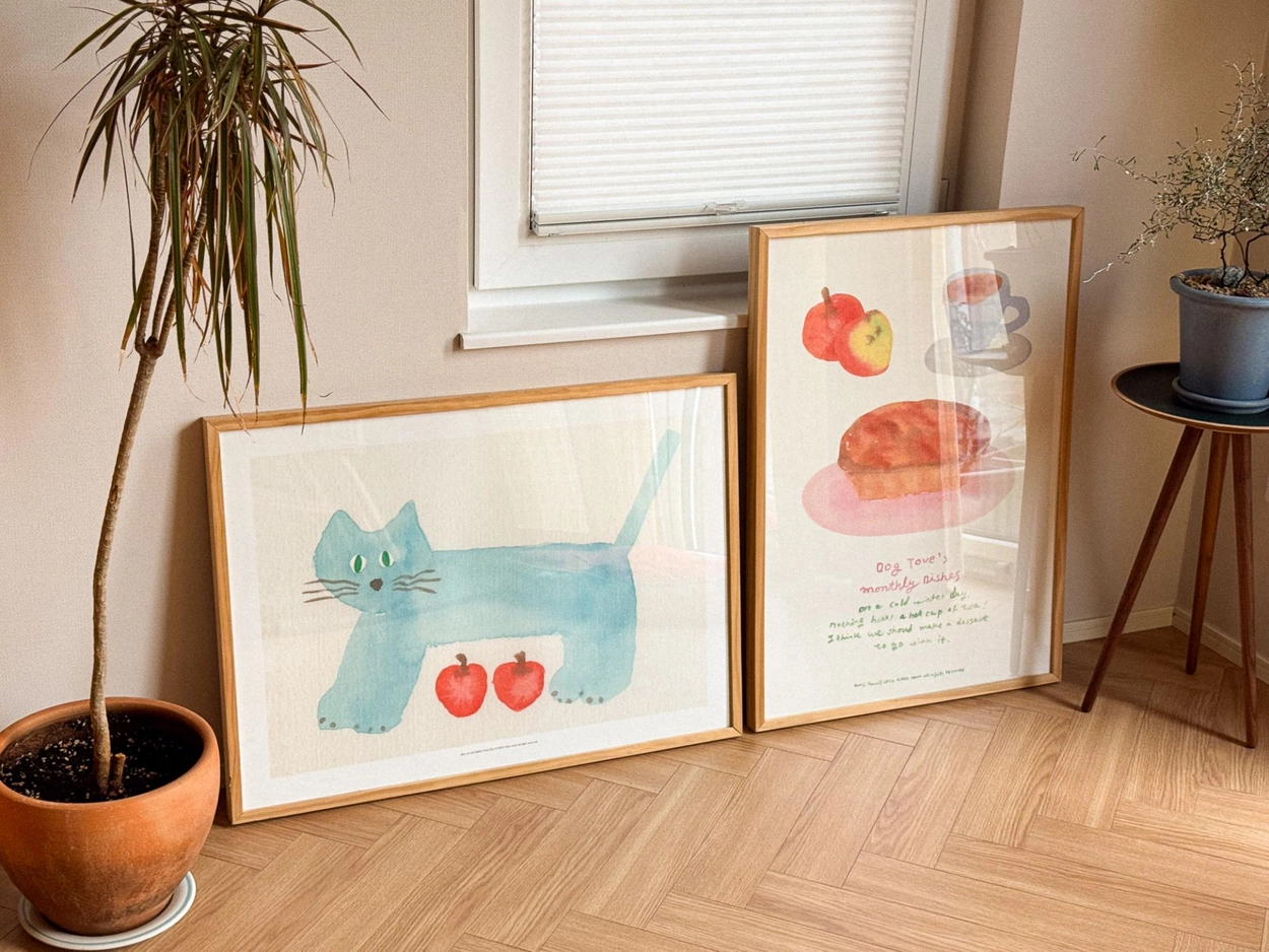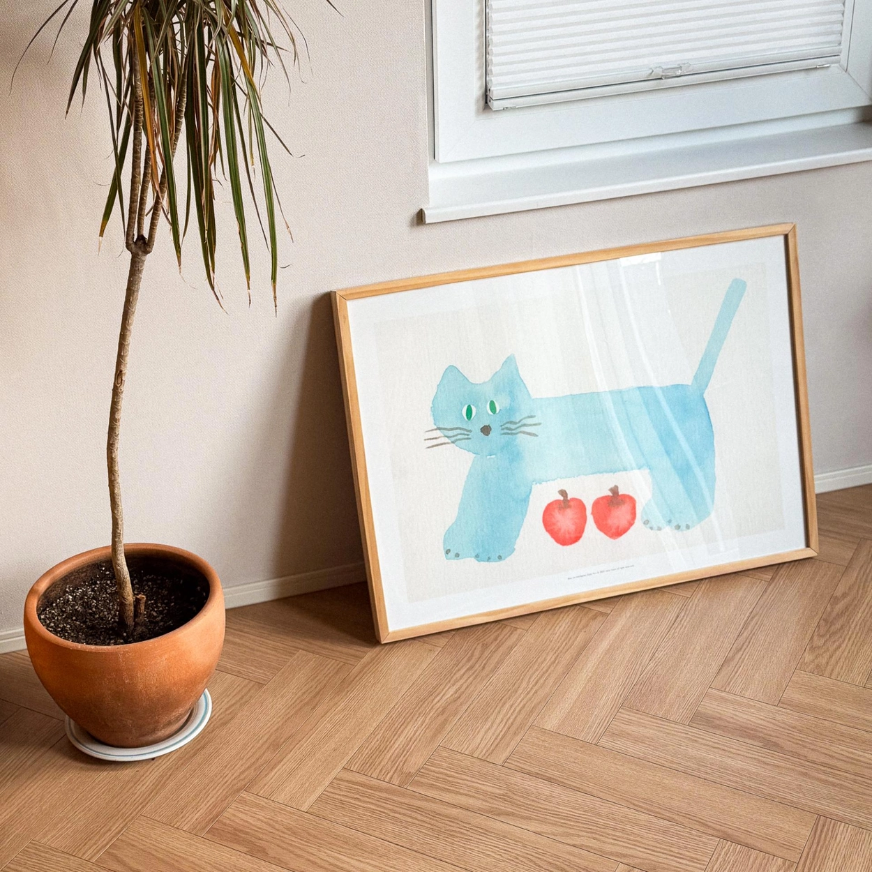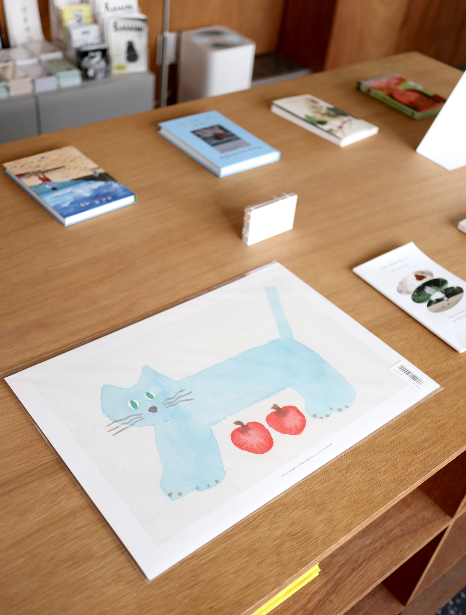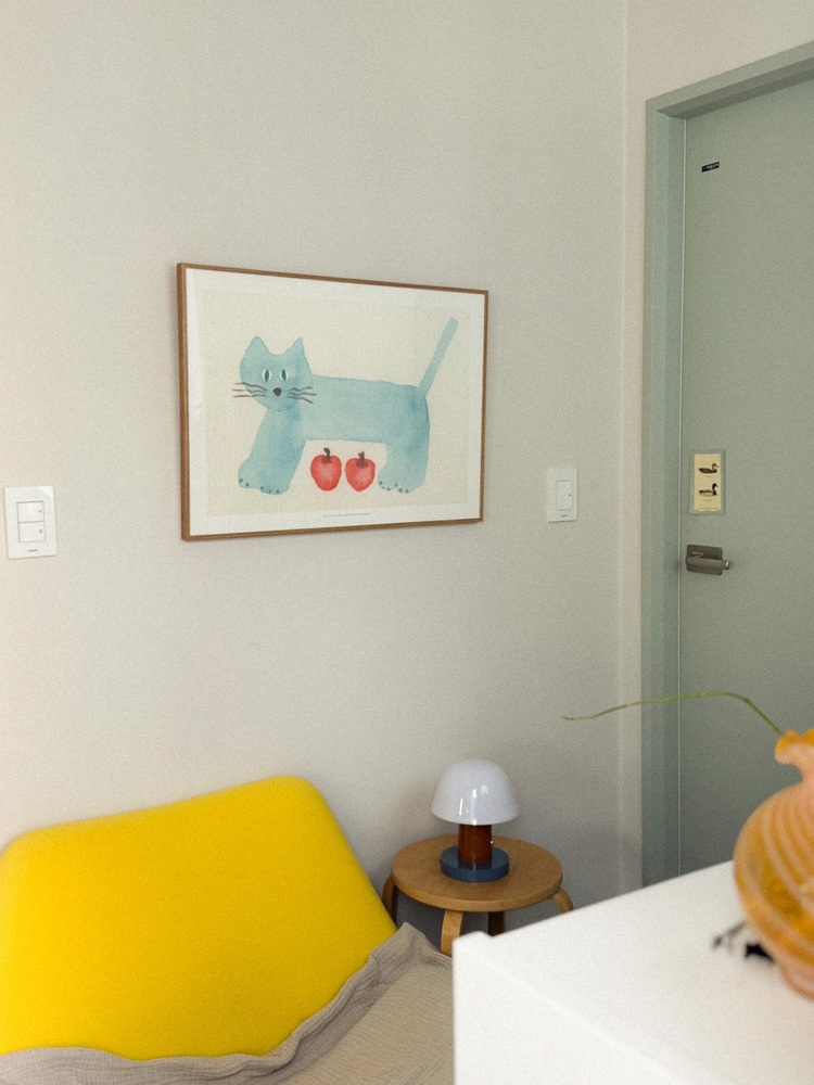 사과를 숨긴 파란 고양이 A3 포스터입니다. 두꺼운 골판지가 덧대어져 있어 벽에 기대어 놓고 사용할 수 있습니다.