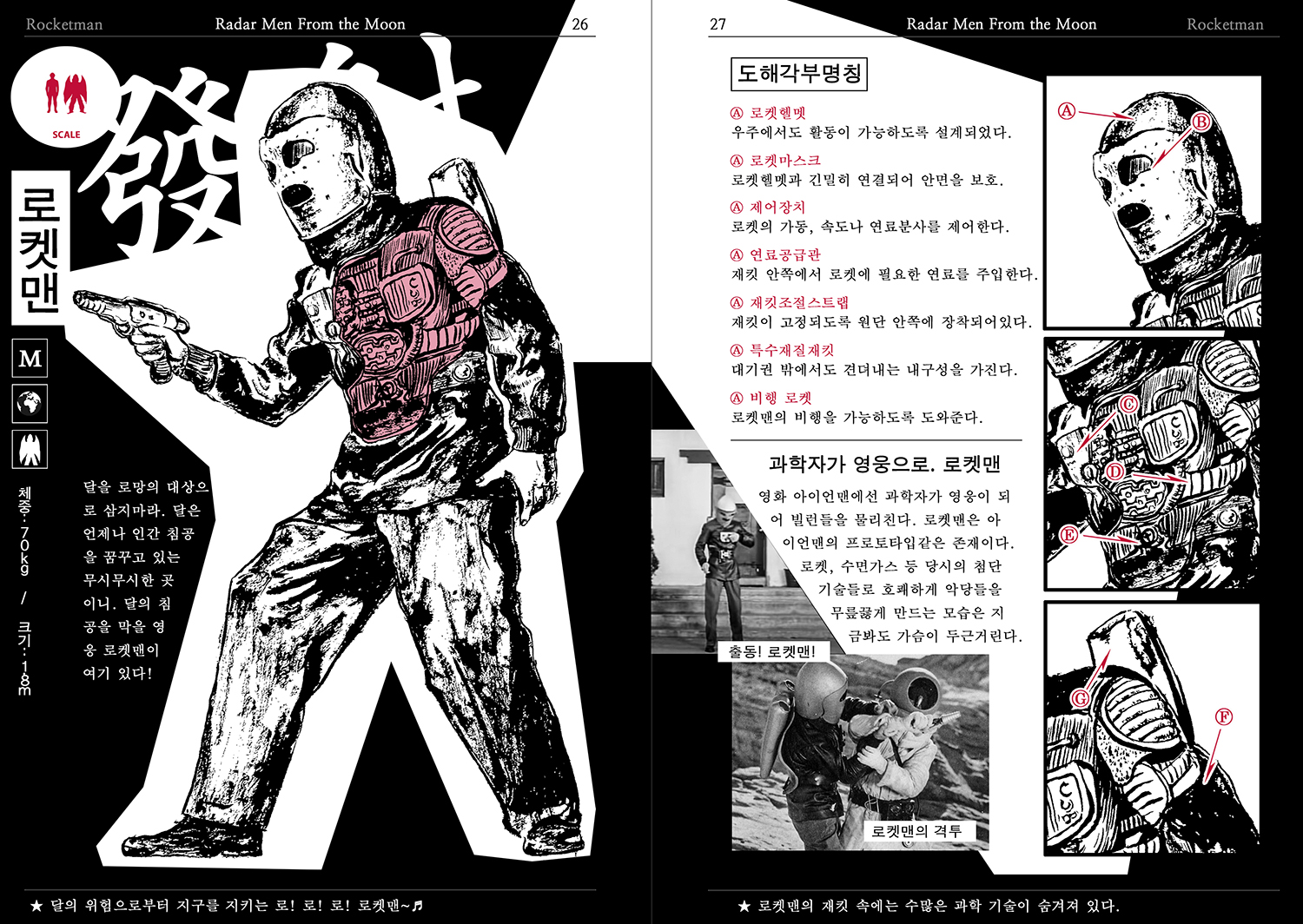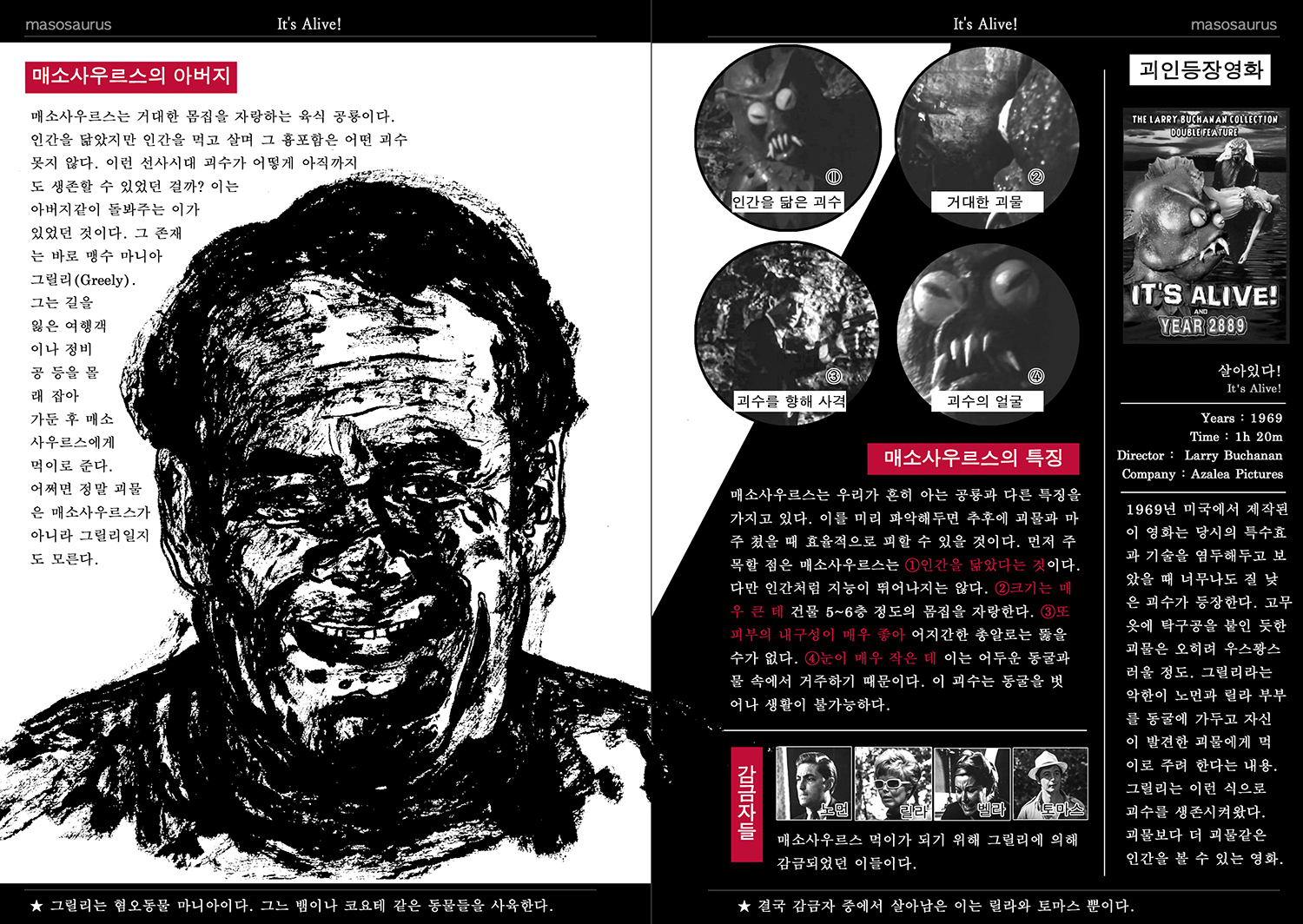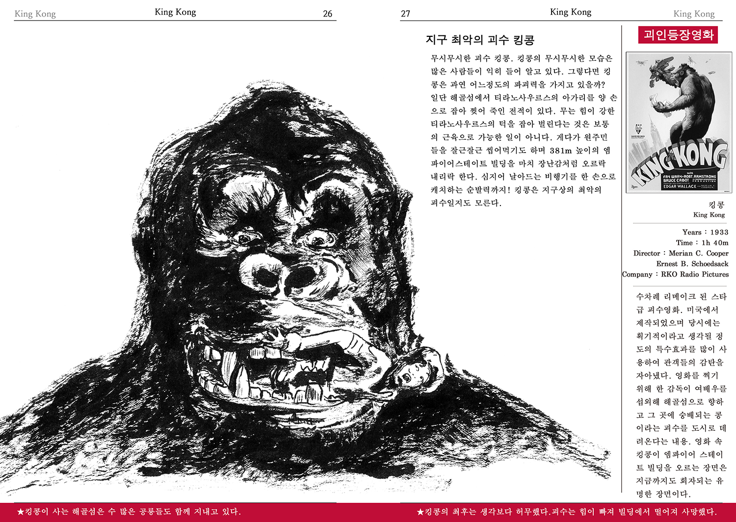 서적의 상세 페이지에는 괴물의 성격이나 습성, 사는 곳 등 다양한 정보들이 수록됩니다. 단순한 괴물 정보뿐 아니라 피해를 본 피해자, 괴인이 사는 성, 등장하는 잠수함, 맞서는 인간, 사용하는 무기 등 각 영화에 맞게 다양한 레이아웃을 적용하였습니다. 또 중간중간 등장하는 미니게임 페이지들은 무시무시한 괴물들을 퇴치하는 가상체험을 하게 해줄 것입니다.