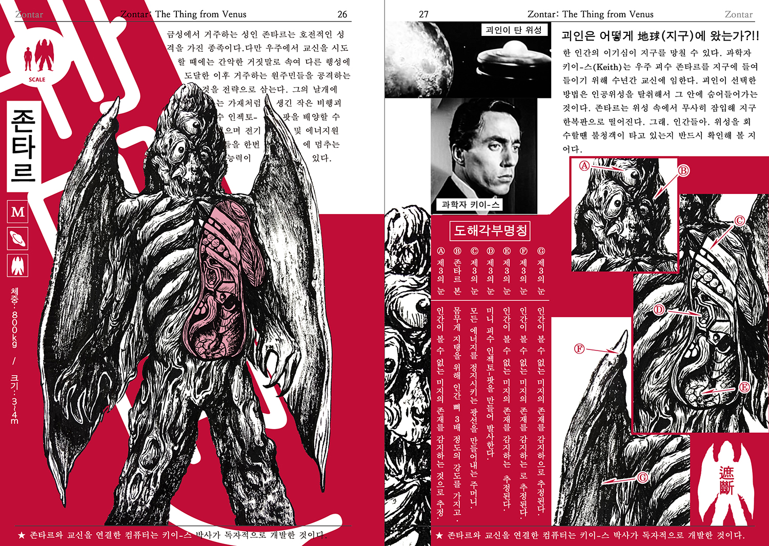 도해백과라는 이름에 걸맞게 본 서적에는 각 괴물의 해부도가 실려있으며 특징, 기술, 관련 내용 등이 기록되어 있습니다. ①괴수(괴인)의 크기 및 이름, 체중 ②괴수(괴인) 해부도 ③각 신체 파트별 설명 ④괴수(괴인)의 짧은 소개 ⑤개요가 알기 쉽게 수록되죠. 해부 단면은 일러스트 안에서 붉은 영역으로 표시되기에 어떠한 부분에 초점을 맞춰 괴물들을 해석했는지 확실하게 알 수 있습니다. 또 모든 페이지는 괴물에 맞게 다르게 디자인되어 읽다 보면 영화 속 괴물들에게 정감을 느낄 수 있을 것입니다.