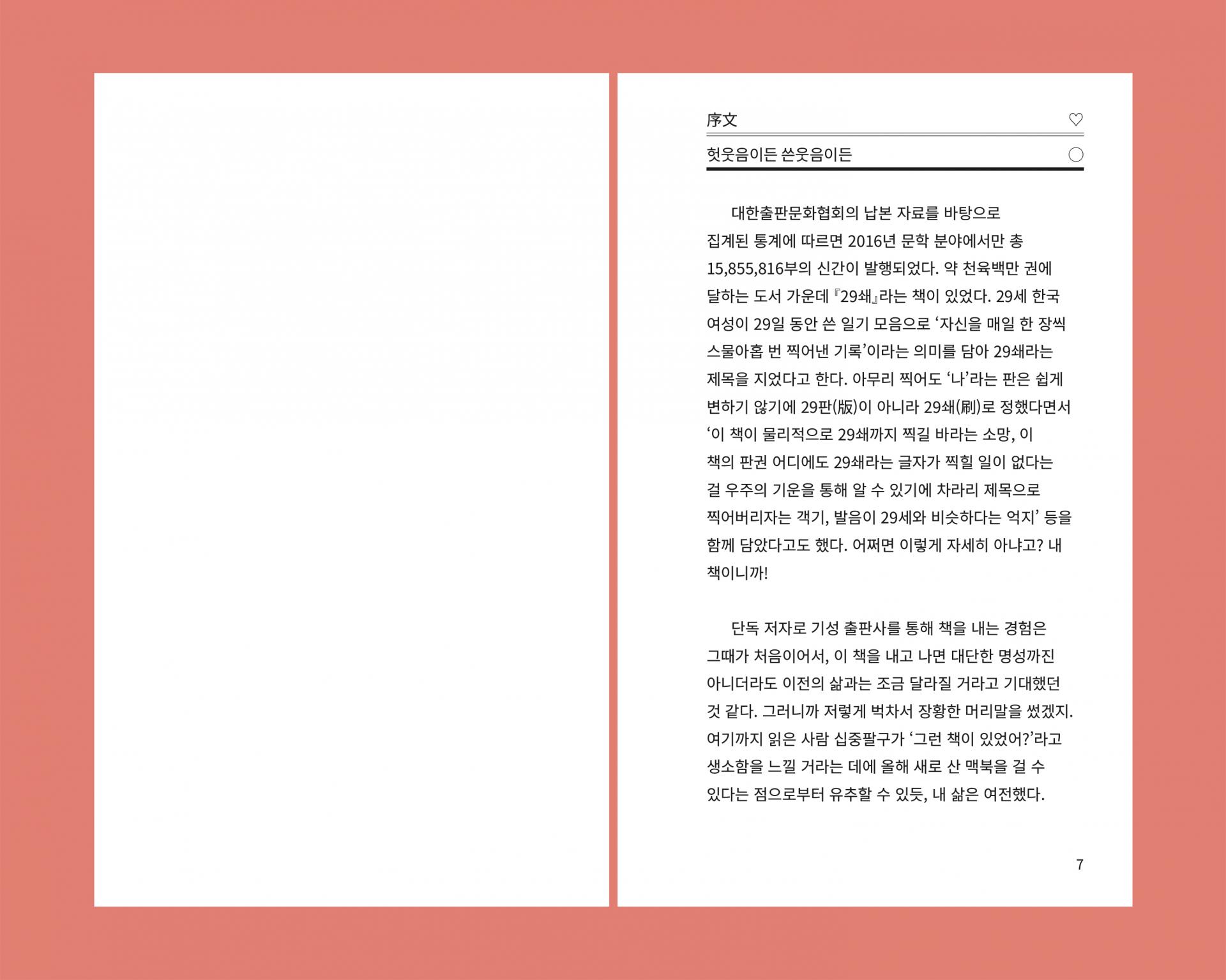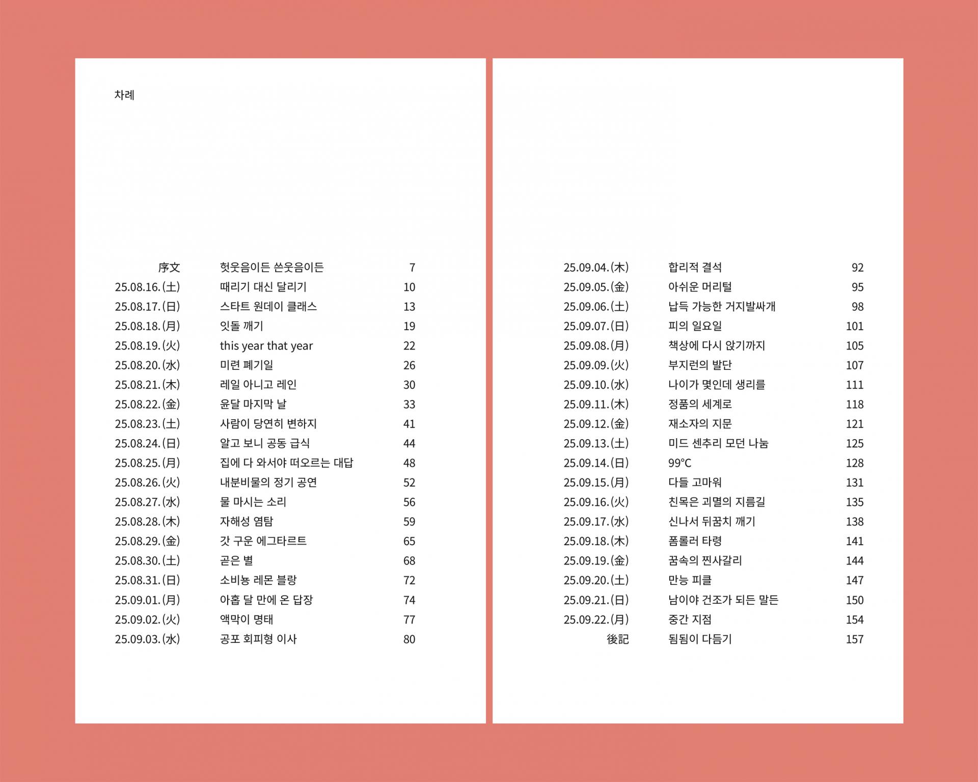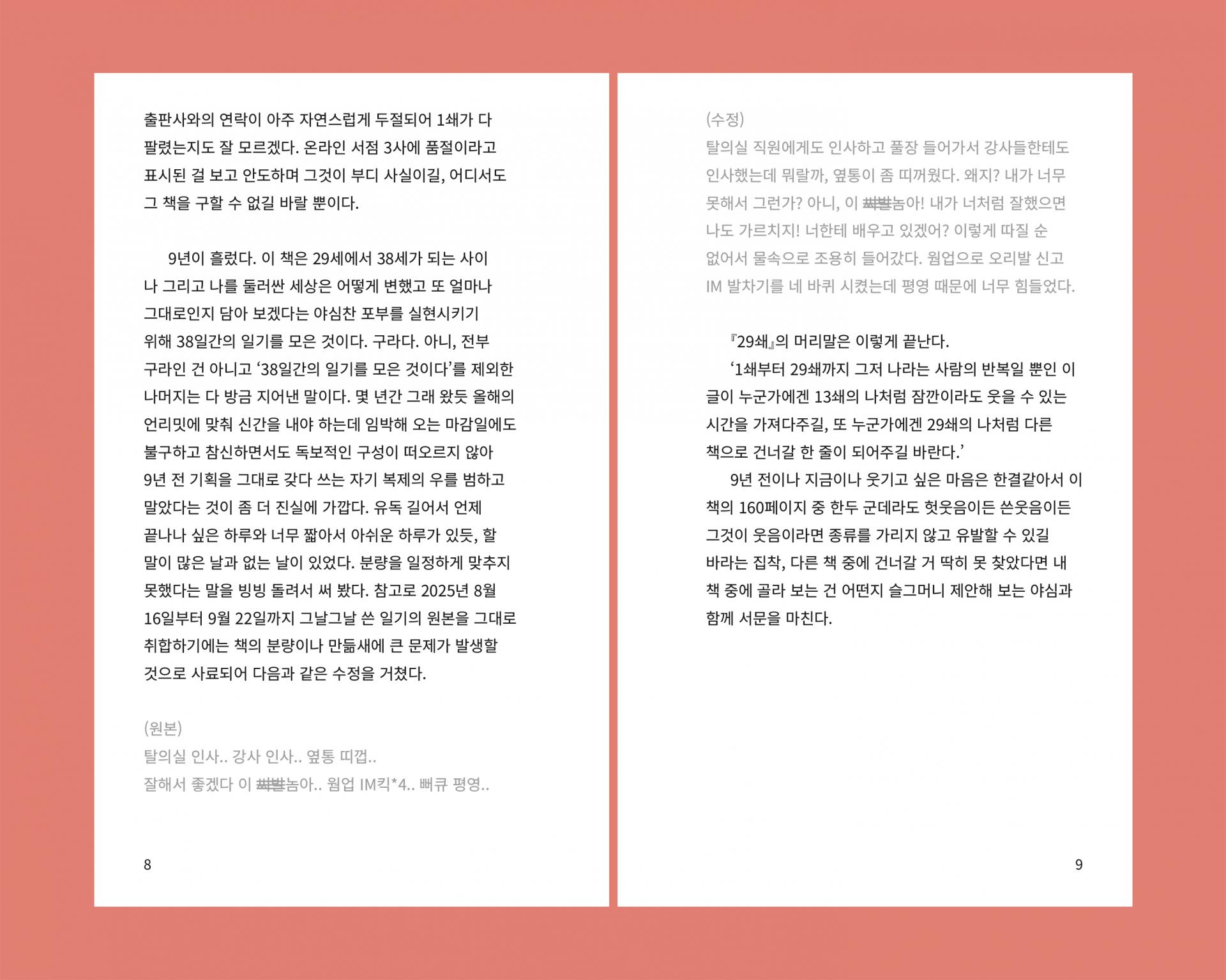 2016년에 발행되었던 29편의 일기 모음집은 등장만큼 소리 소문 없이 모습을 감췄다. 새로운 작업에 대해 마땅한 아이디어를 떠올리지 못하자 9년 전 기획을 고스란히 가져다 쓴 이번 책의 후기에서 저자는 ‘29살의 내가 남보다 더 멀게’ 느껴졌다고 고백한다. 지금으로부터 9년 뒤에도 같은 기획의 책을 내는 것으로 어리석은 결정을 반복하며 다시금 과거의 자신과 선을 긋고 싶어 할 저자에게 “나는 당신의 9년 전 일기를 알고 있다. 어쩌면 18년 전까지도….”라며 다정하면서도 뼈 있는 인사를 건넬 독자를 모집한다.
